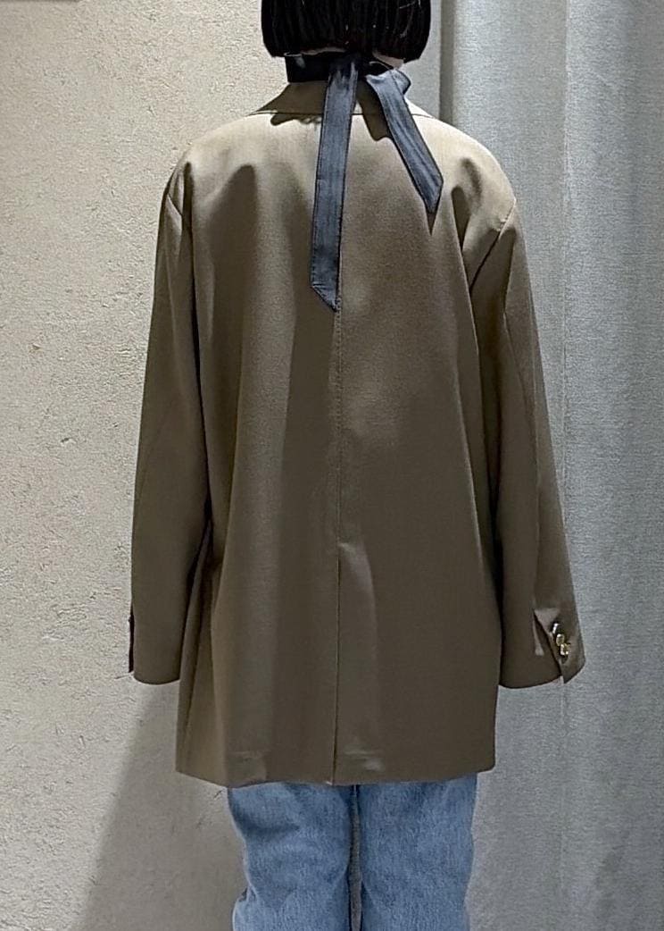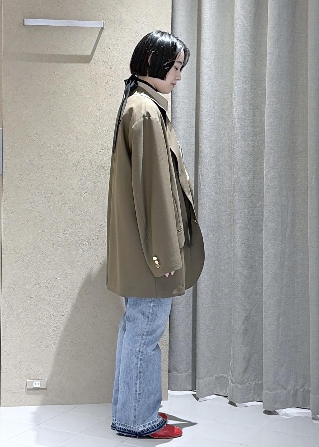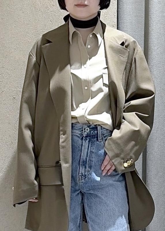 ヒップもがっつり隠れる丈でジャケットコートのような印象です。袖は早速に向かって少し広がるようなシルエットで肩がしっかりあるのでジャケットですがモードになりすぎず合わせていただけると思います。