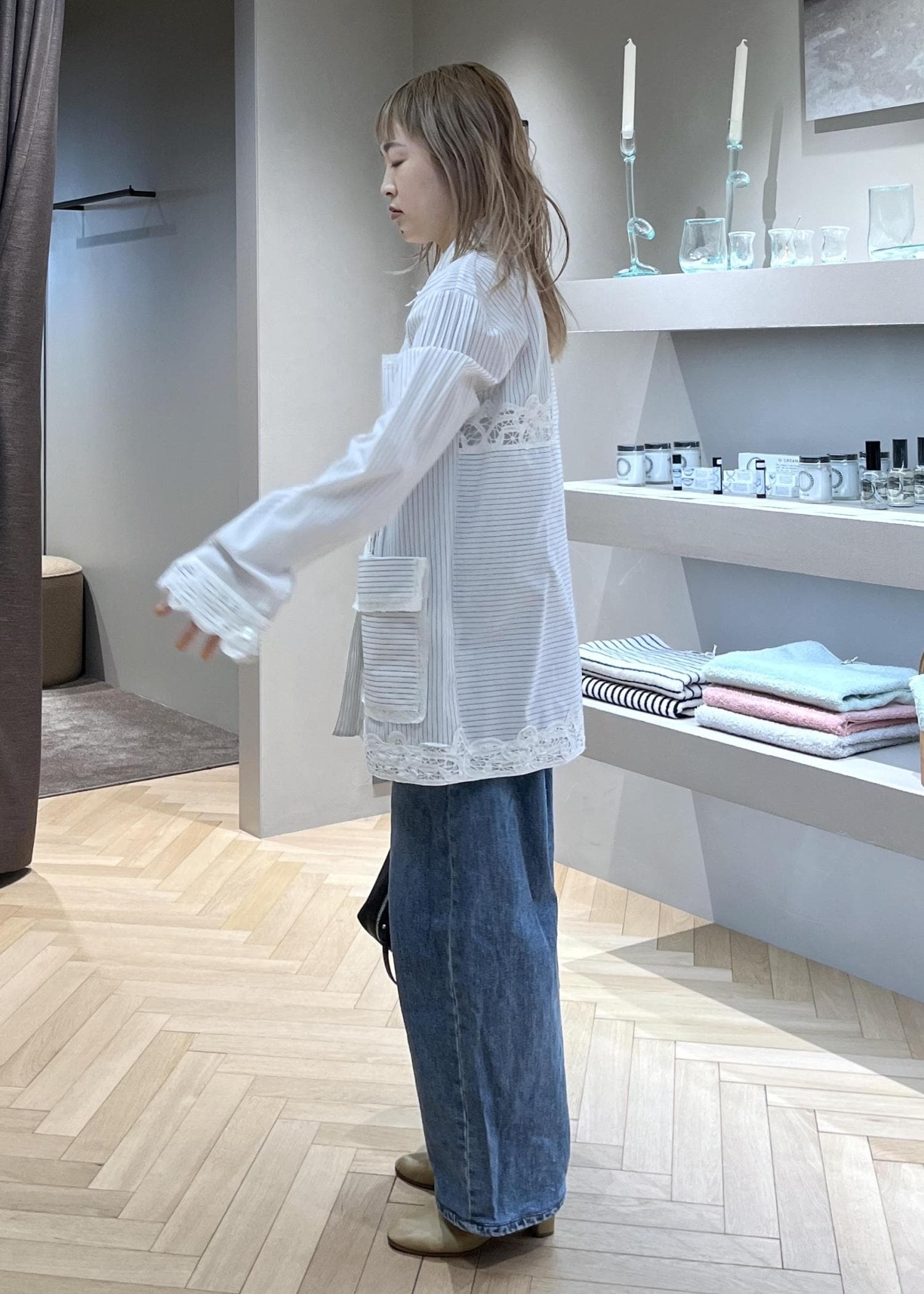 丈はお尻がしっかり隠れるくらいなので、シャツ生地ですがジャケット感覚で羽織っても◎。 -