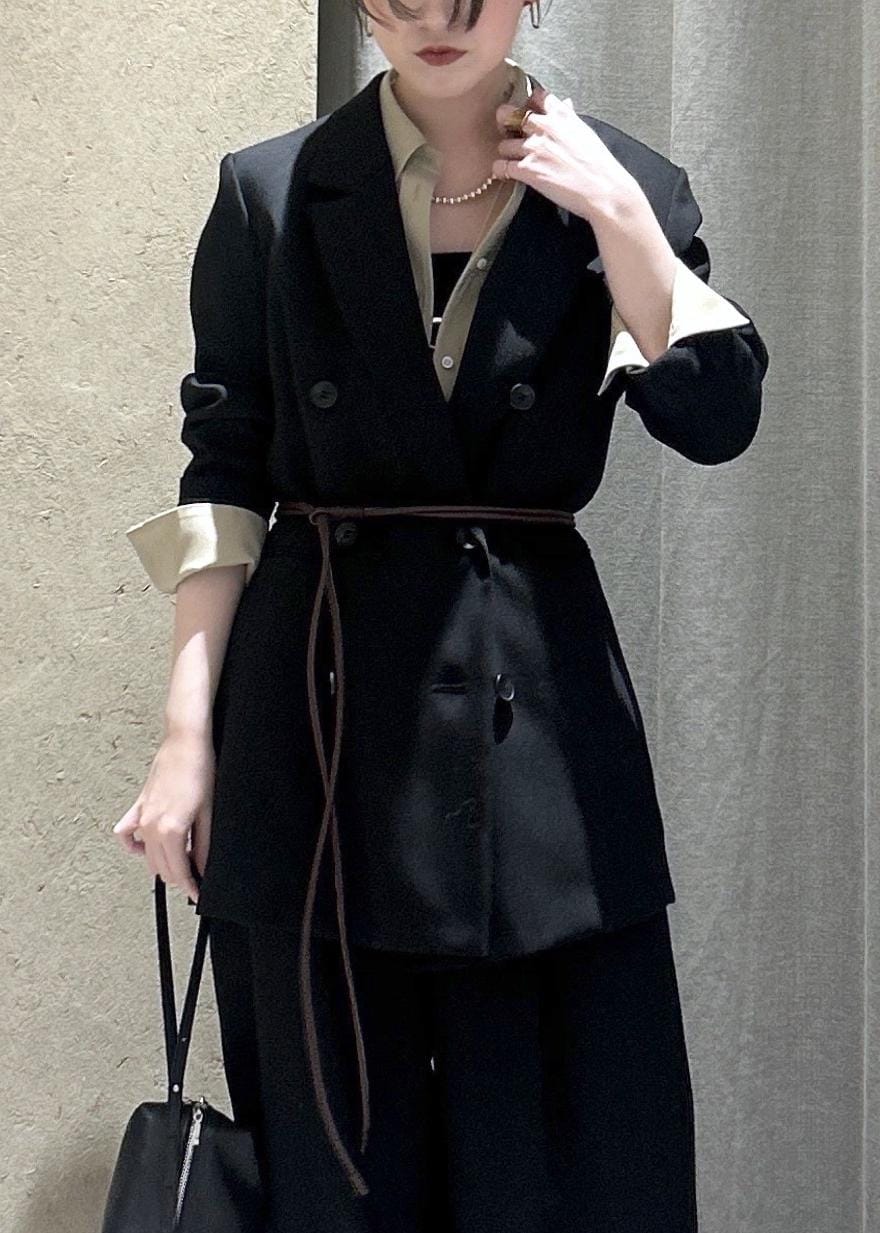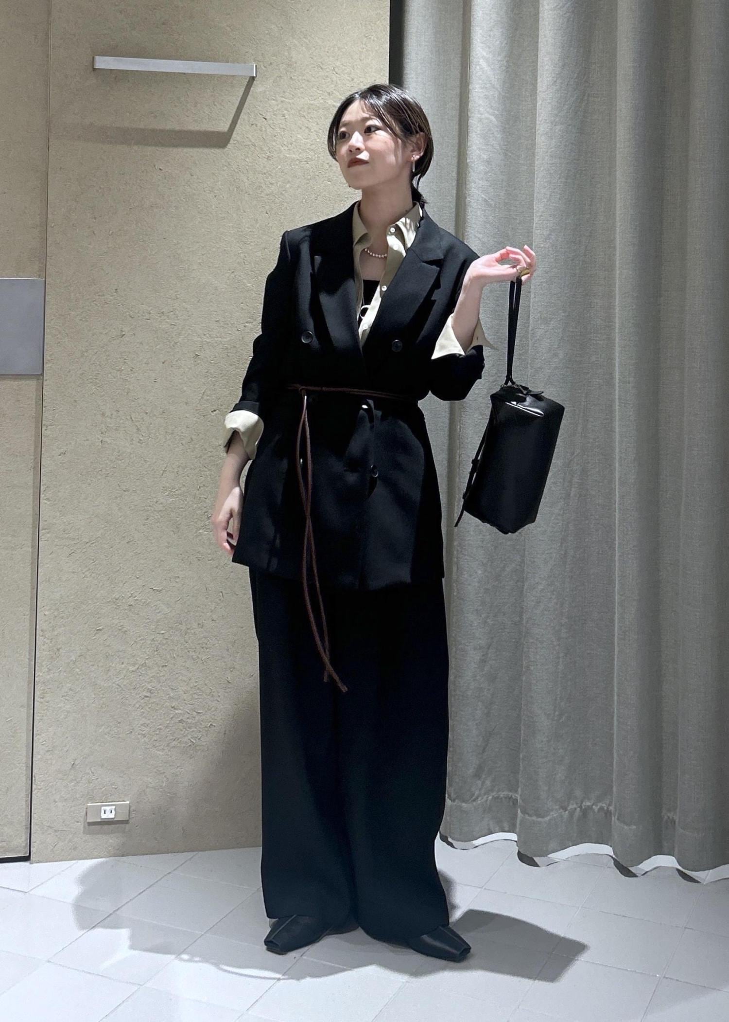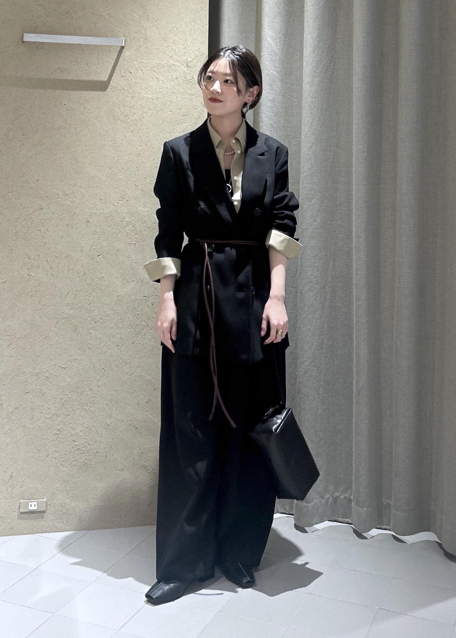 シャツ合わせでマニッシュなスタイリングなので、ジャケットの上からベルトを締めて女性らしいペプラムシルエットを少し意識してみました。