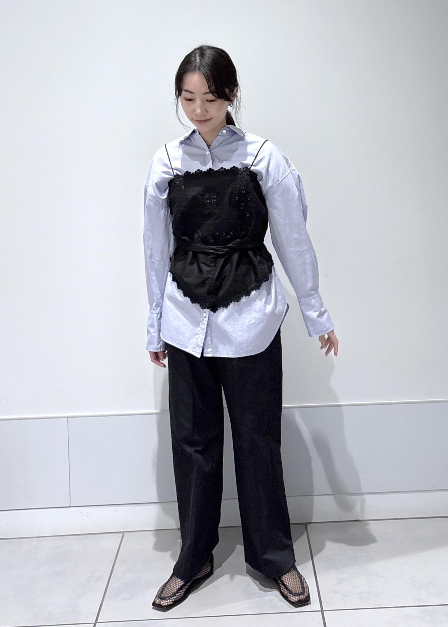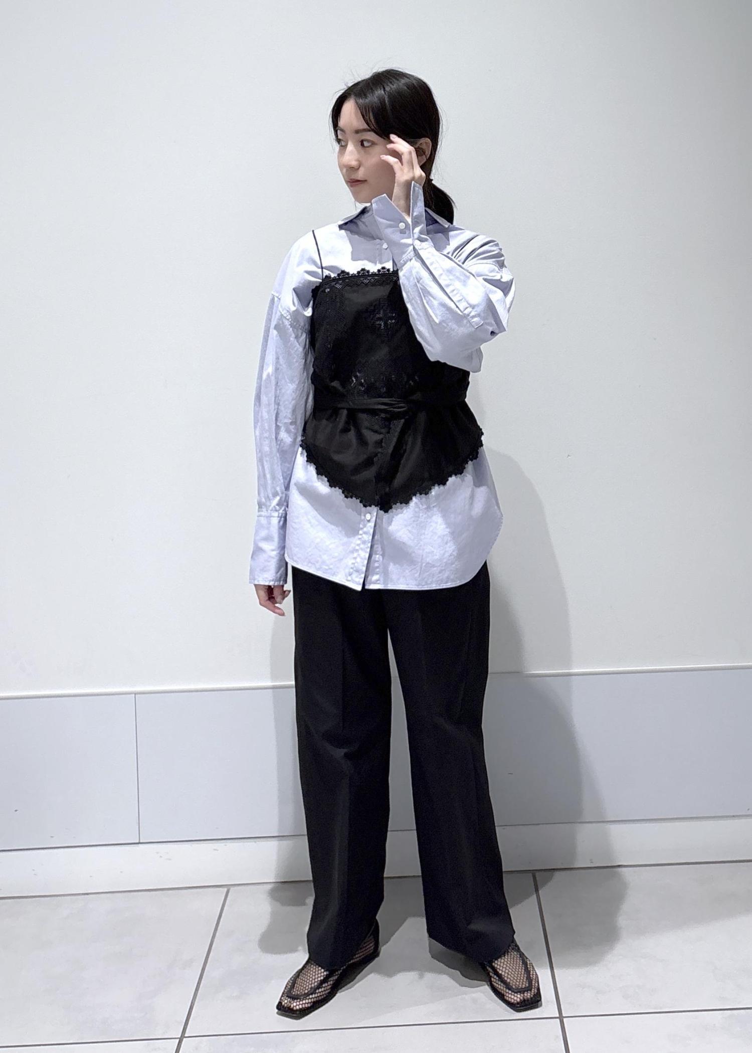 シンプルなシャツにレースビスチェをレイヤードし、シンプルながらも女性らしさをプラスしました。足元は程よく抜け感のあるシューズを合わせることで、エフォートレスで洗練された雰囲気にしました。
