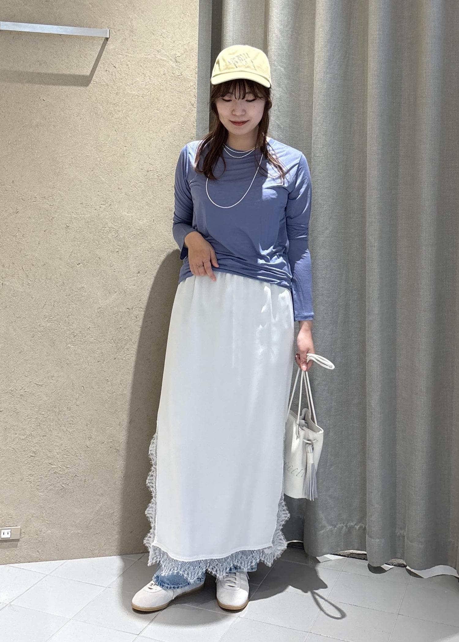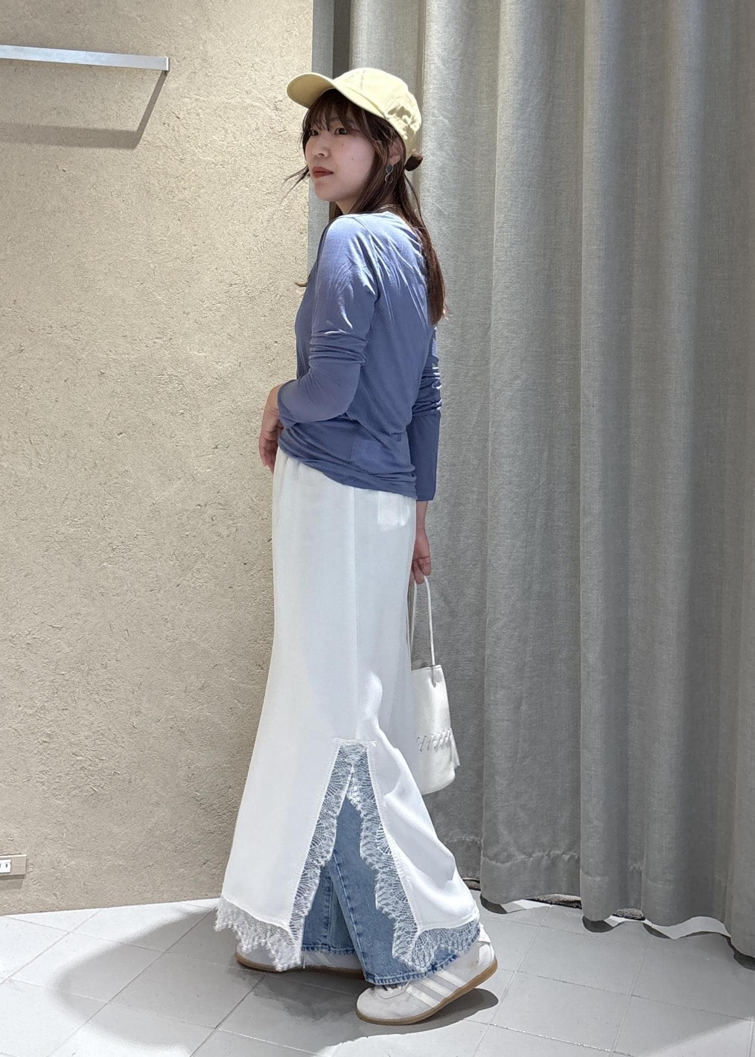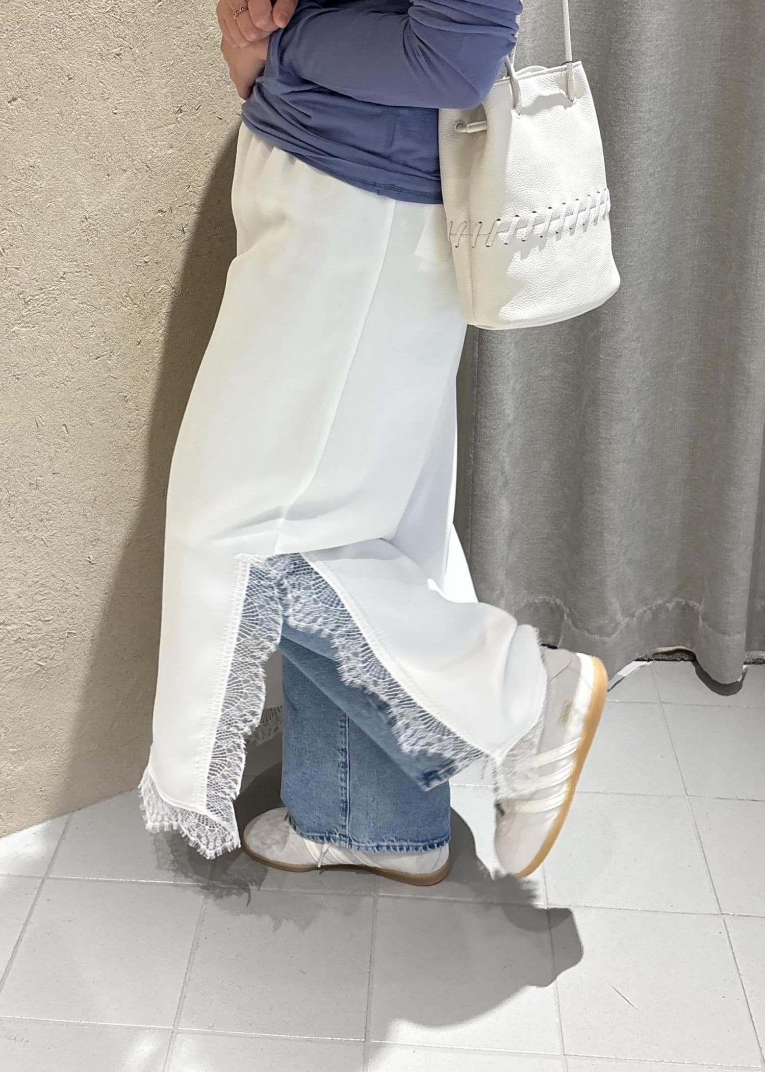 スニーカーにデニムとカジュアルな格好でも、レースのスカートを合わせると一気に可愛く華やかになりますね。