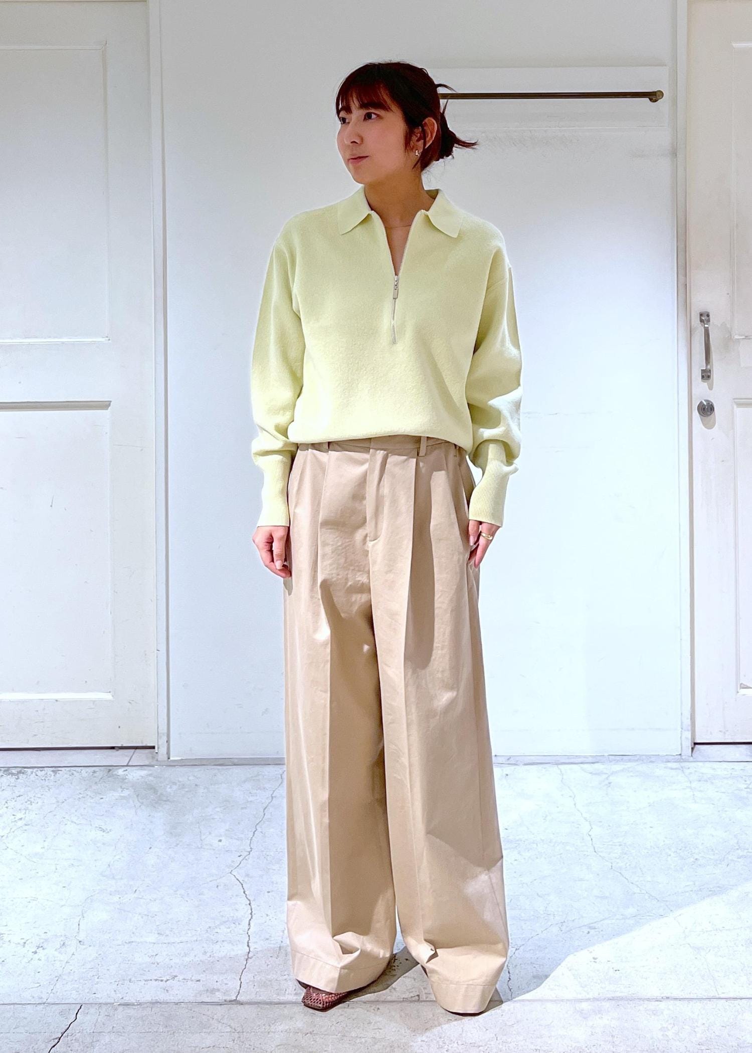 寒い日もありますが、春を意識してトップスは明るいグリーンに!