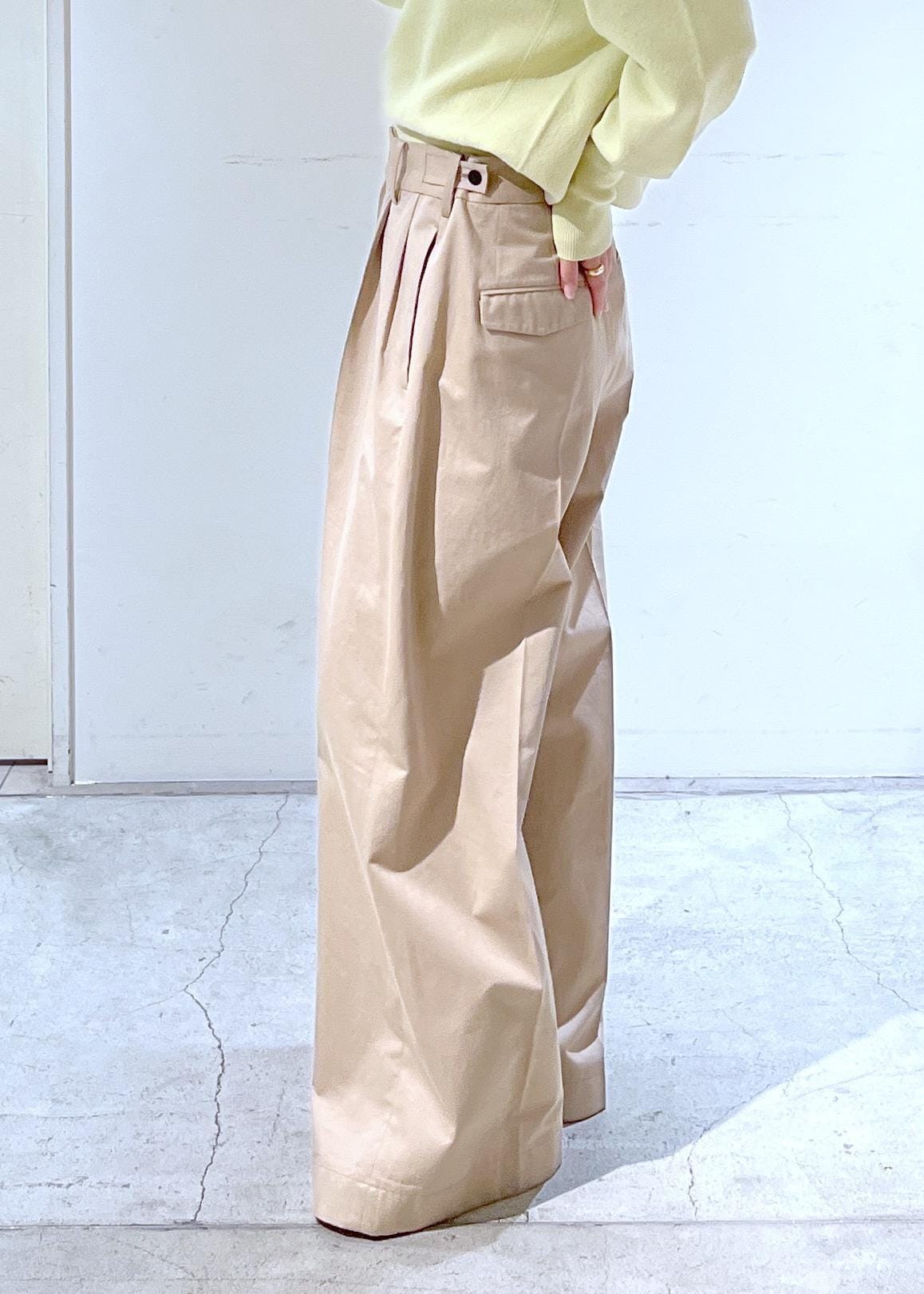 パンツの幅はかなり太めですが、タックが入っており綺麗なシルエットに。腰回りはゆったり、ボタンで1段階調節することもできます。