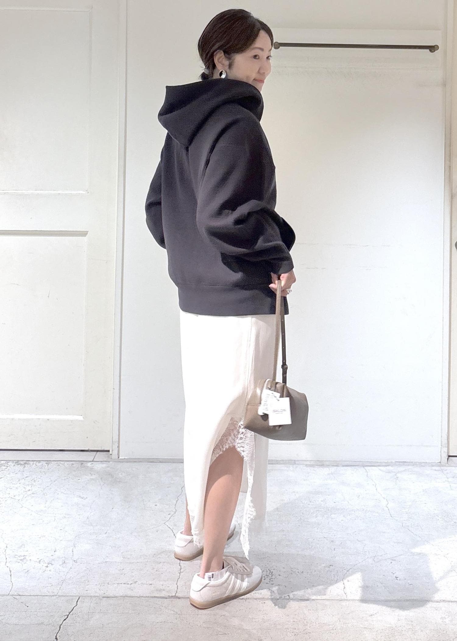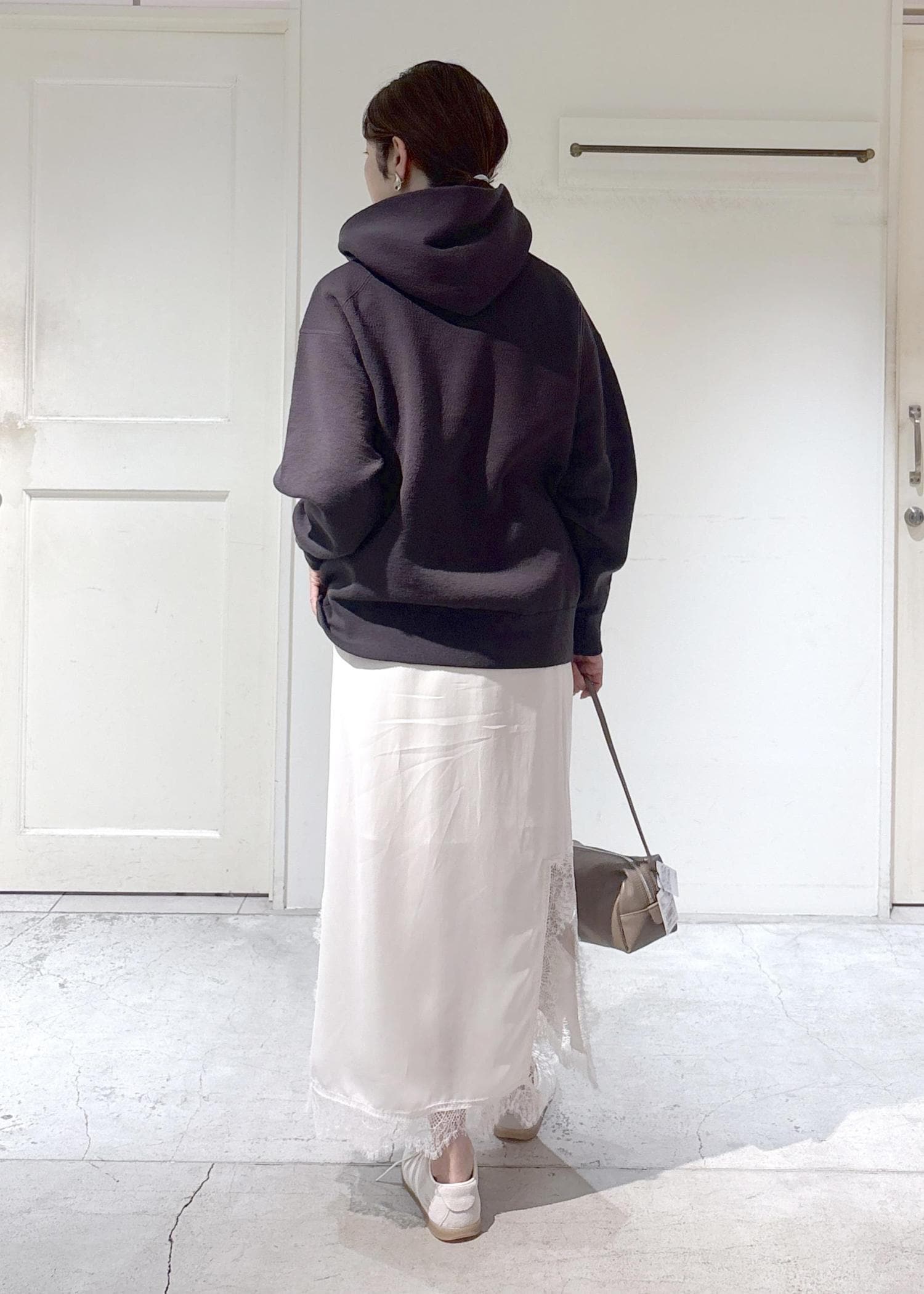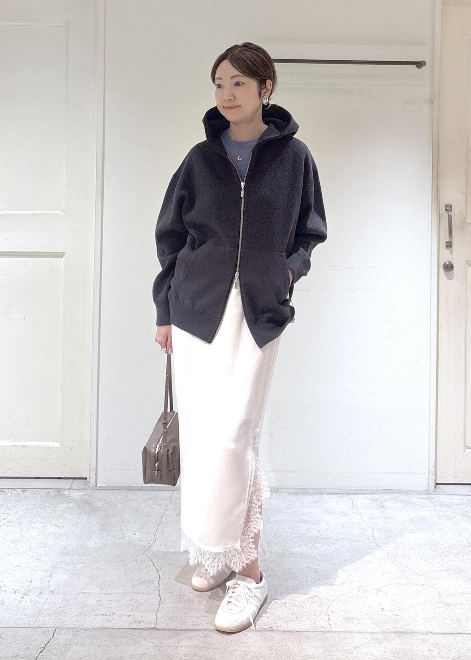 SALON adam et ropéクレープスウェットライクジップパーカーチャコール / F¥17,710レビュー軽くシワにもならないクレープ素材。程よいゆとりがありヒップにかかる丈です。ダブルジップなので、下を開けてボトムスを見せてもいいですよ。