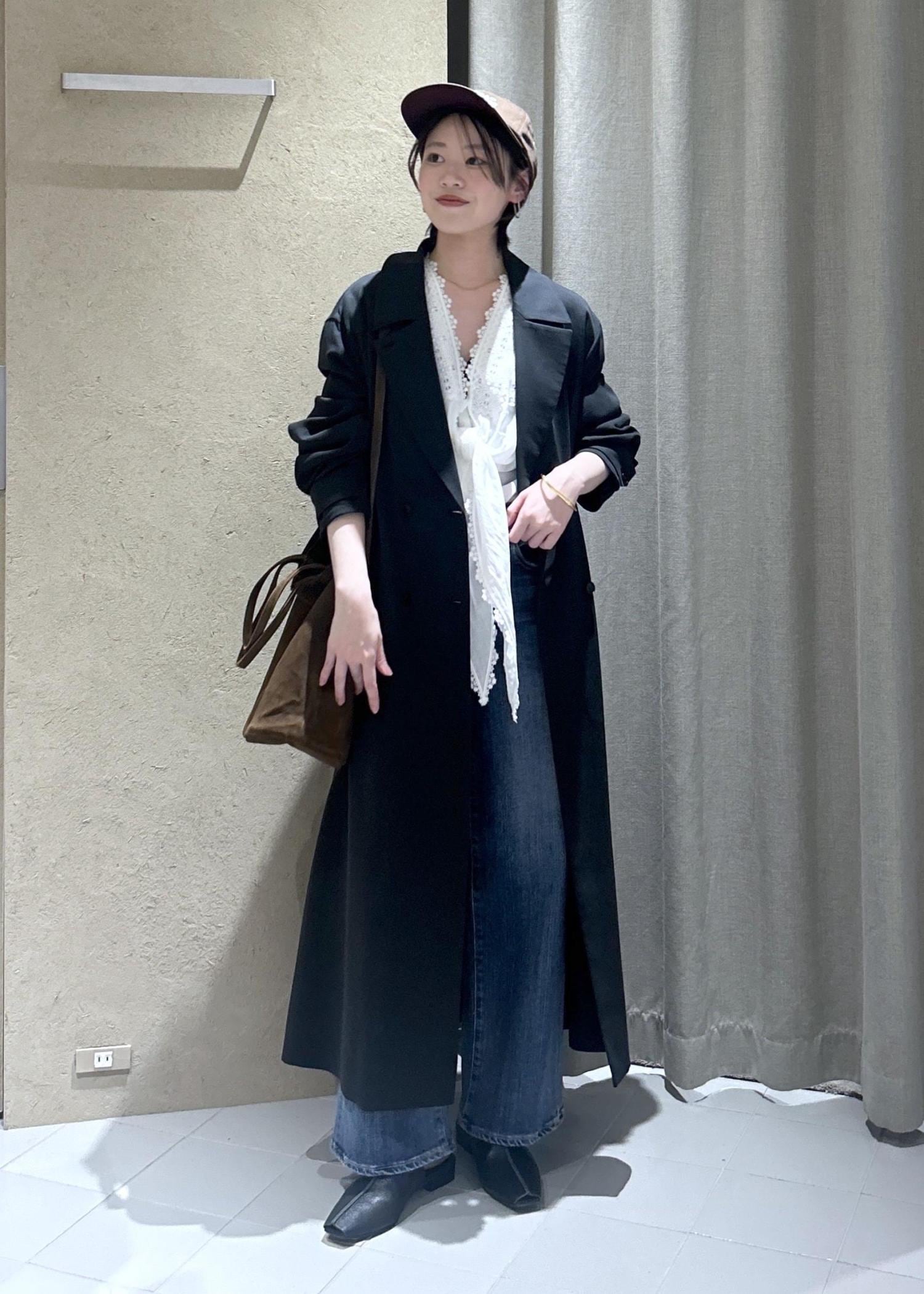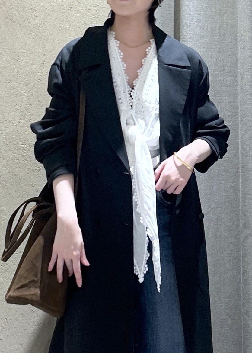 通常ブラックのトレンチコートはややマニッシュでオフィス感も出やすいですが、このデザインは柔らかな肩の落ち感とツヤが女性らしいので普段使いしやすいです◎