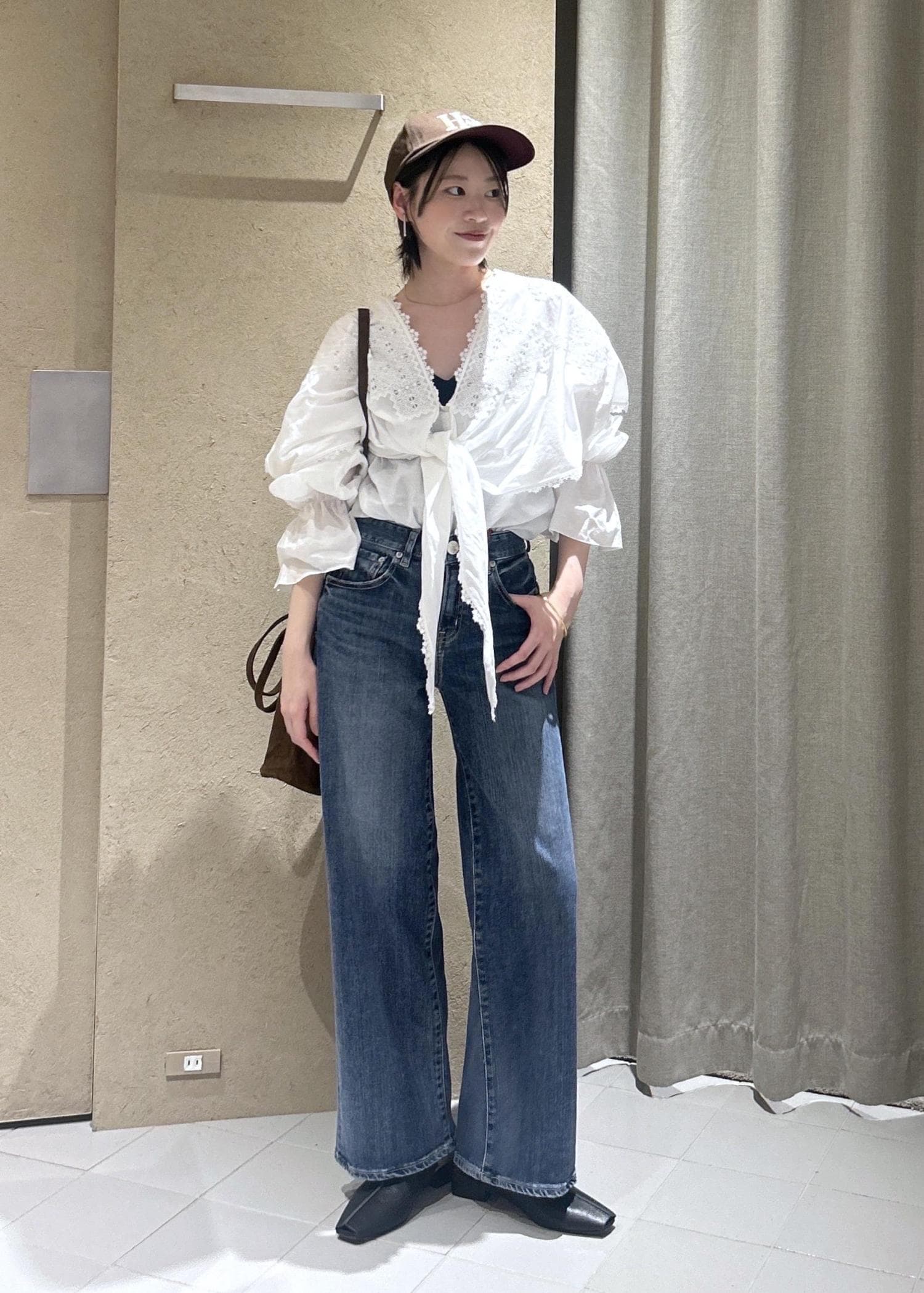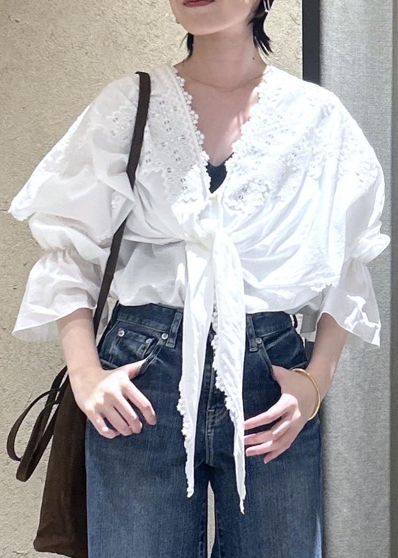 クロスレースのブラウスと合わせて、甘めカジュアルなスタイルにまとめてみました。