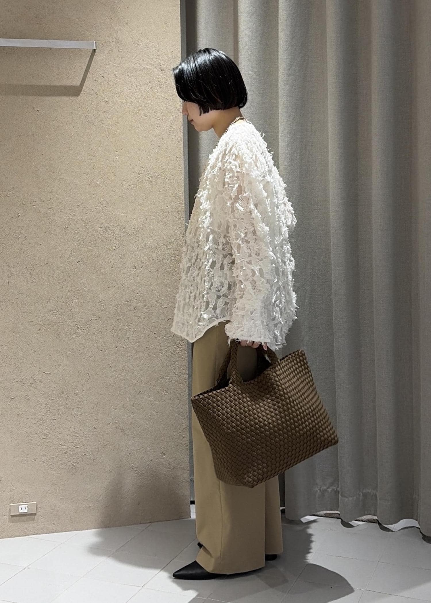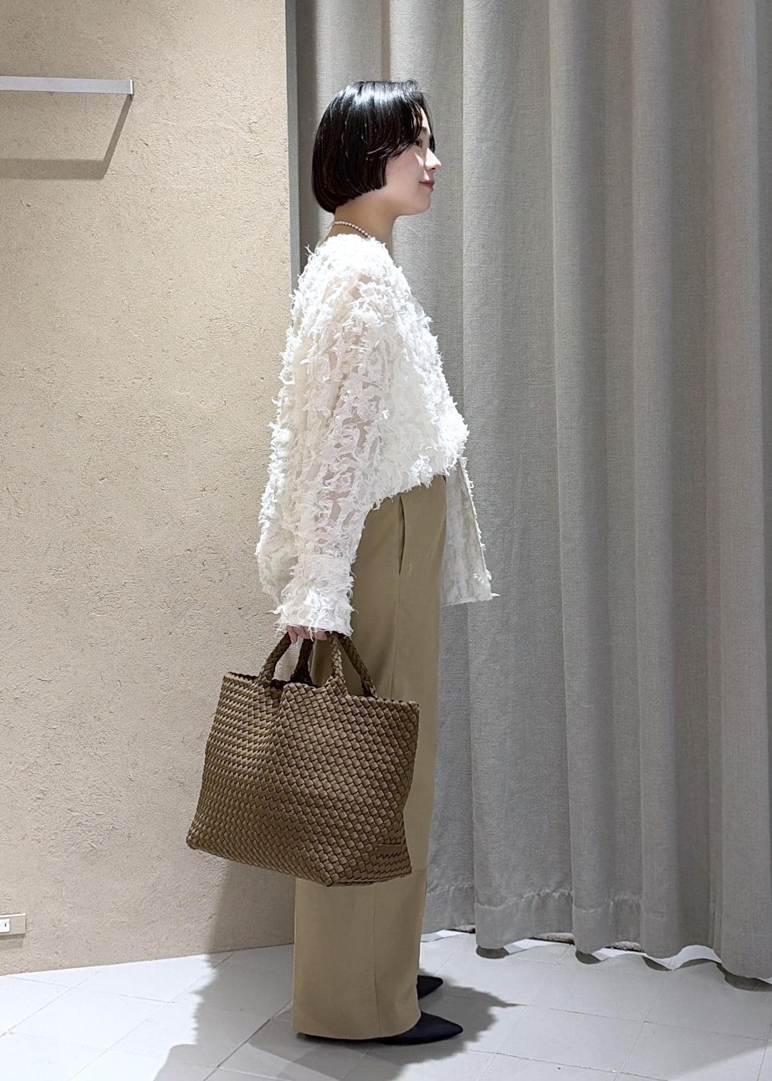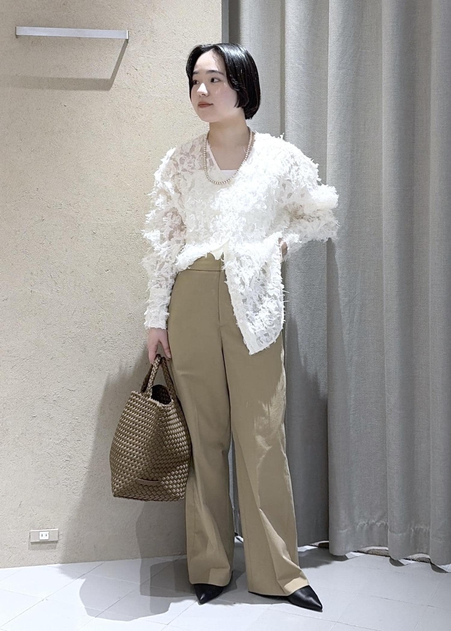 今回はベーシックにベージュのスラックスで合わせ綺麗にまとめてみました。