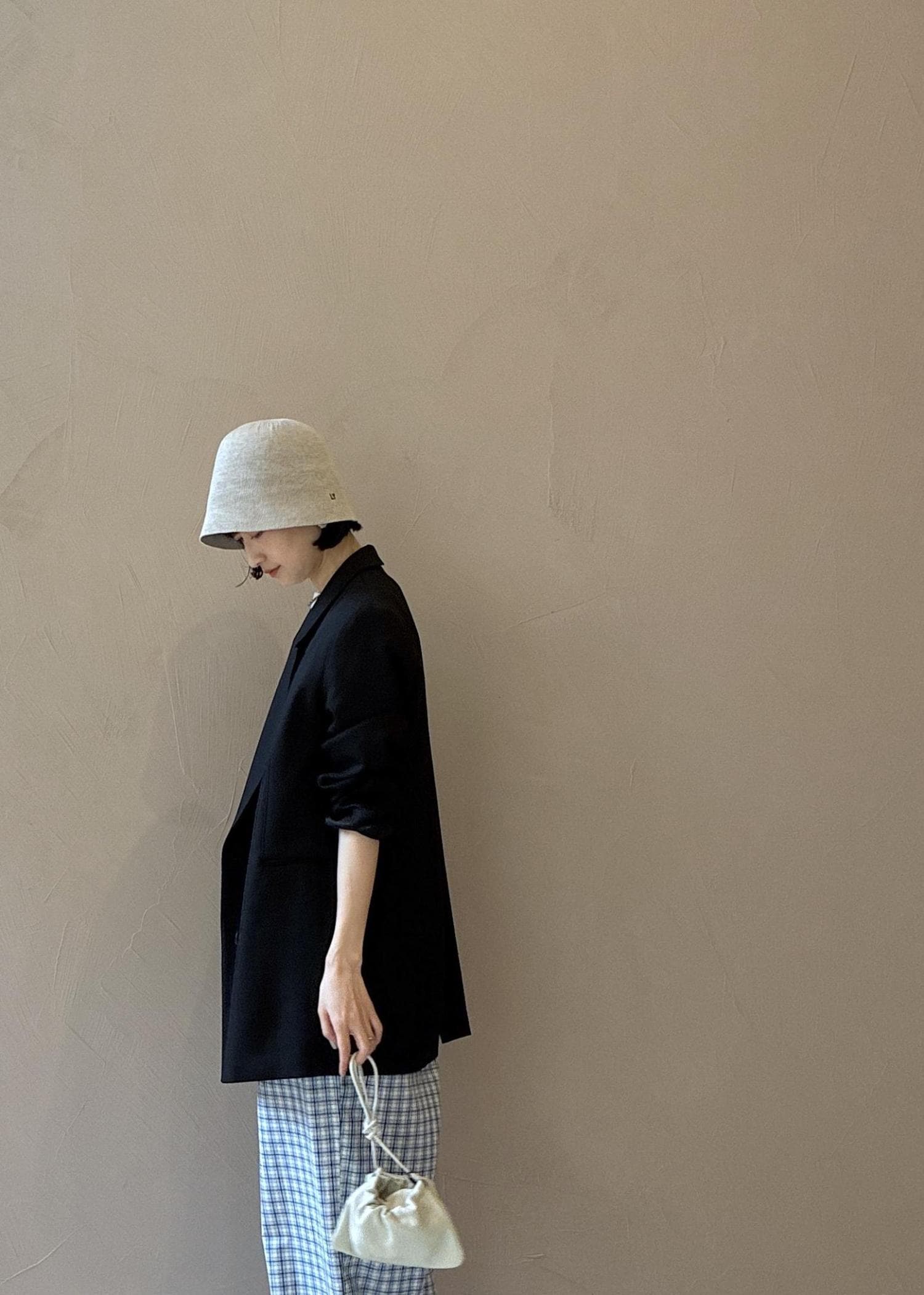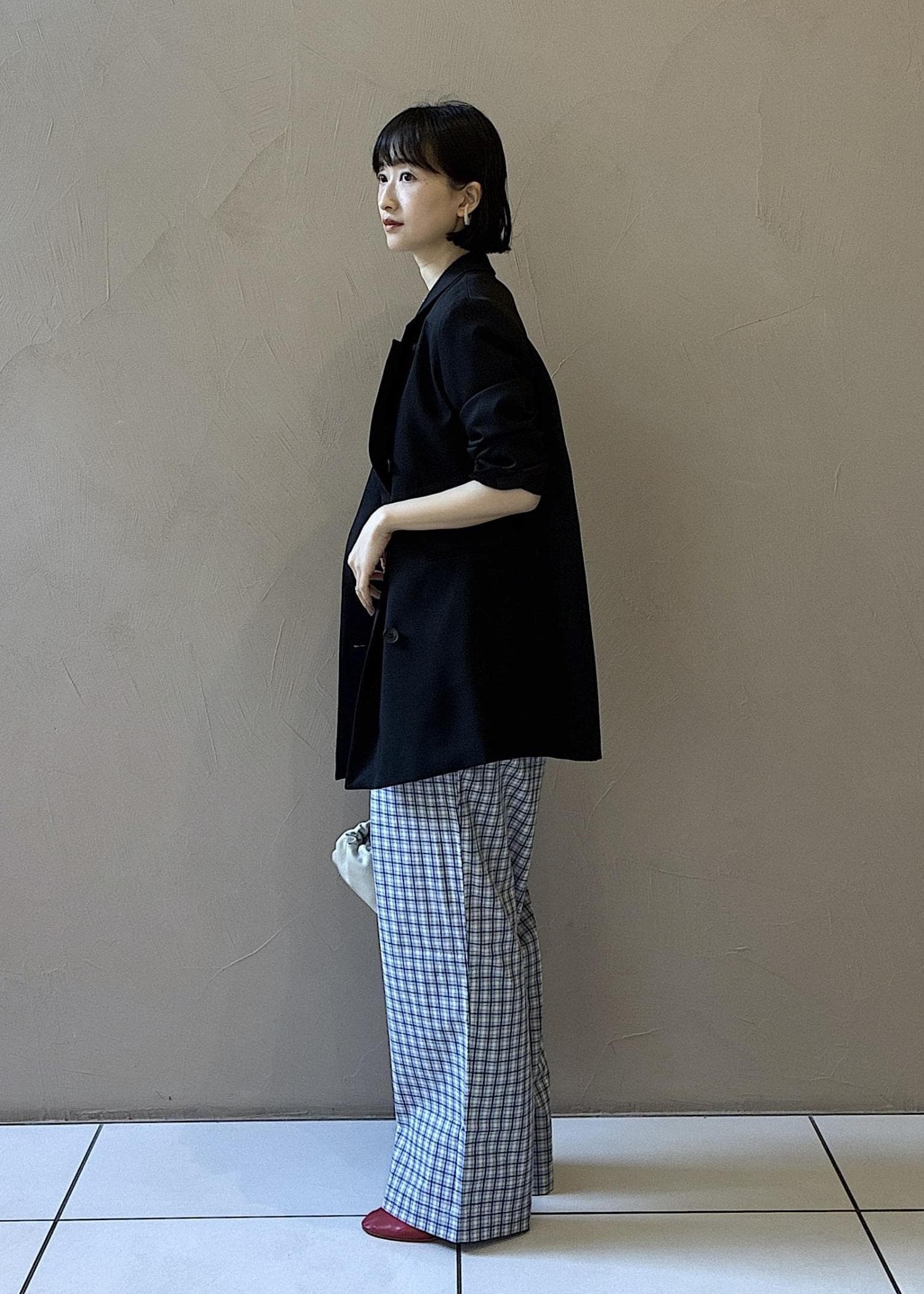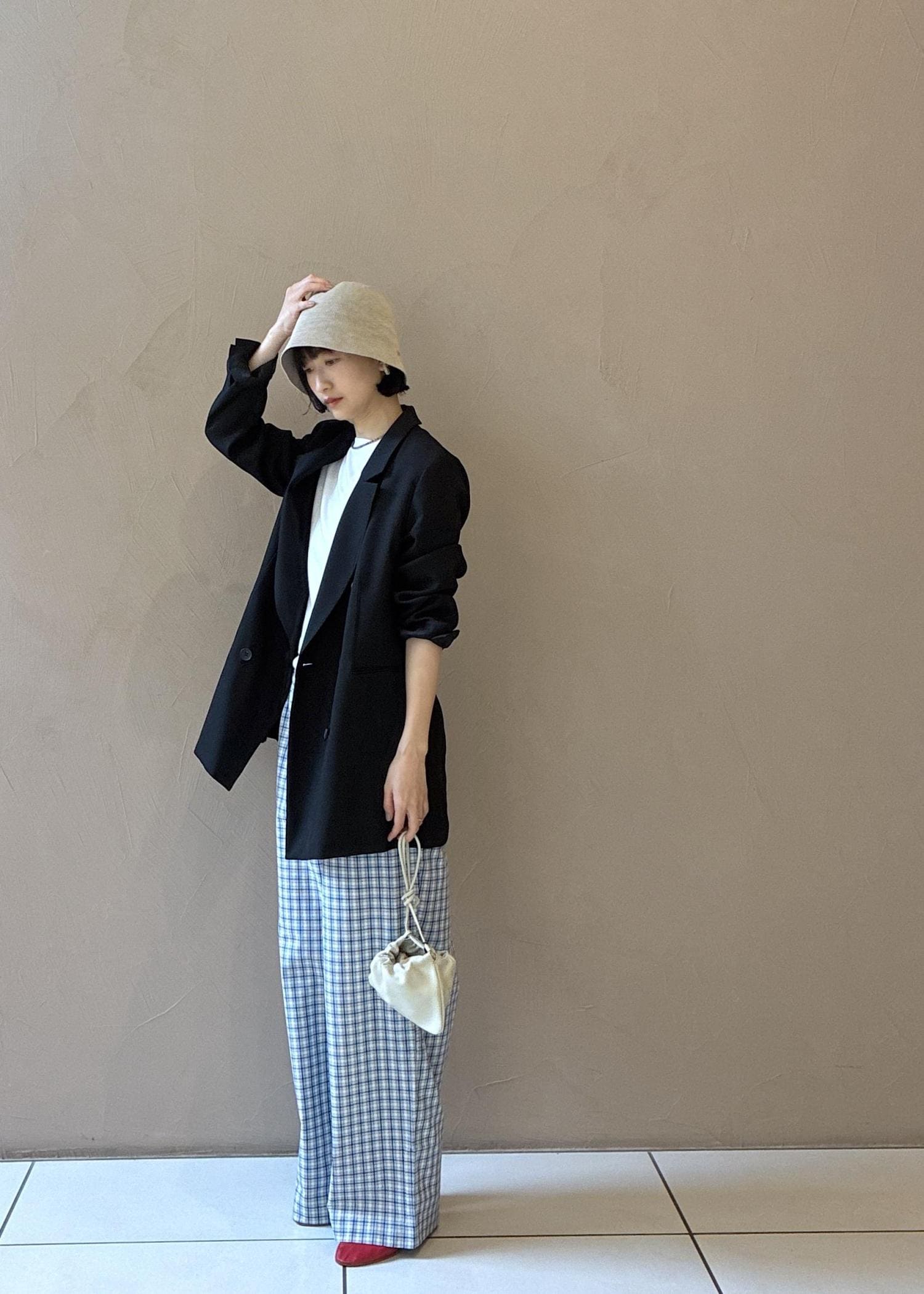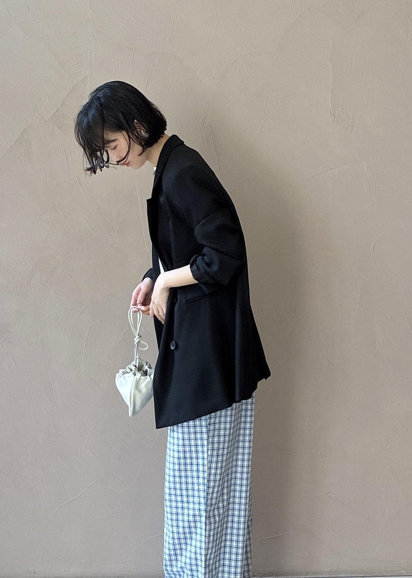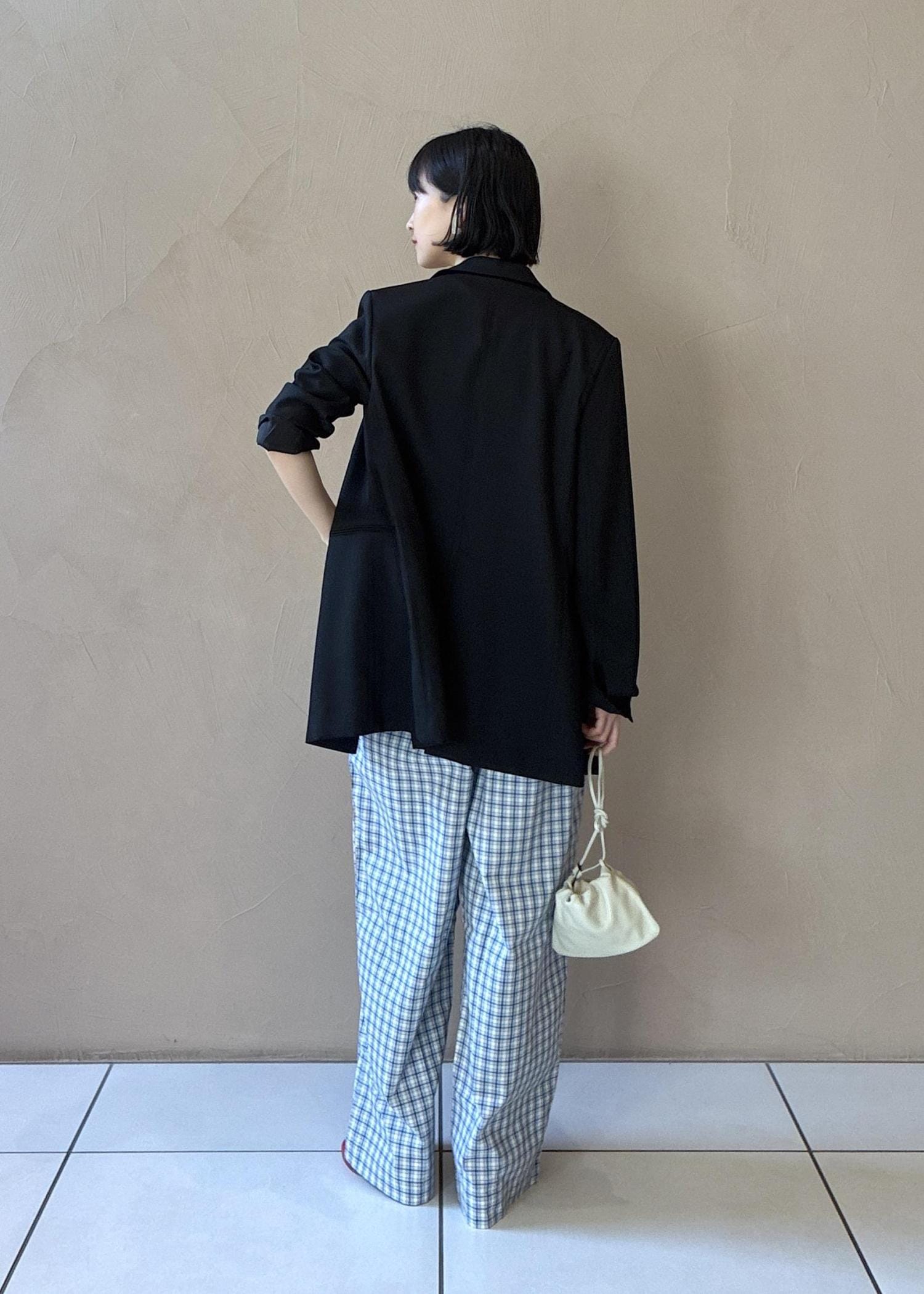 ジャケット×イージーパンツのゆるっとカジュアルなスタイリングです。