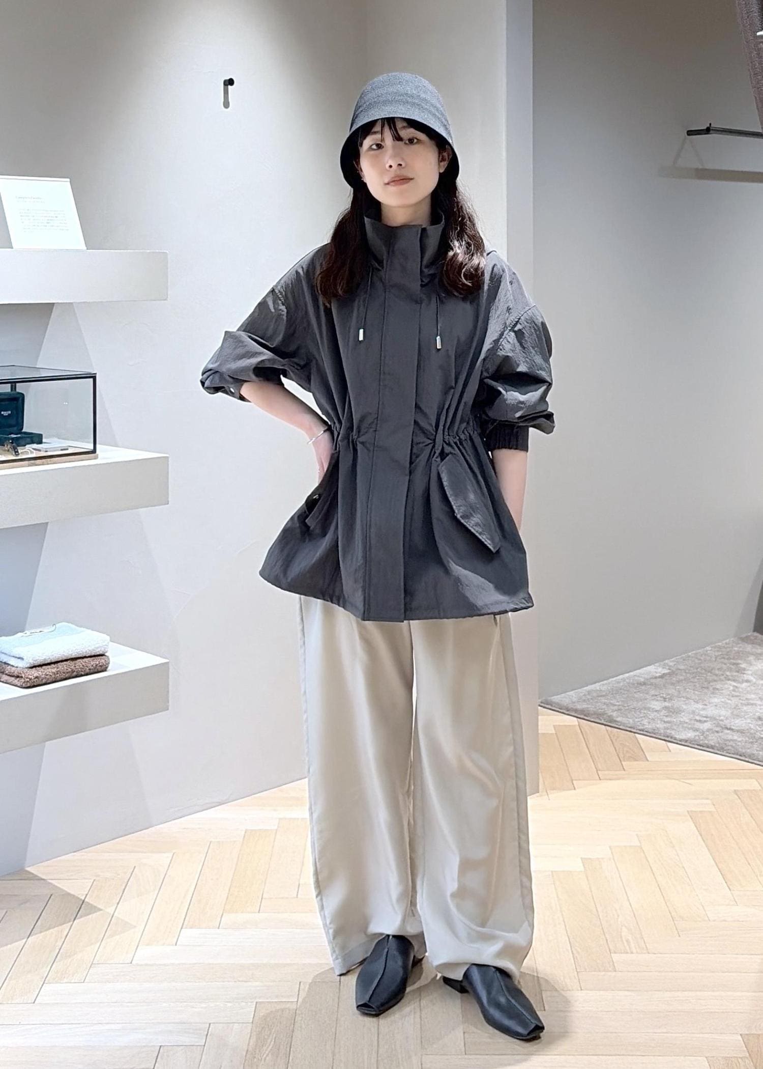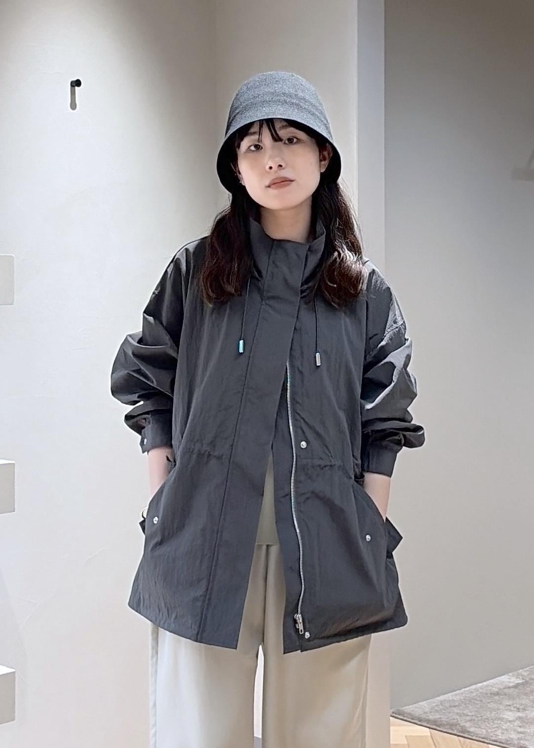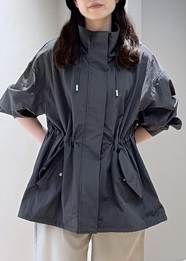シャリ感、ハリのある軽量素材。カジュアルな春アウターですが、ウエストを絞れたりメリハリのある着こなしができます。シワにもなりにくく、コンパクトに畳めます。 -