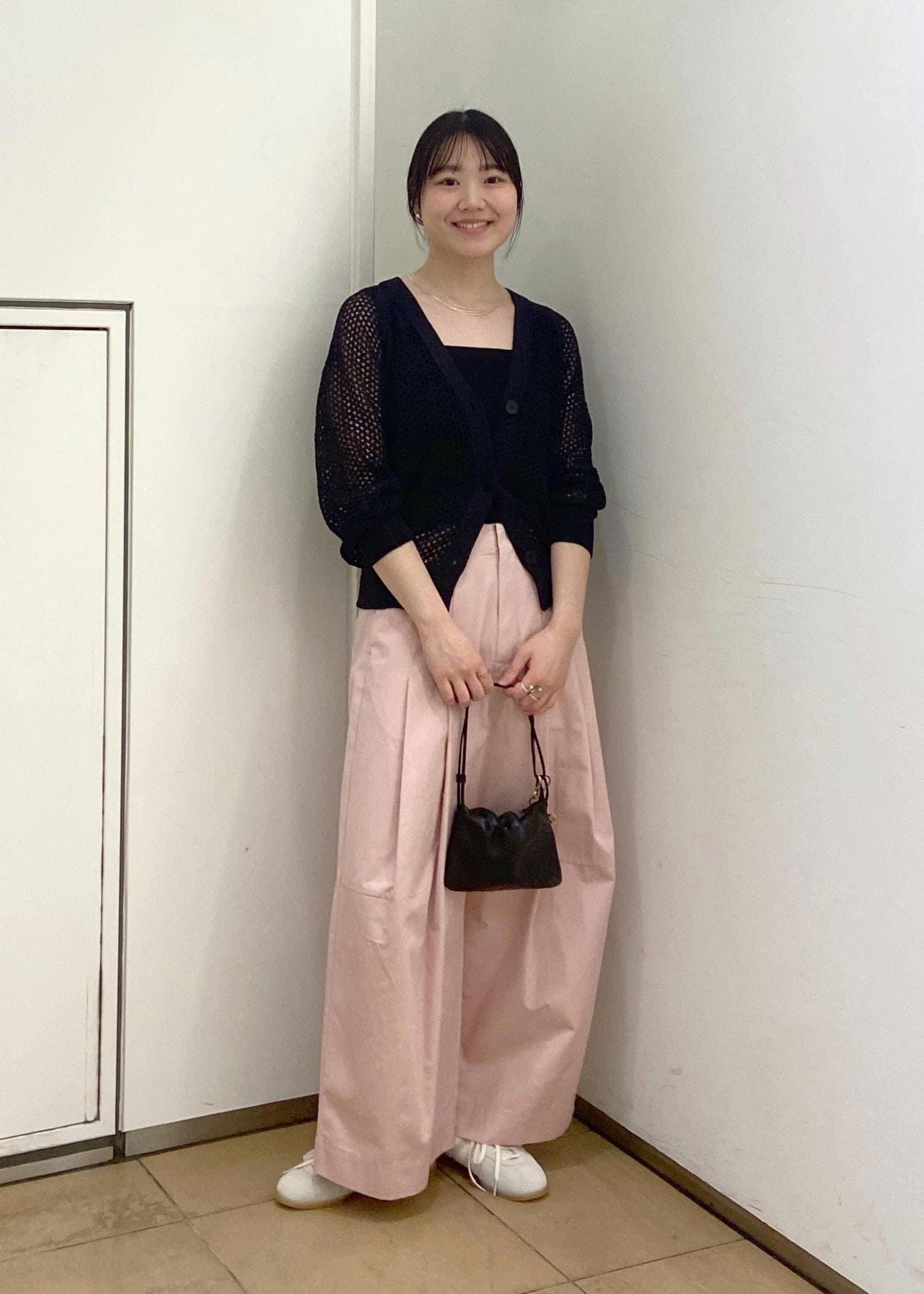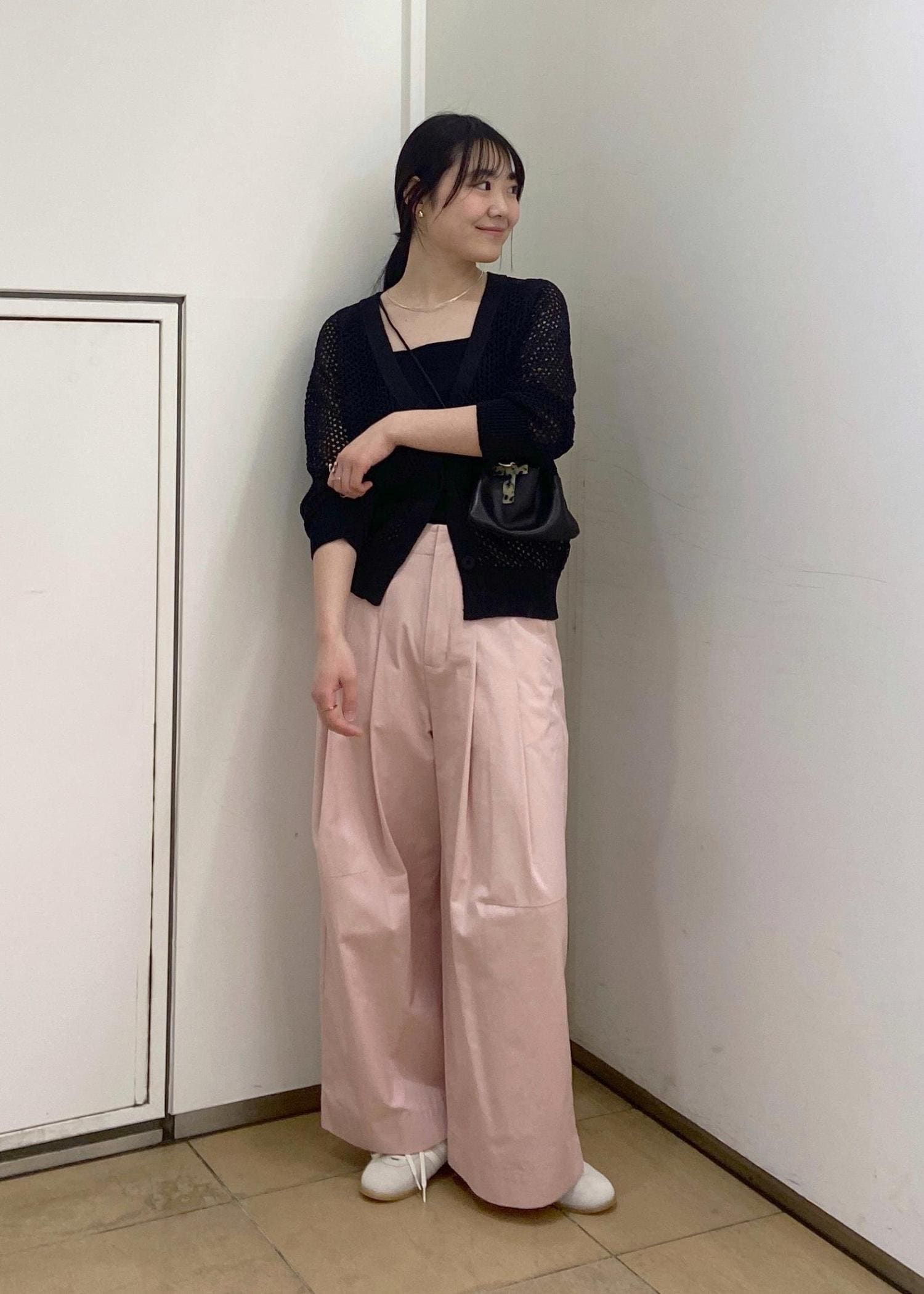 春めくピンクカラーにブラックで、きれいめなカジュアルスタイルに◎