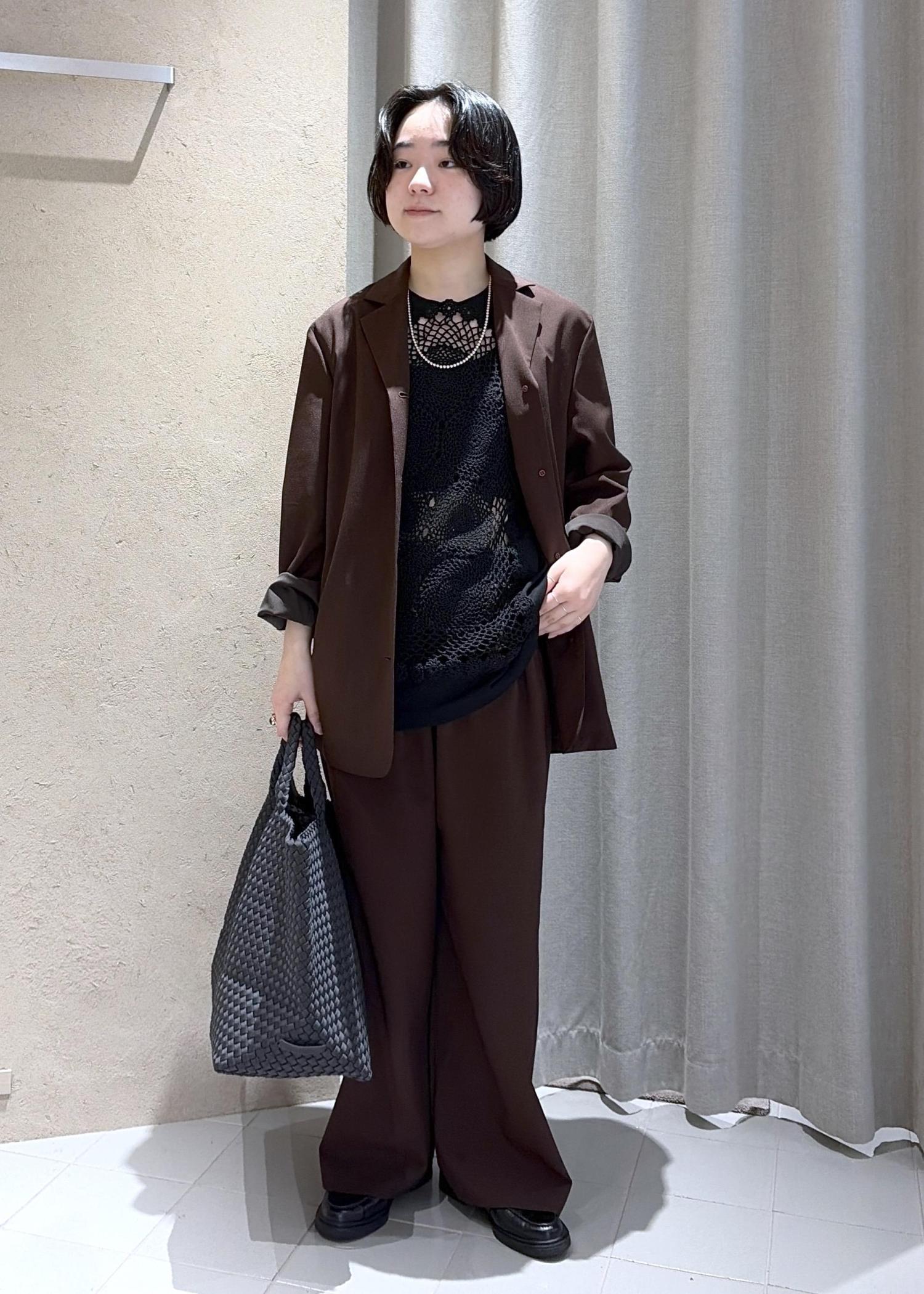 今季流行りの首元の空きが少ないジャケットは、セットアップで着こなすの一気にこなれたスタイリングになります。インナーキャミソールに前ボタン閉めるスタイリングももちろんおすすめですが、こちらも別注のスーベニアスタンドのレースTシャツを合わせてアクセントにしてみました。