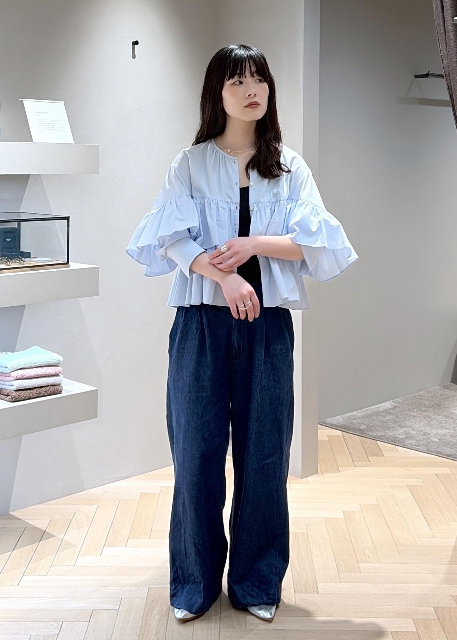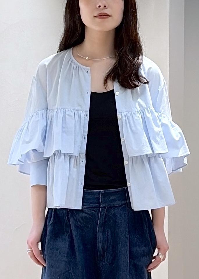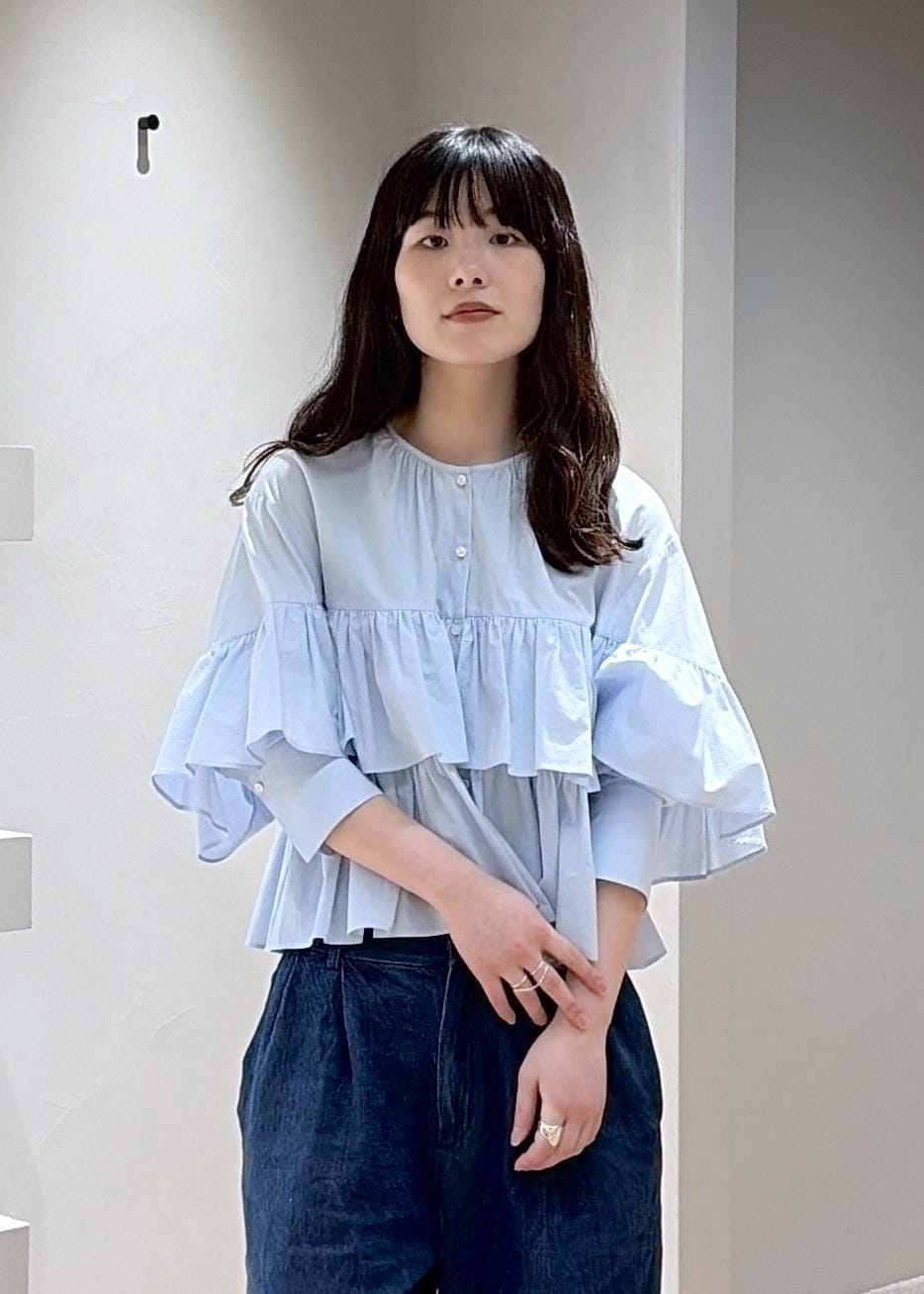 コットン素材。フリルは程よく付いていて、袖をまくるとすっきりとした着こなしができます。ボタンを開けて薄手の羽織でも使えます。 -