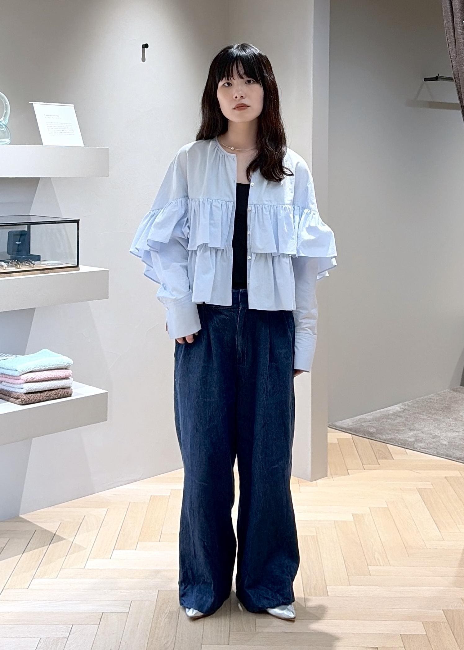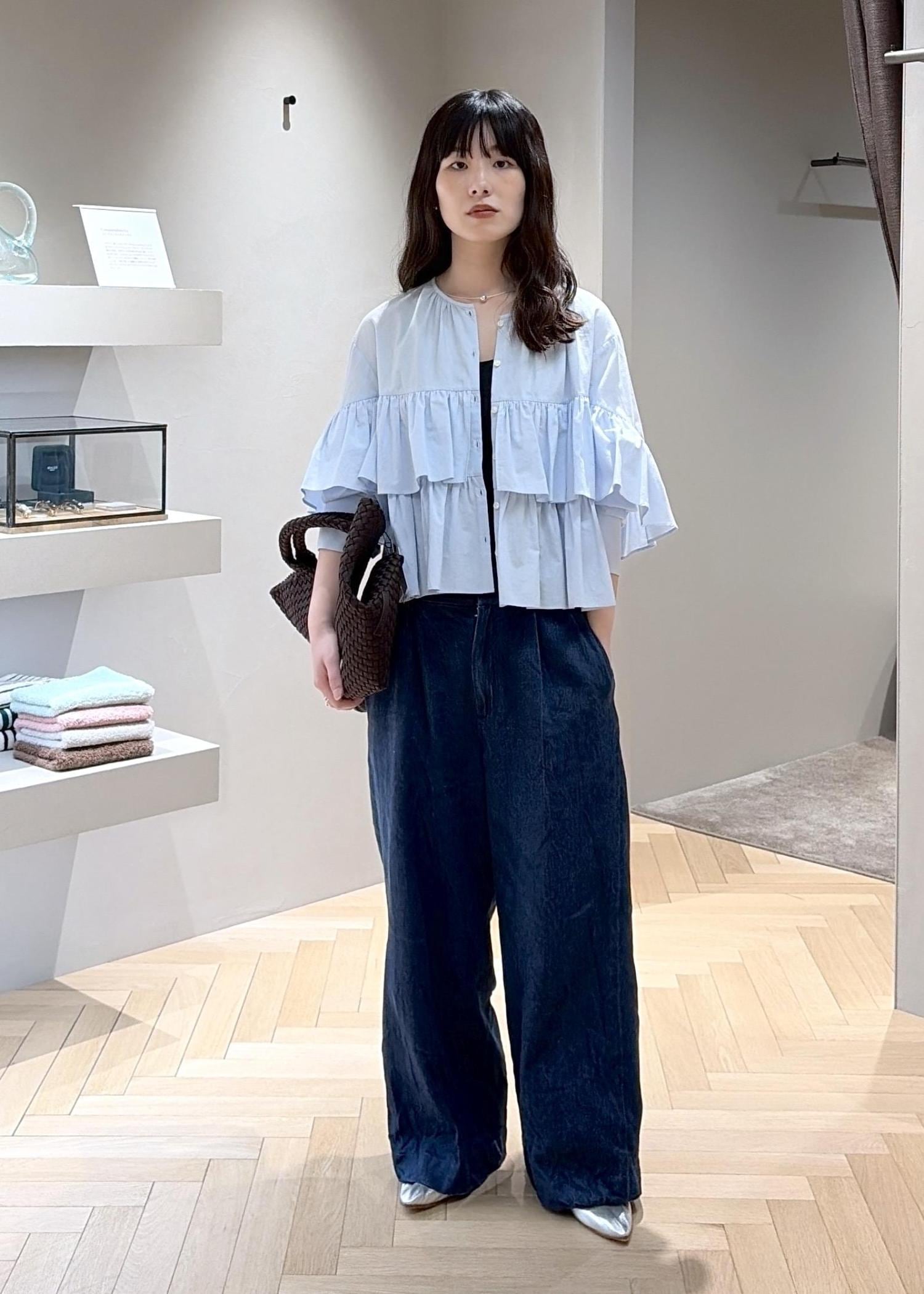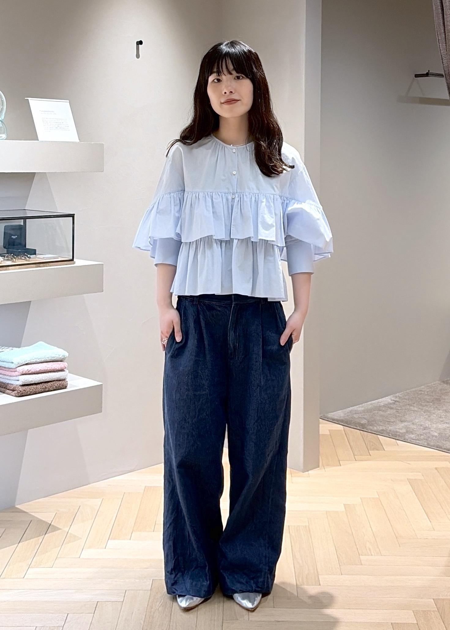 コットン素材。フリルは程よく付いていて、袖をまくるとすっきりとした着こなしができます。ボタンを開けて薄手の羽織でも使えます。 -
