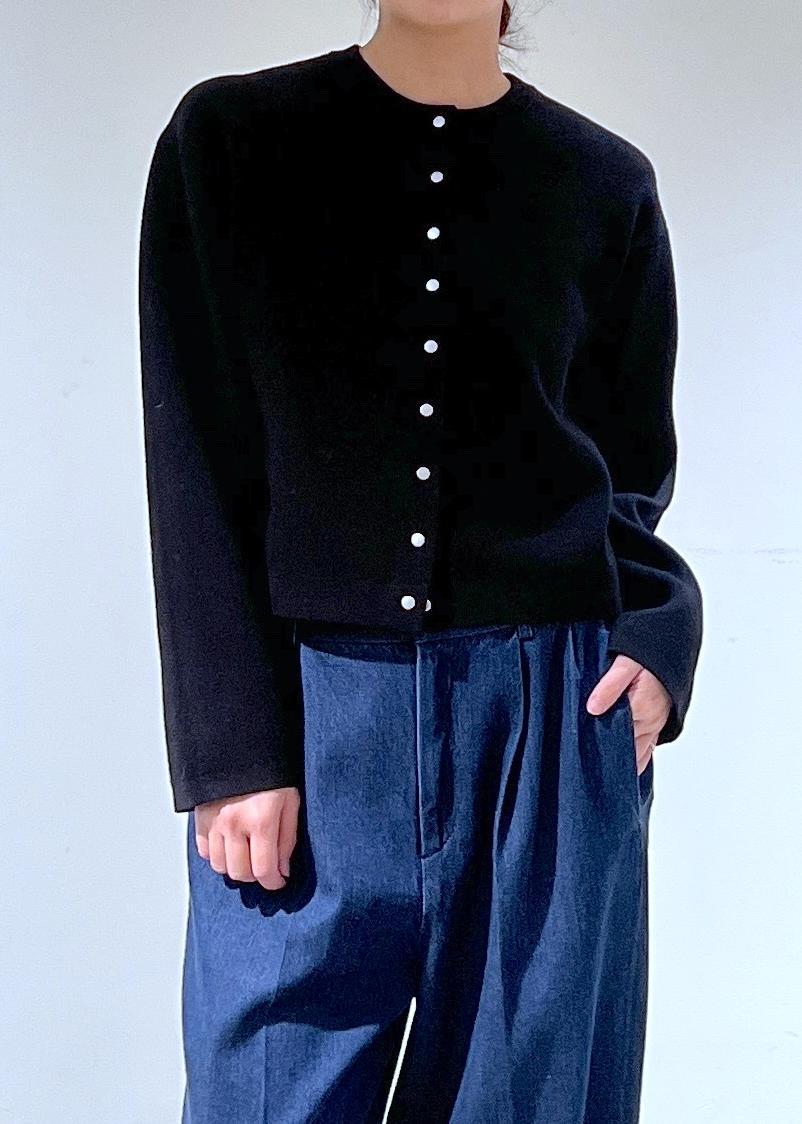 SALON adam et ropé【WEB限定】ブルジョンボタンクルーネックカーディガンブラック / F¥16,500レビュー丈はかなり短く、腰にかかるほど。ボタンの開け具合で着方を細かく調整できるのがお気に入りです。