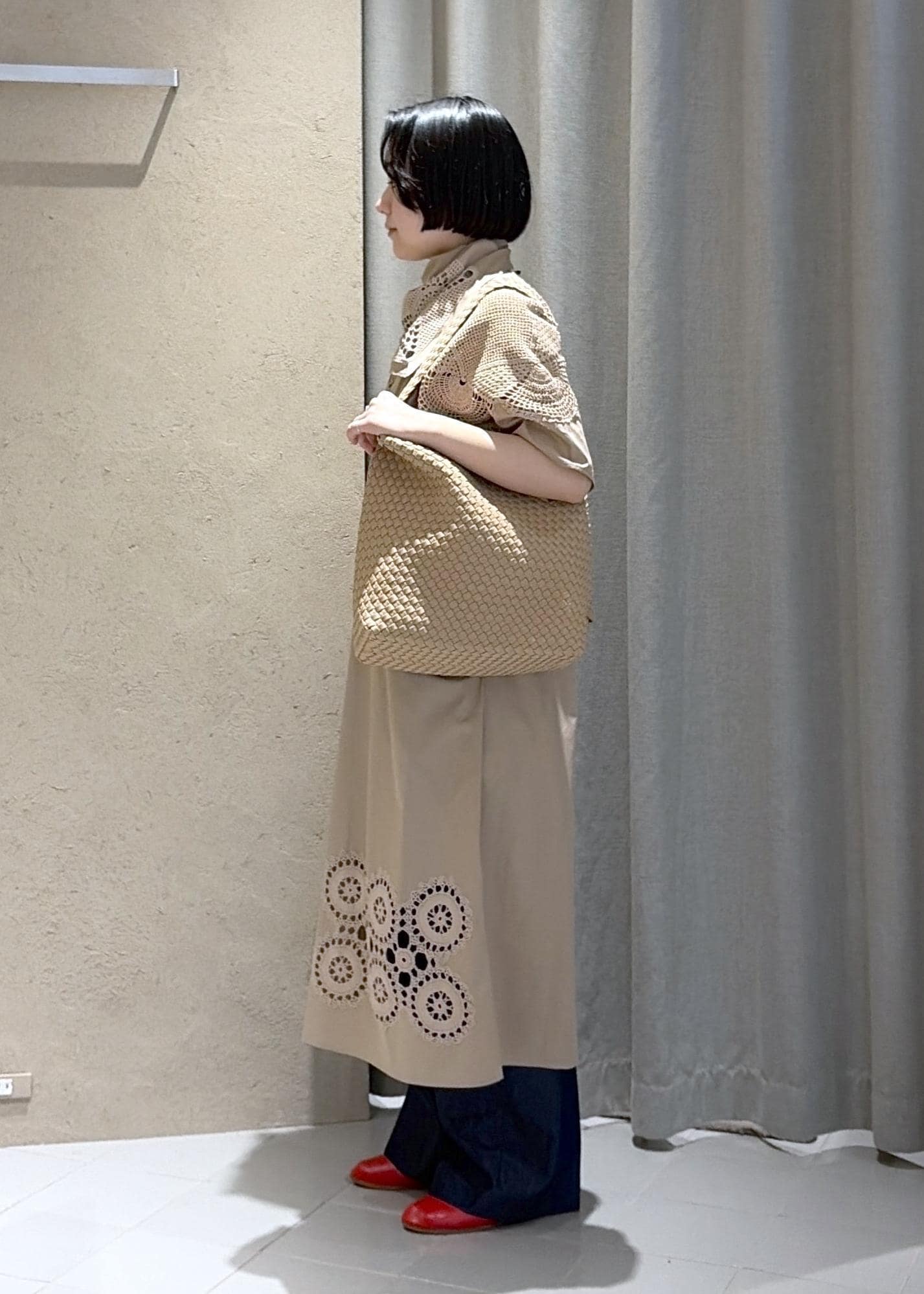 バッグは開催中のNAGHEDI pop upでお取り扱い中のホーボーバッグを合わせました。ベーシックで人気なトートバッグタイプとは違い、冬場も肩がけができ、磁石で留め具がついているのもおすすめポイントです。