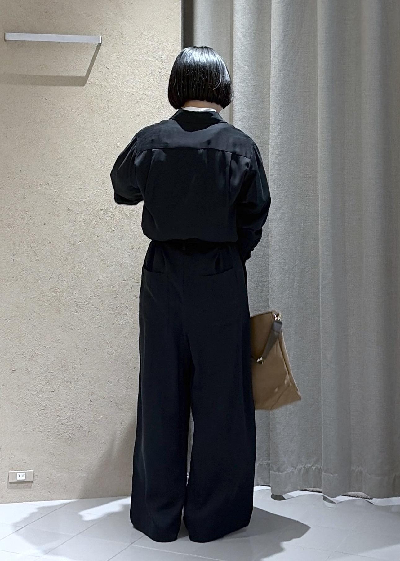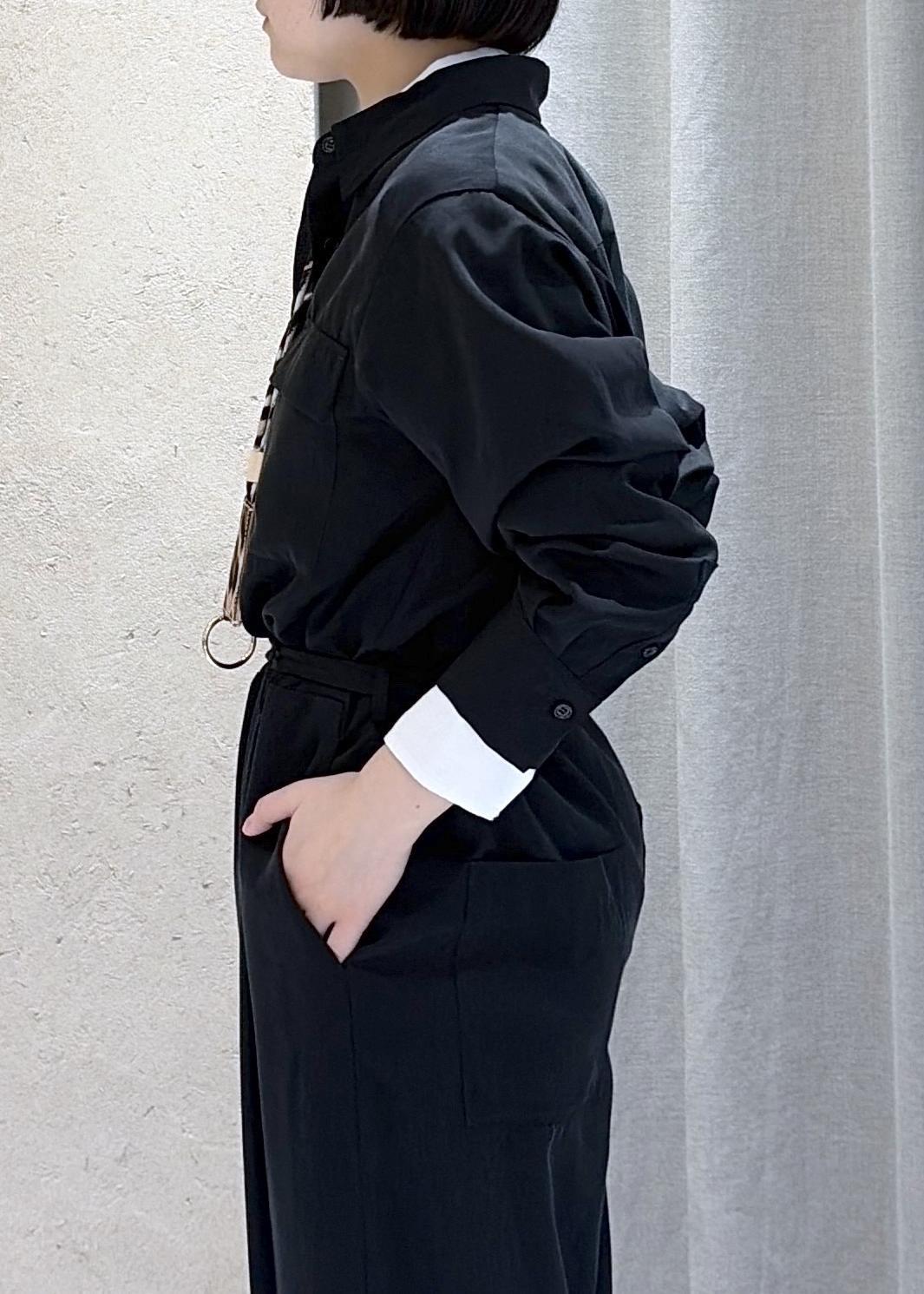SALON adam et ropéフィブリルクロスオールインワンブラック / F¥39,600レビュー身長155センチが着用して、付属の紐でブラウジングすると丈は床につかなかったです。ウエストしぼらずに着るとかなり長めなので小柄な方はベルトを使うのがおすすめです。とろみのあるさらっとした生地でカジュアル見えしすぎず、綺麗にきていただけると思います。