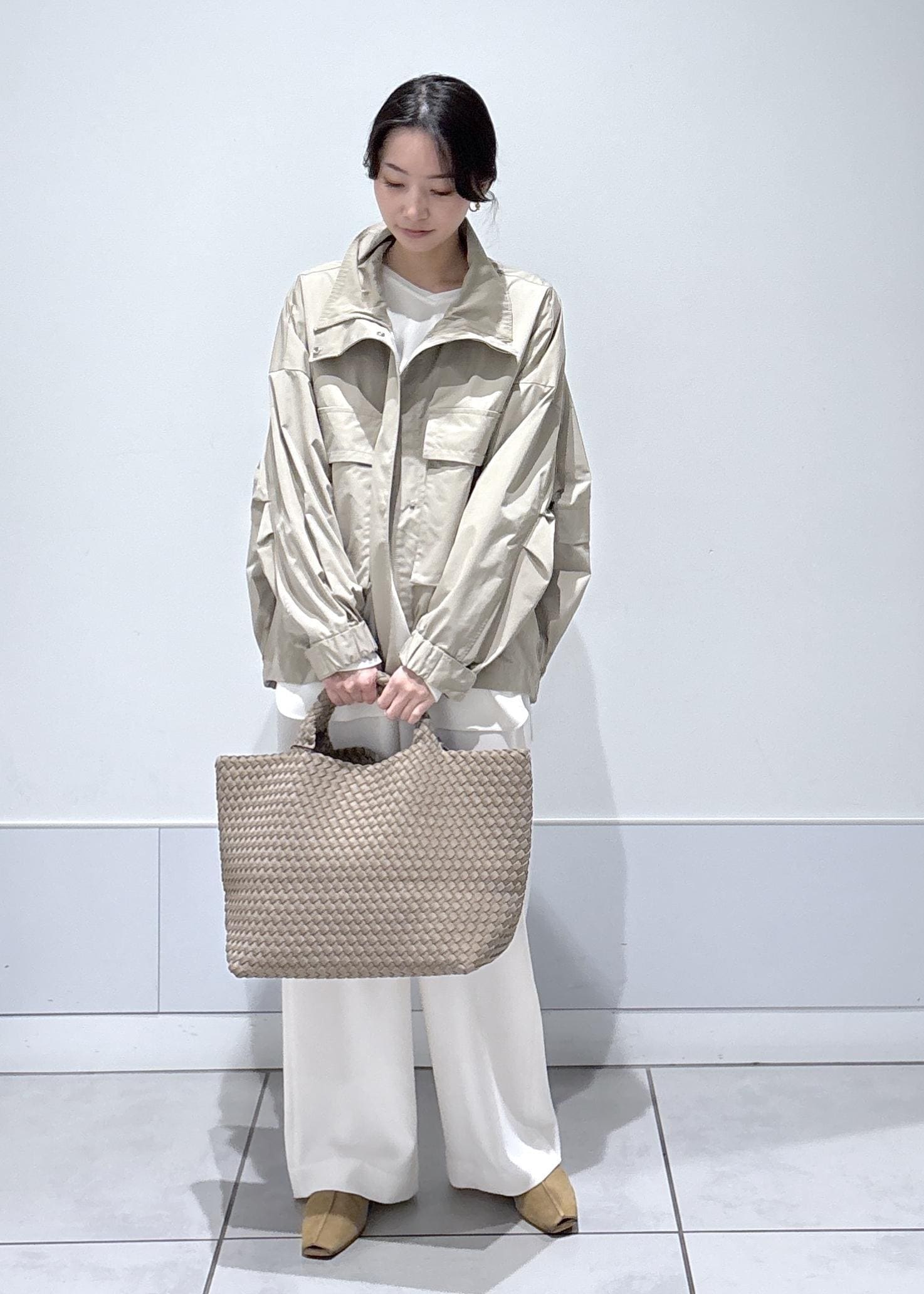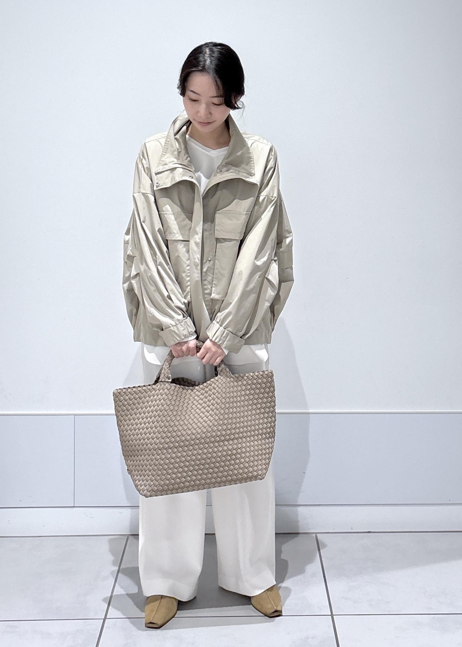 編み込みトートバッグとベージュのパンプスで素材感と色味をリンクさせ、抜け感を出しました。