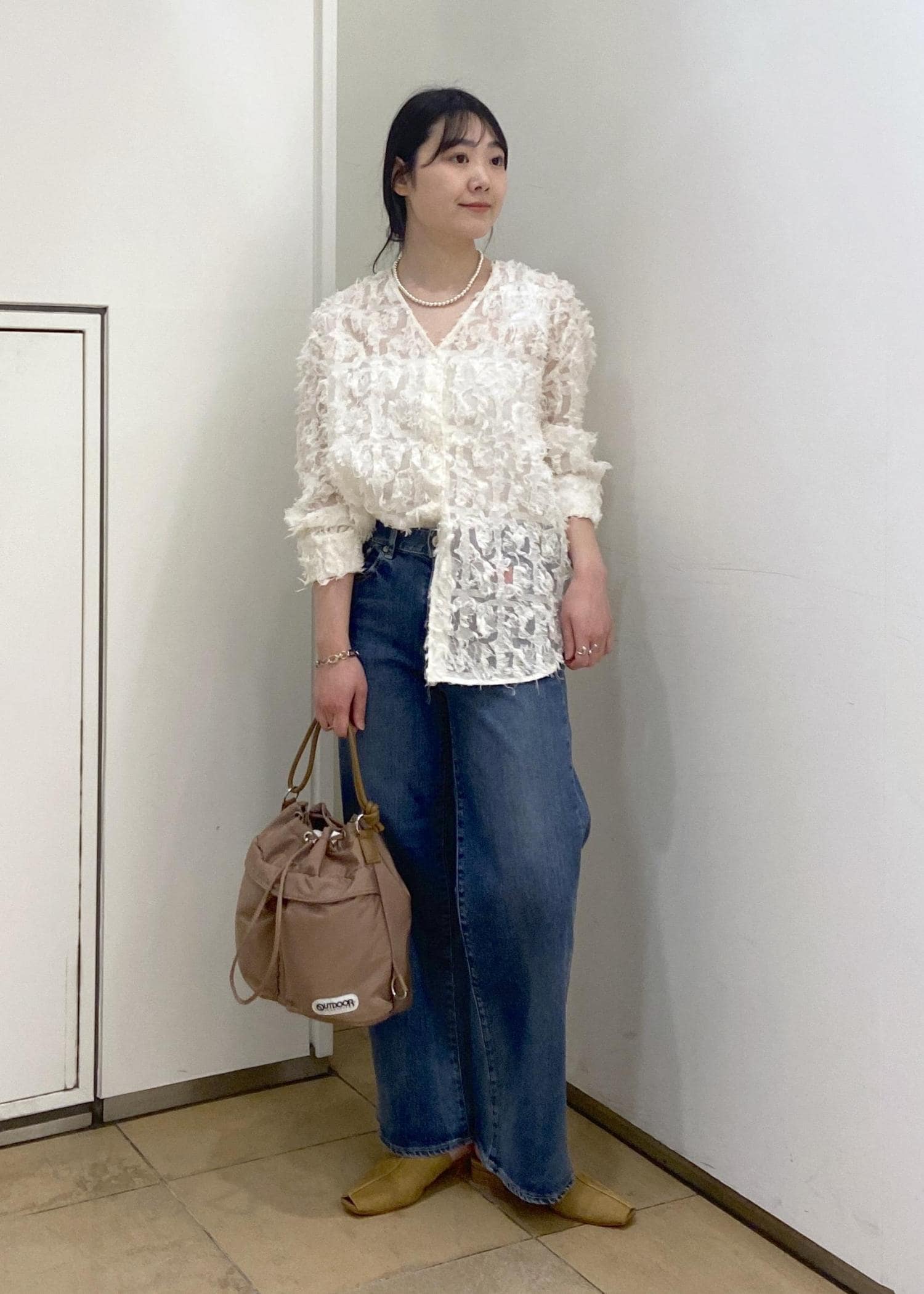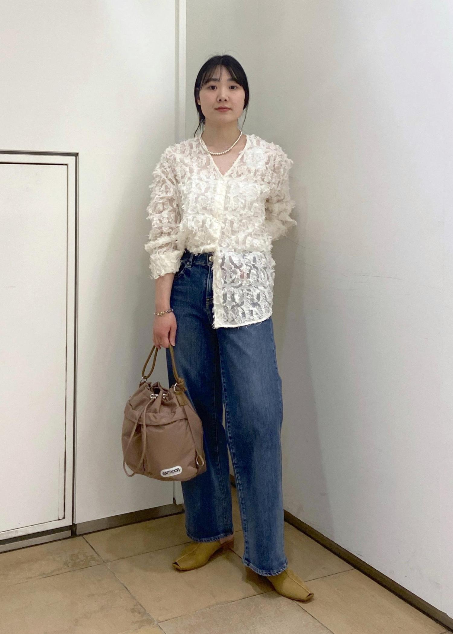 ハイウエストすぎず、腰回りはややタイトめ。程よいワイド感です。