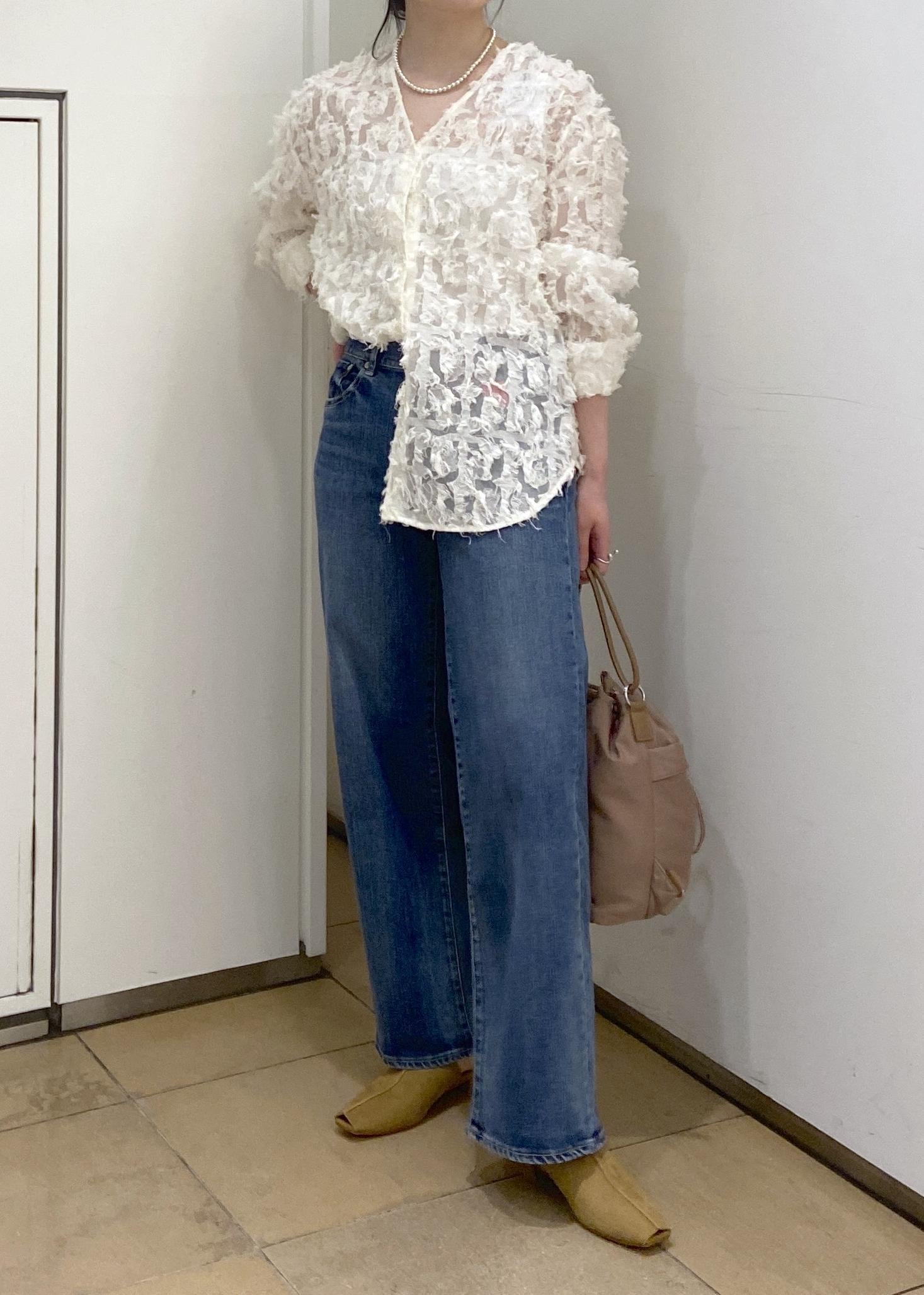 ジャガード素材なので透け感が控えめで、すっきりVネックが甘すぎず上品な印象です。 -