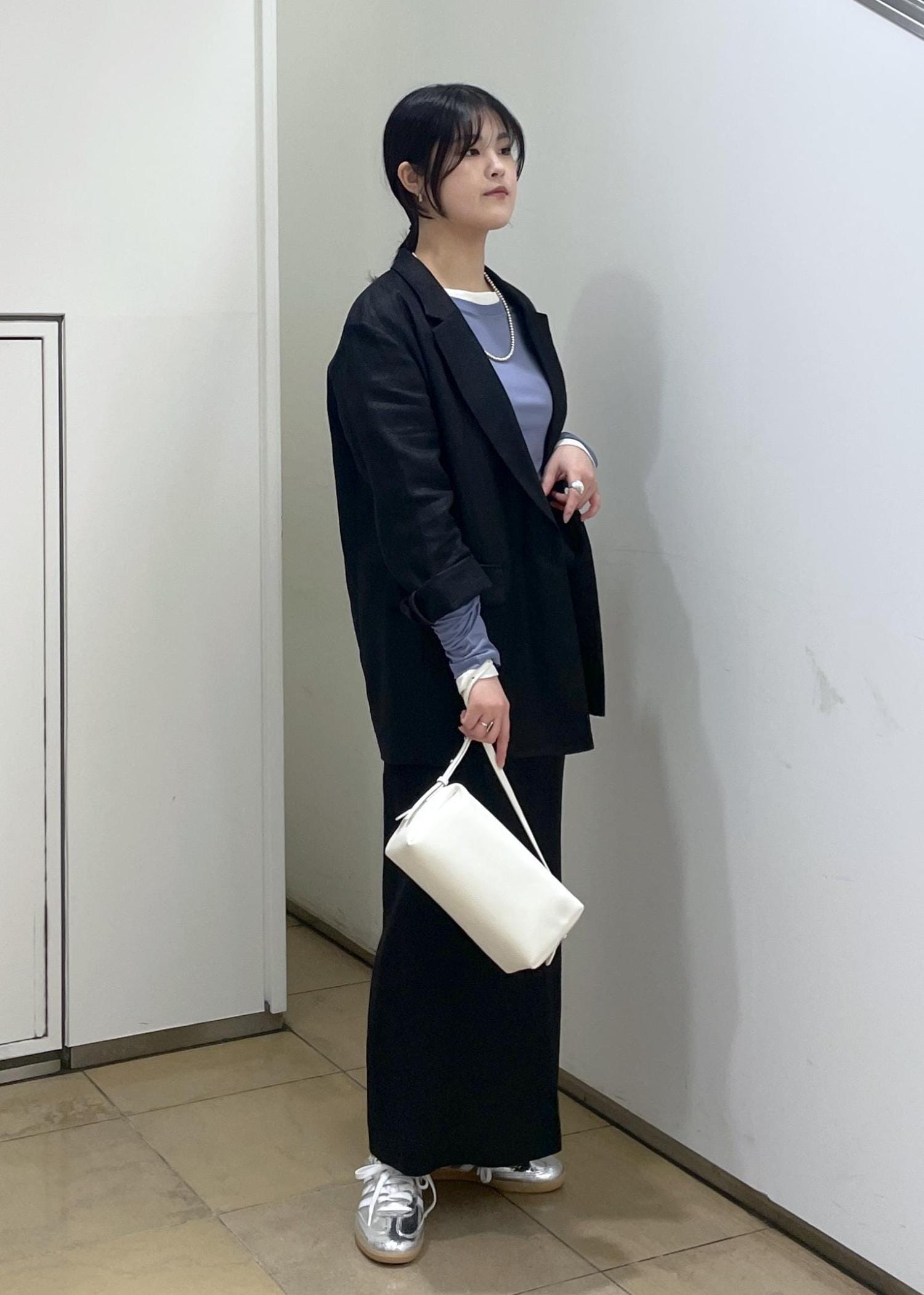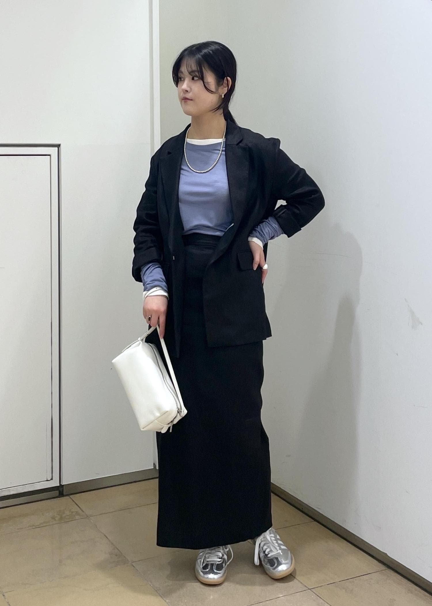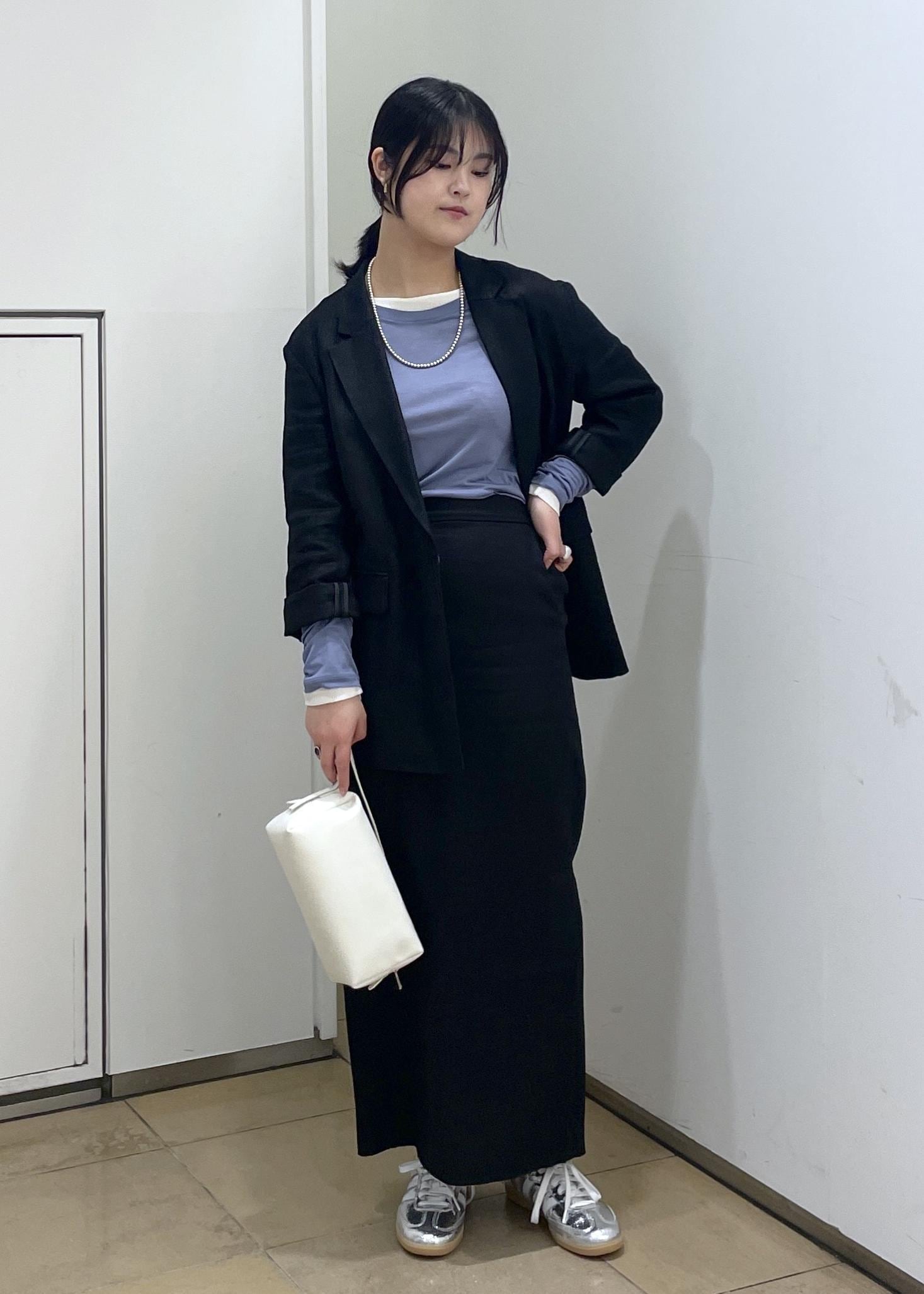 シンプルな形のスカートですが、膝下までのスリットがシルエットを綺麗に見せつつ、抜け感を出してくれます。 -