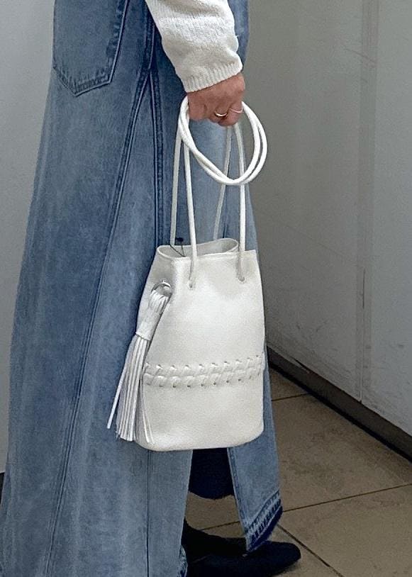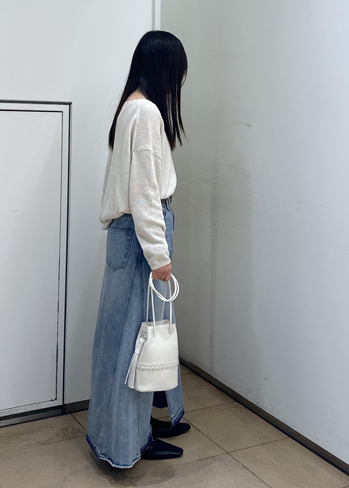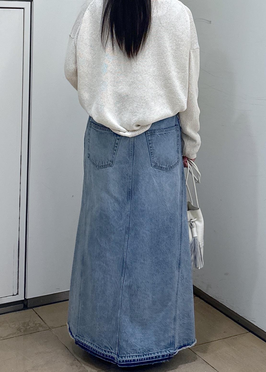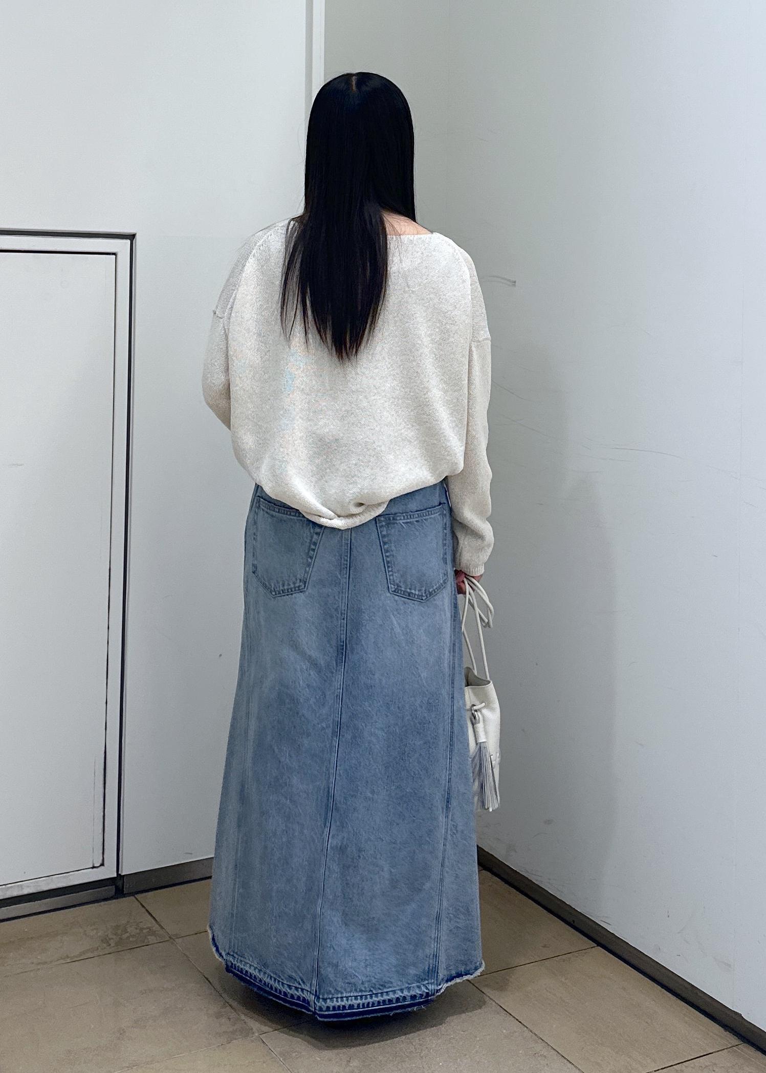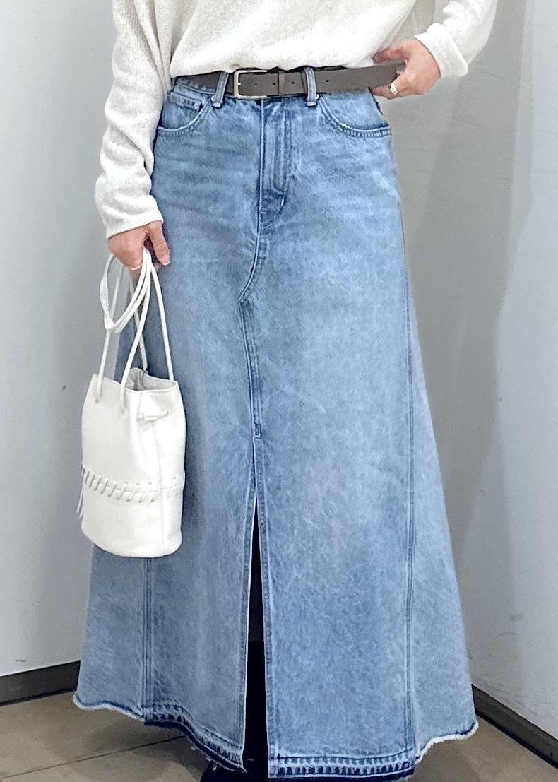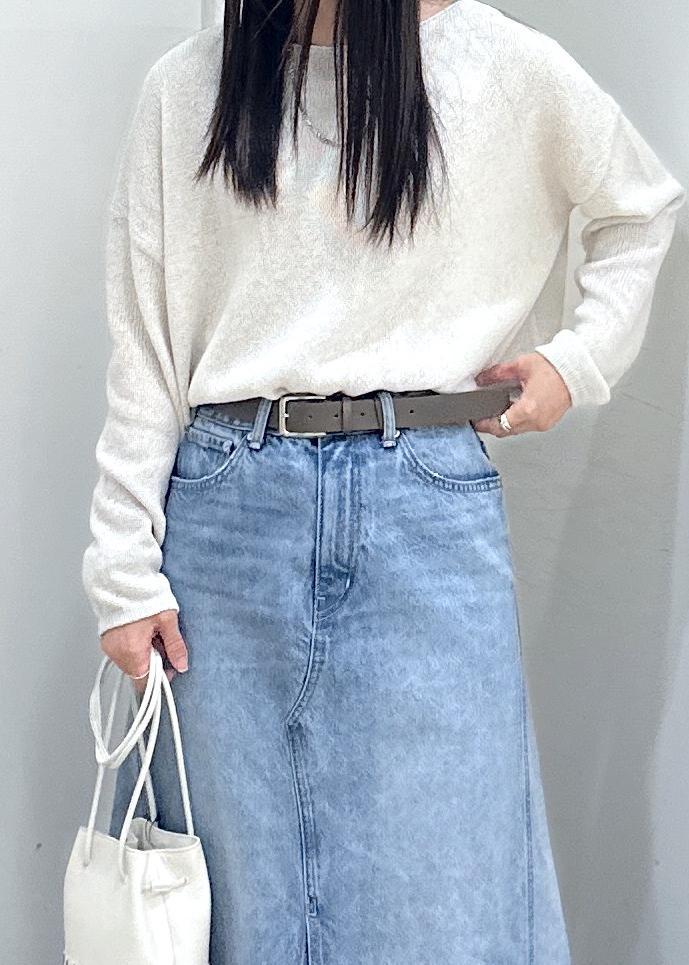 ヴィンテージライクなデニムスカートに、ニットを合わせてきれいめにまとめたスタイリング。