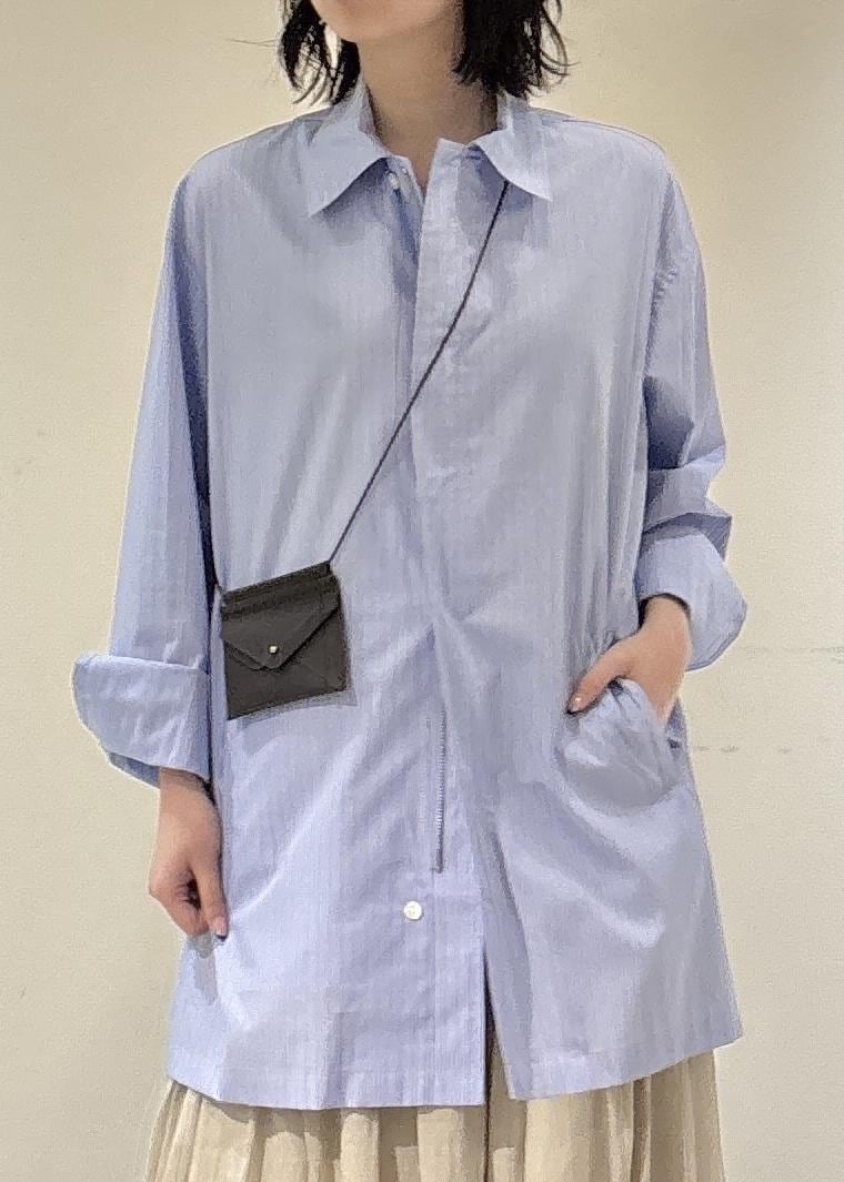 一見よくあるブルーのストライプシャツに見えますが、ファスナー開閉のユニークなデザインです。