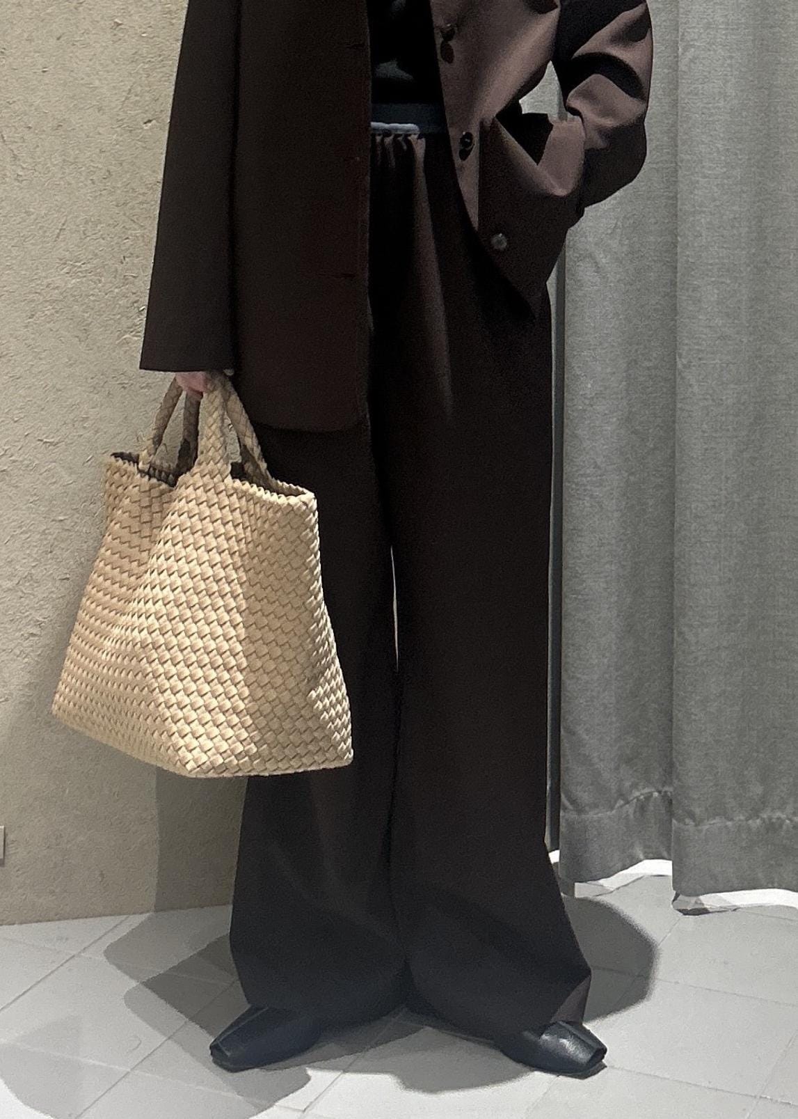 ややダークなカラーなので、小物は明るいベージュをチョイスして抜け感を出しました。