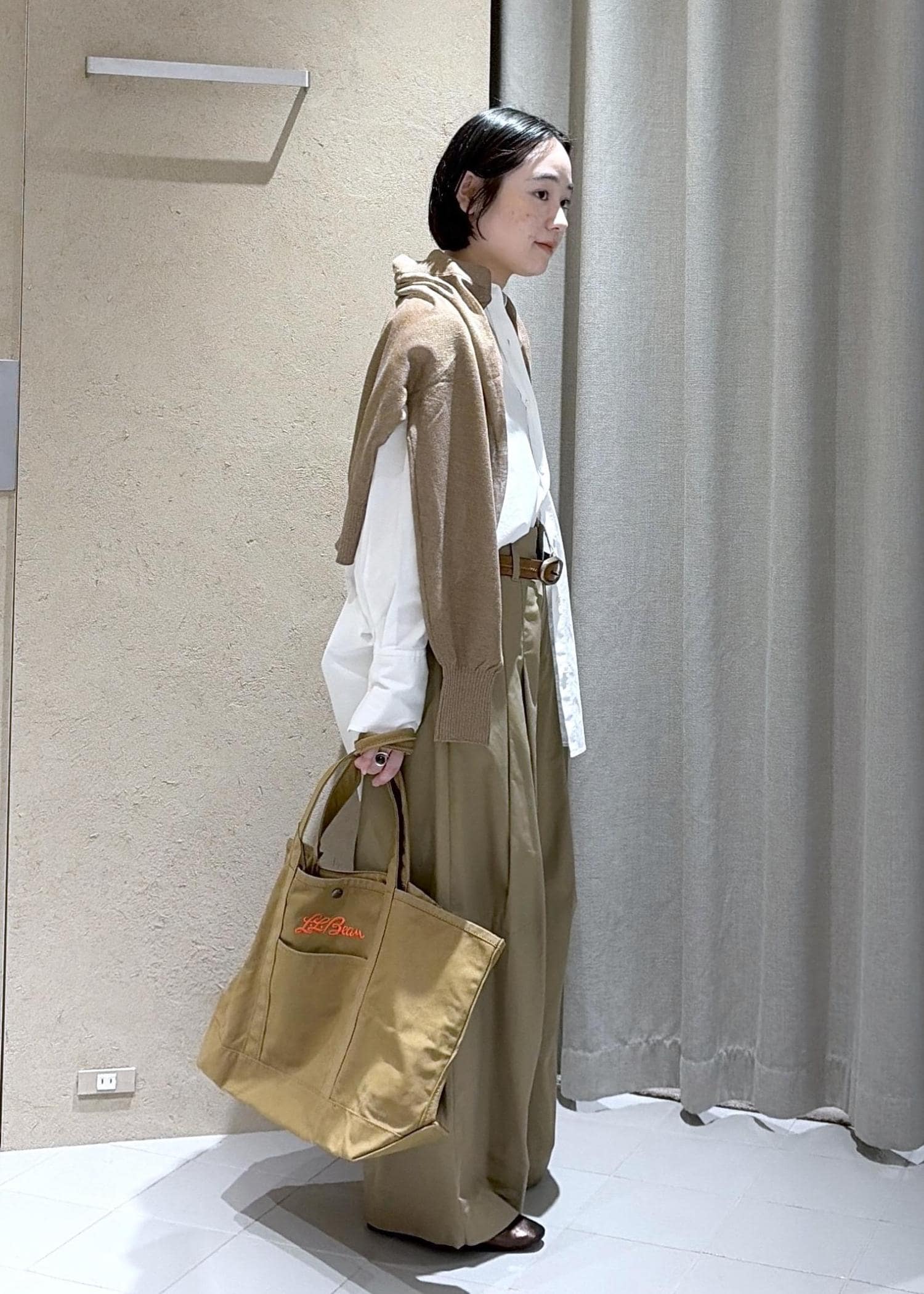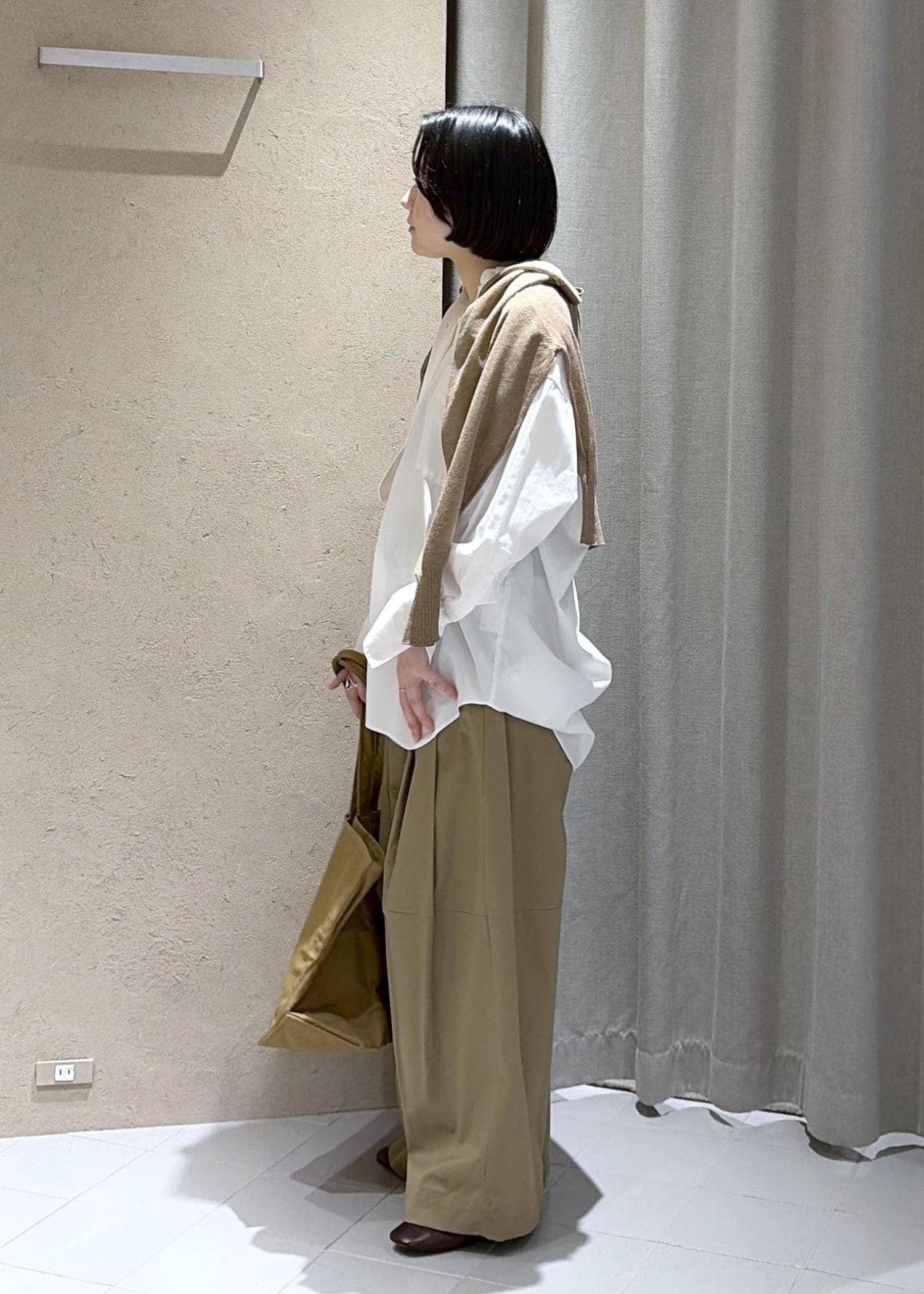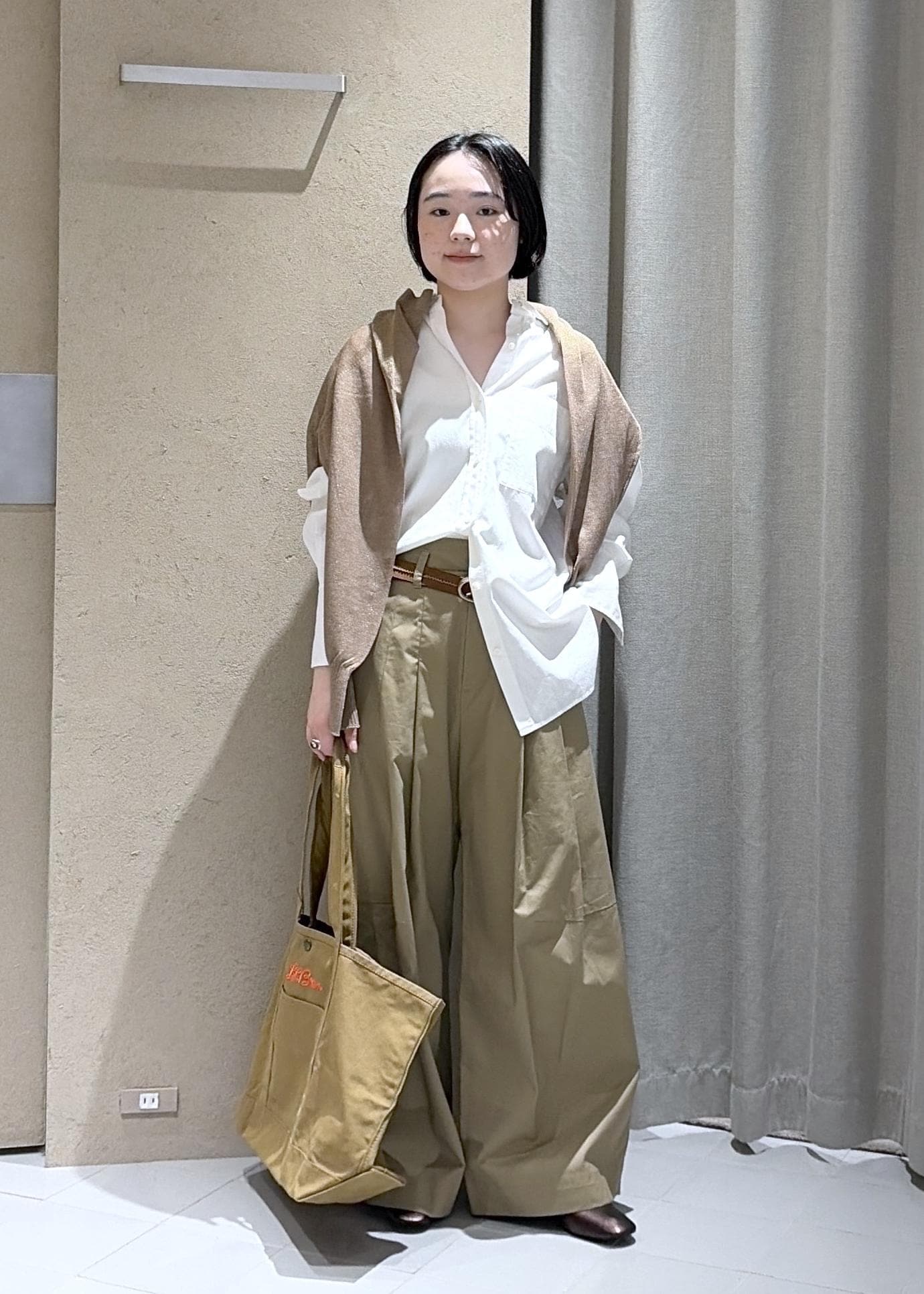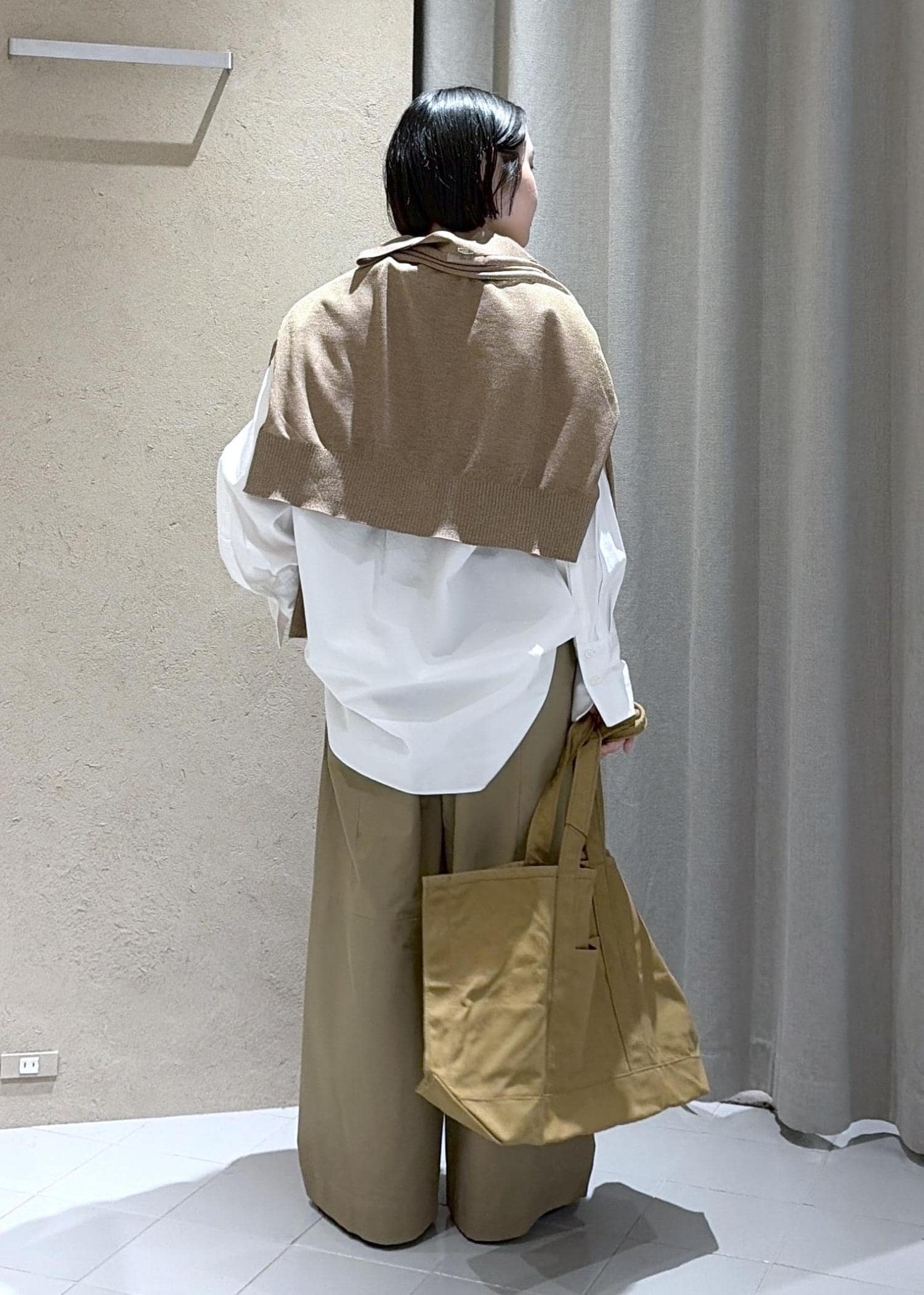 トップスはベーシックなホワイトのシャツで合わせ、春らしい爽やかな雰囲気を意識しました。春さきは気温調節も難しいので重ね着しやすい軽いカーディガンを肩掛けにし、ベーシックなスタイリングにアクセントをプラスしました。