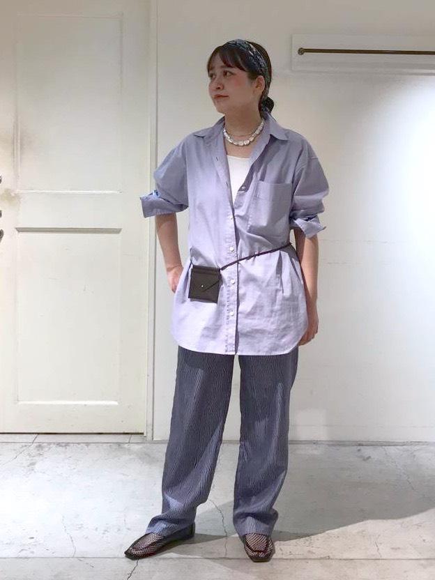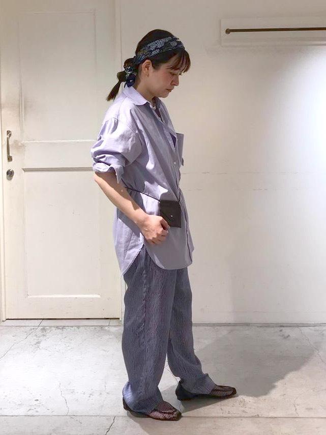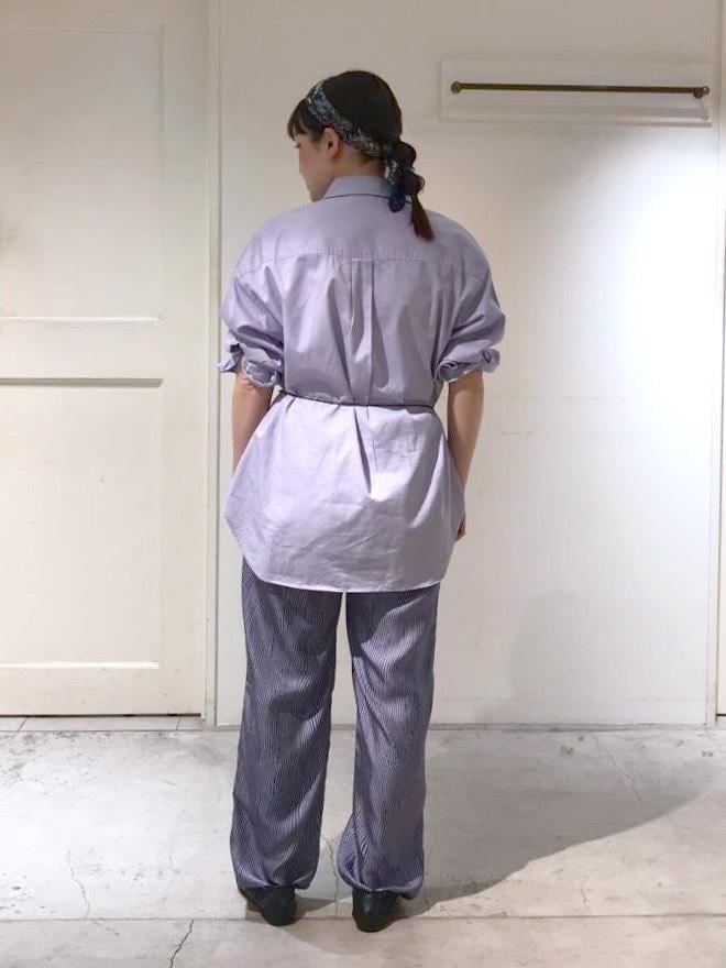爽やかなブルーのシャツと、シルクのストライプブルーのパンツを合わせました。
