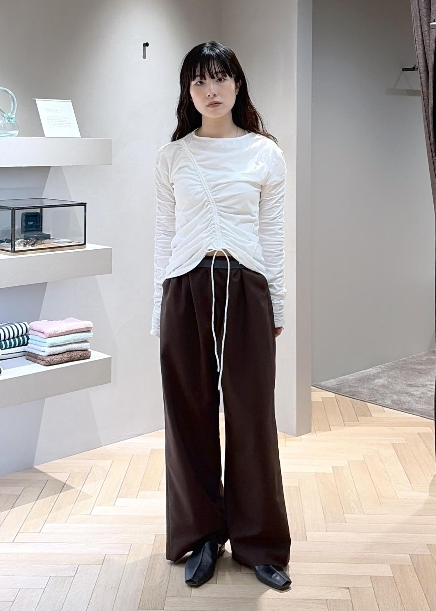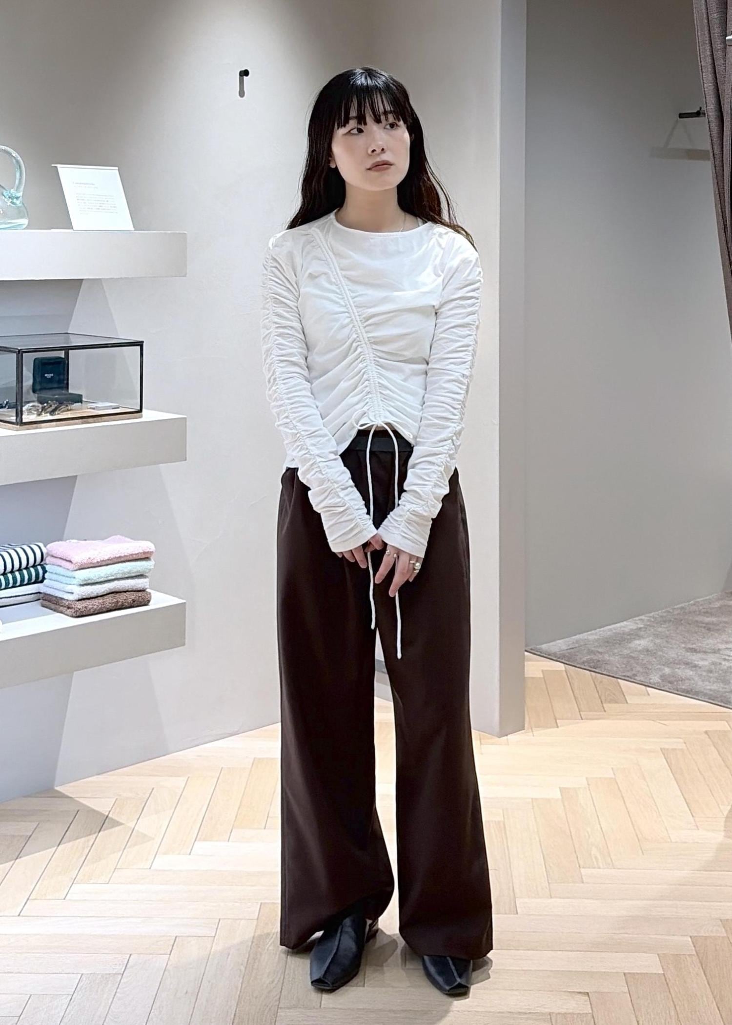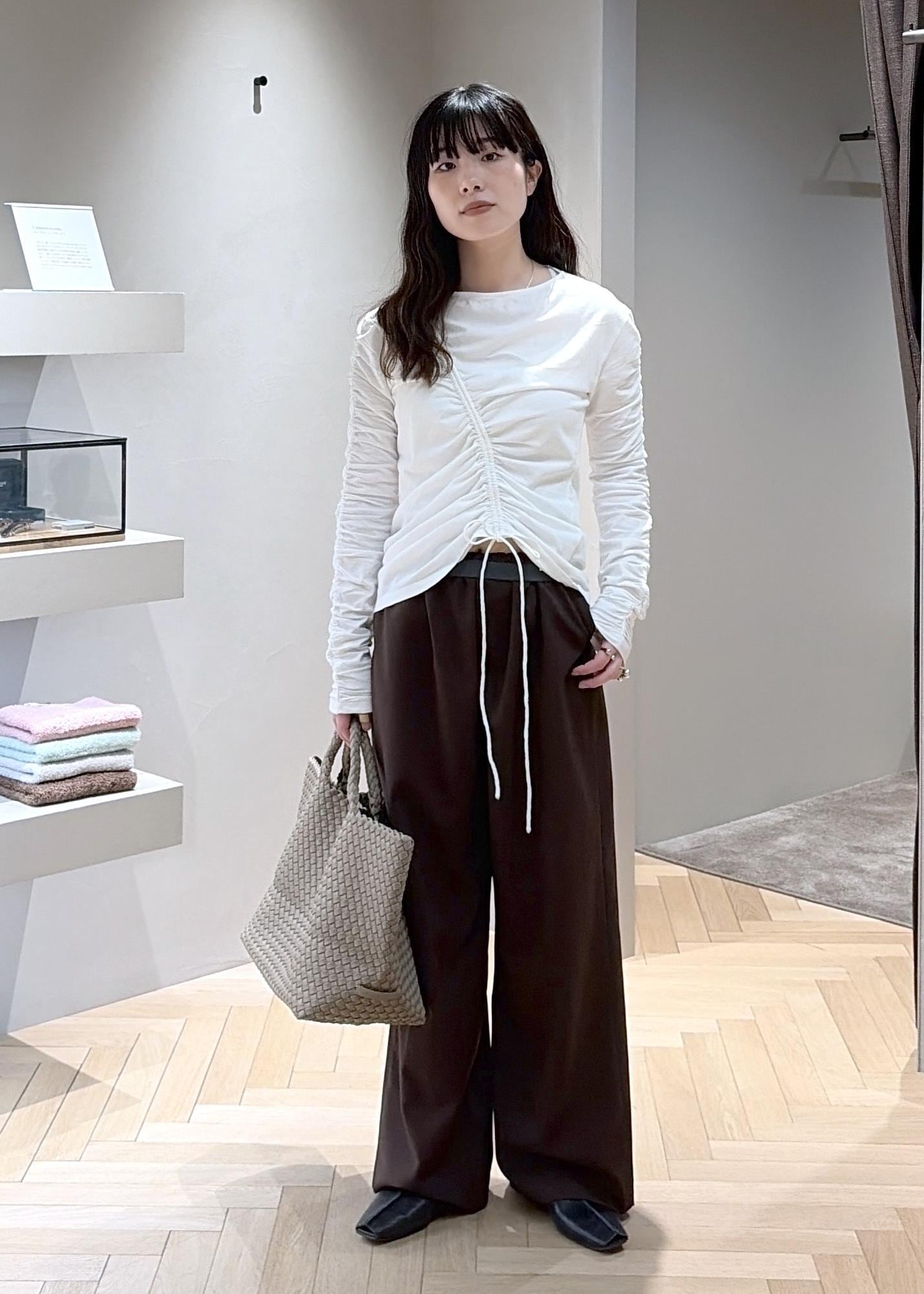 ハリのある素材。ストレスフリーな着心地ですが、ダボっとし過ぎず着用いただけます。サイドのラインもポイントです。 -