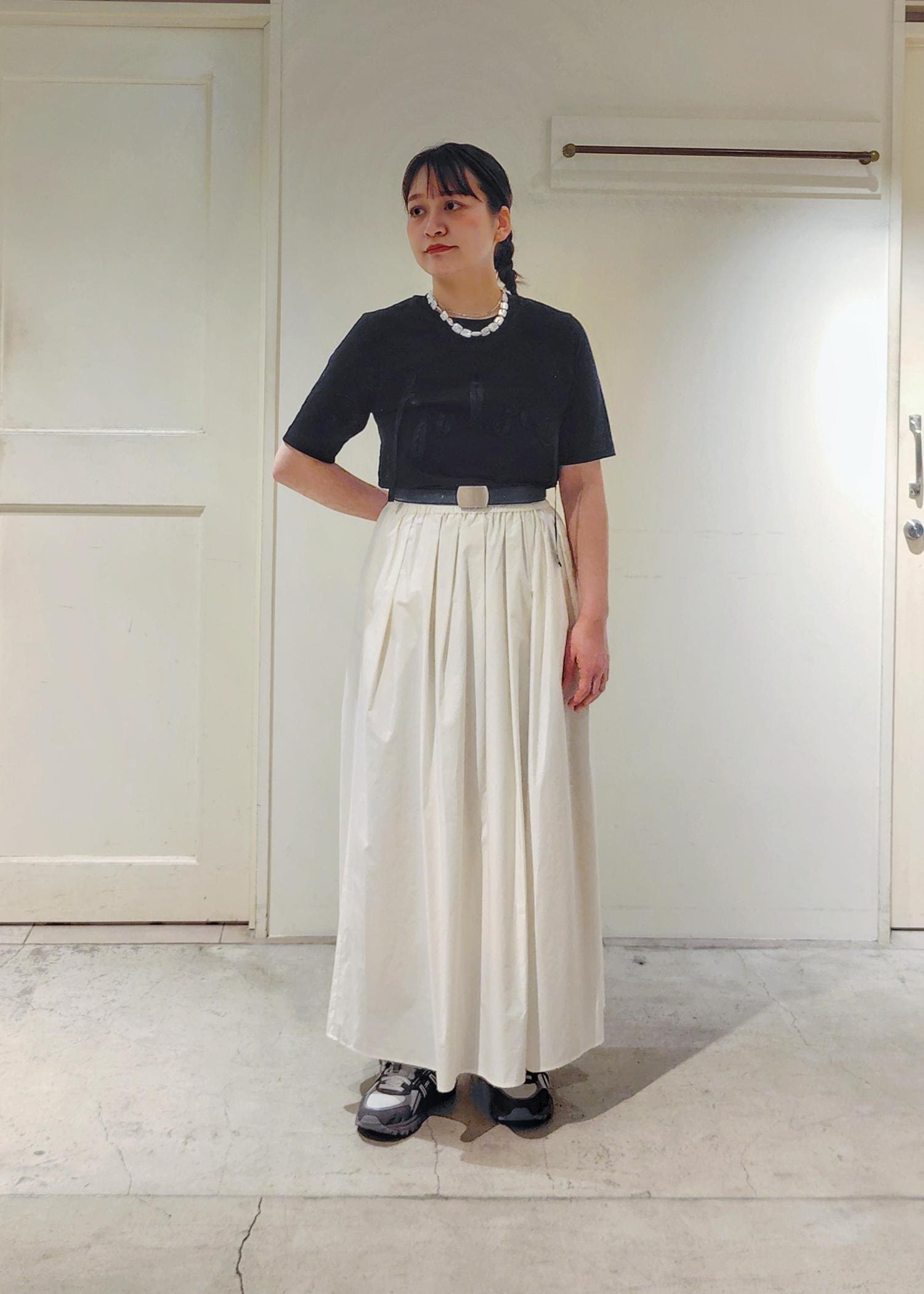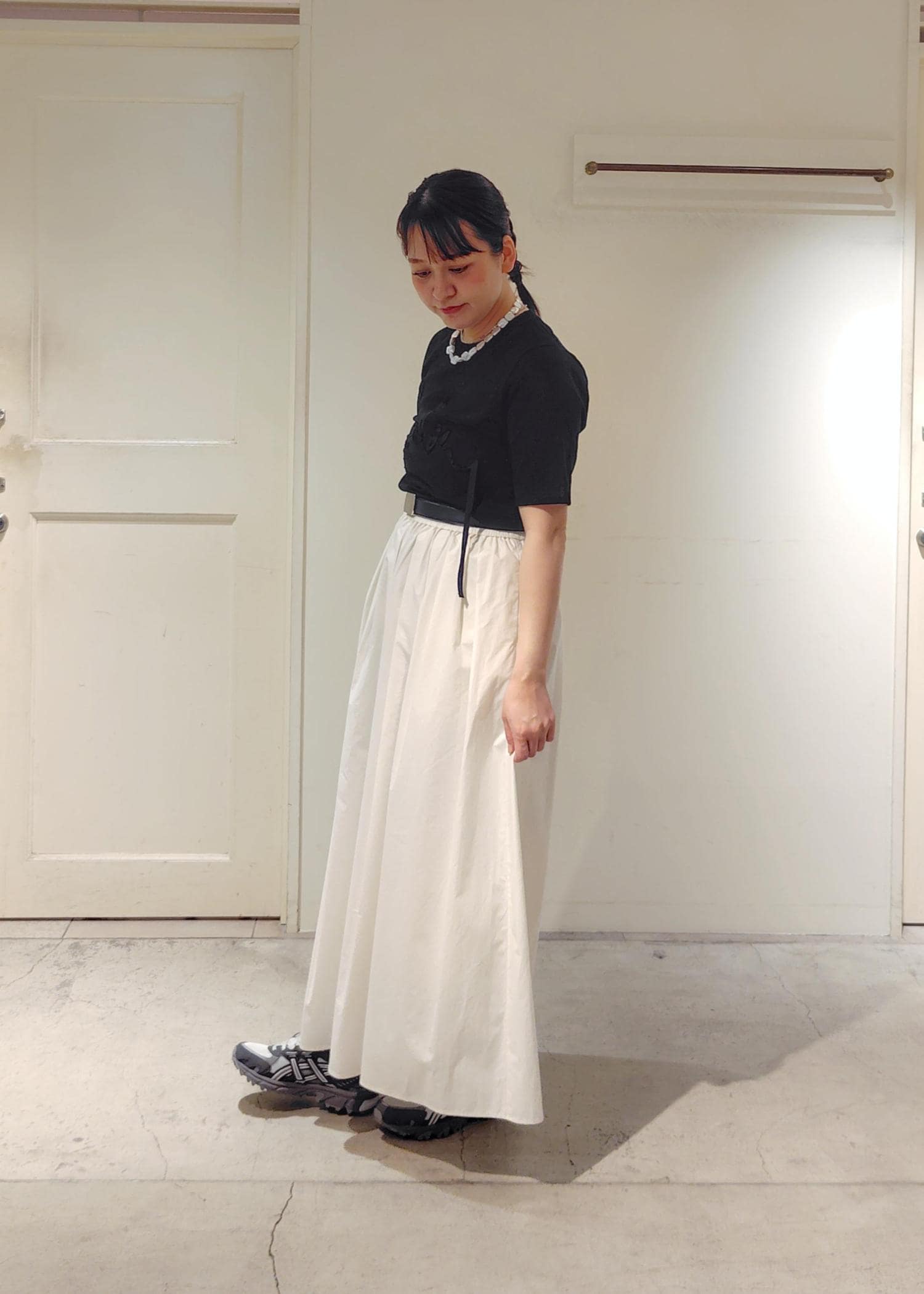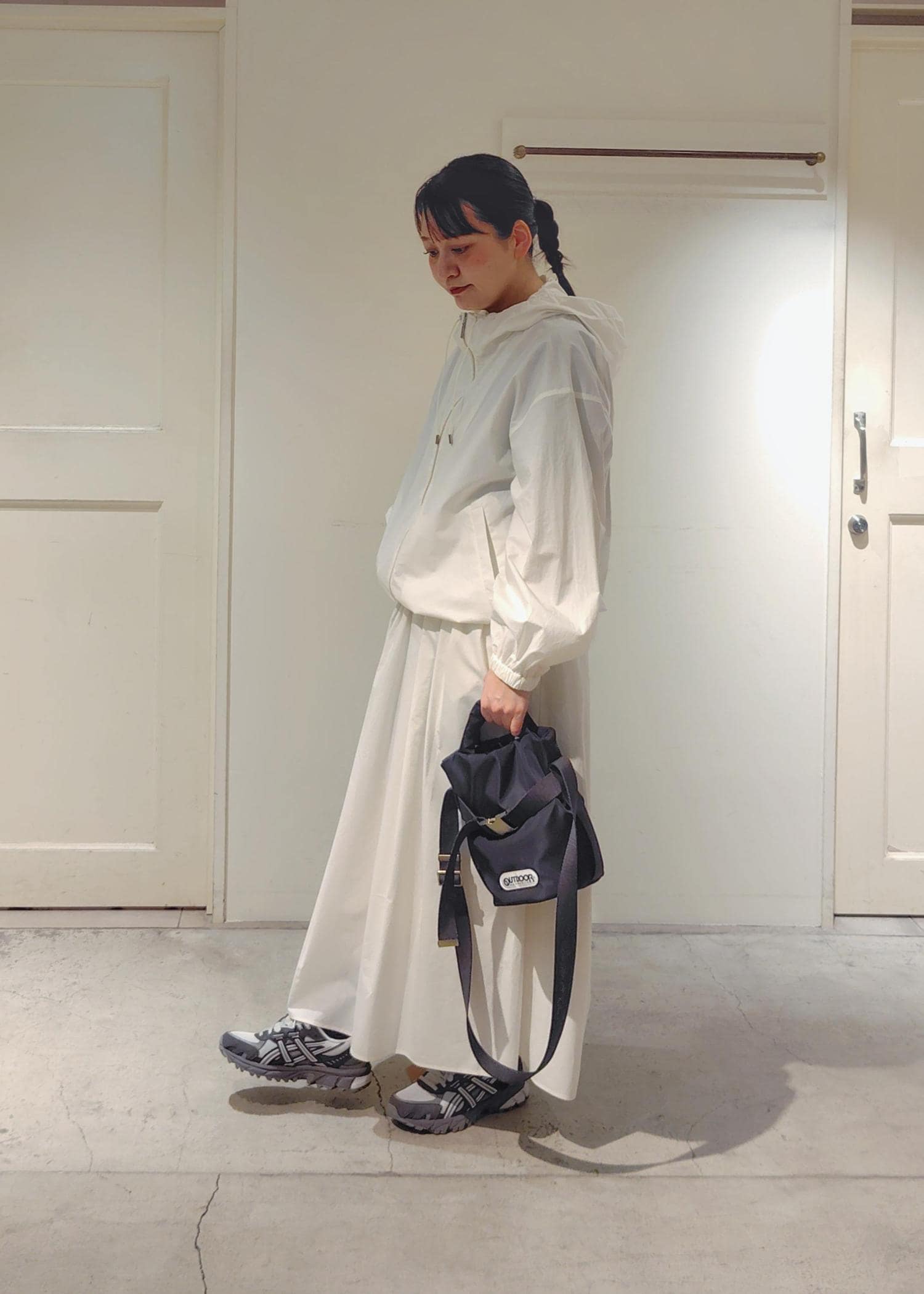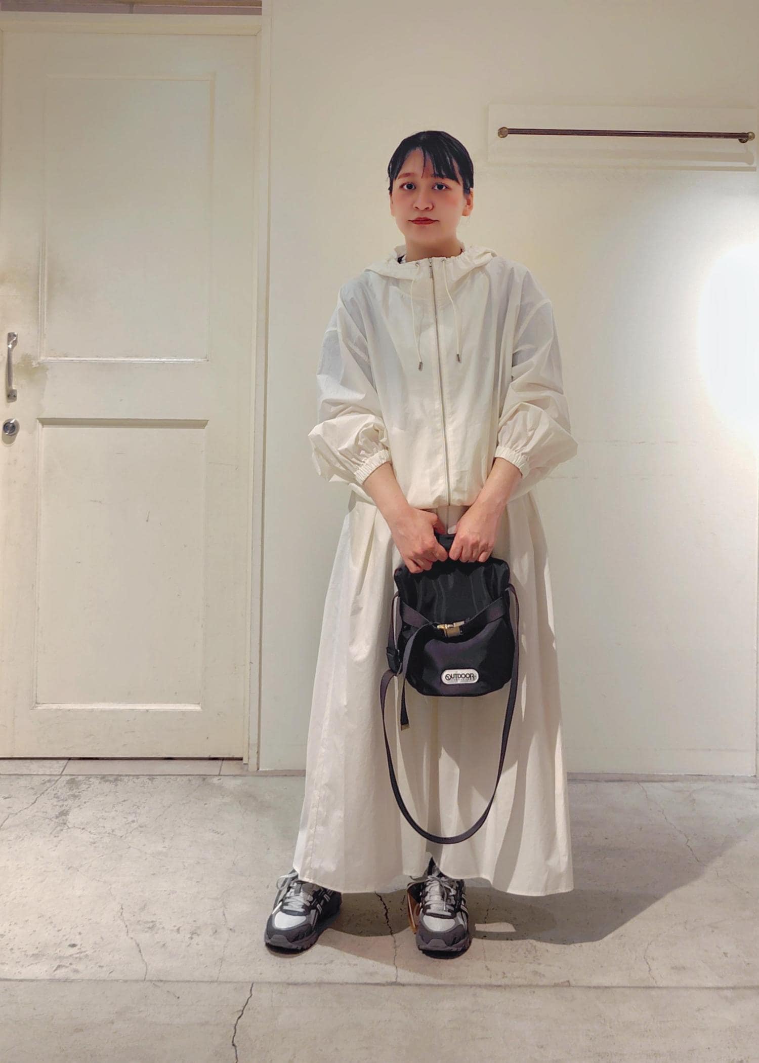 パーカーの中は黒のTシャツで合わせましたが、スカート、パーカーが白なので、
