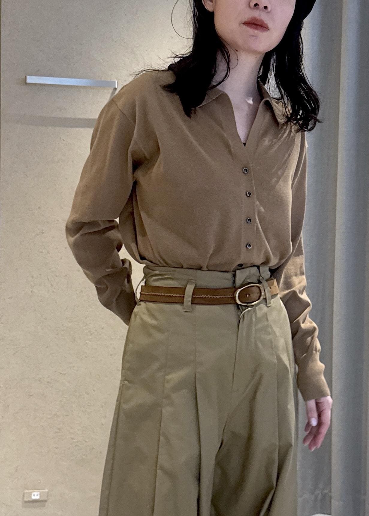 襟元がVネックでスキッパーデザインなのでパンツスタイルでもカジュアル過ぎずに決まります◎