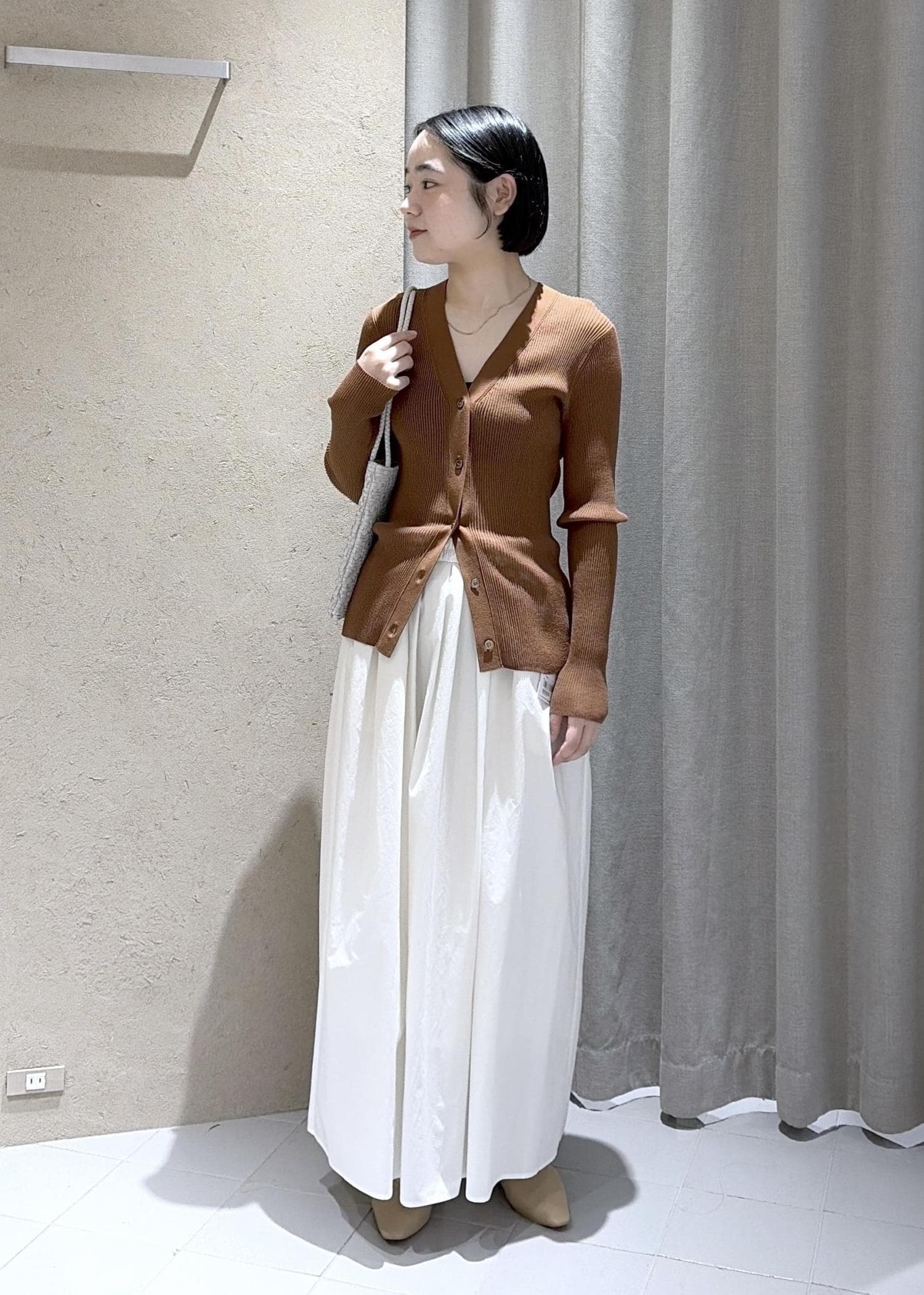 深いVネックのカーディガンが首元もかなりスッキリ見えアクセサリーも映えそうです。体のラインが綺麗に見えるサイジングでボトムも選ばず着ていただけます。