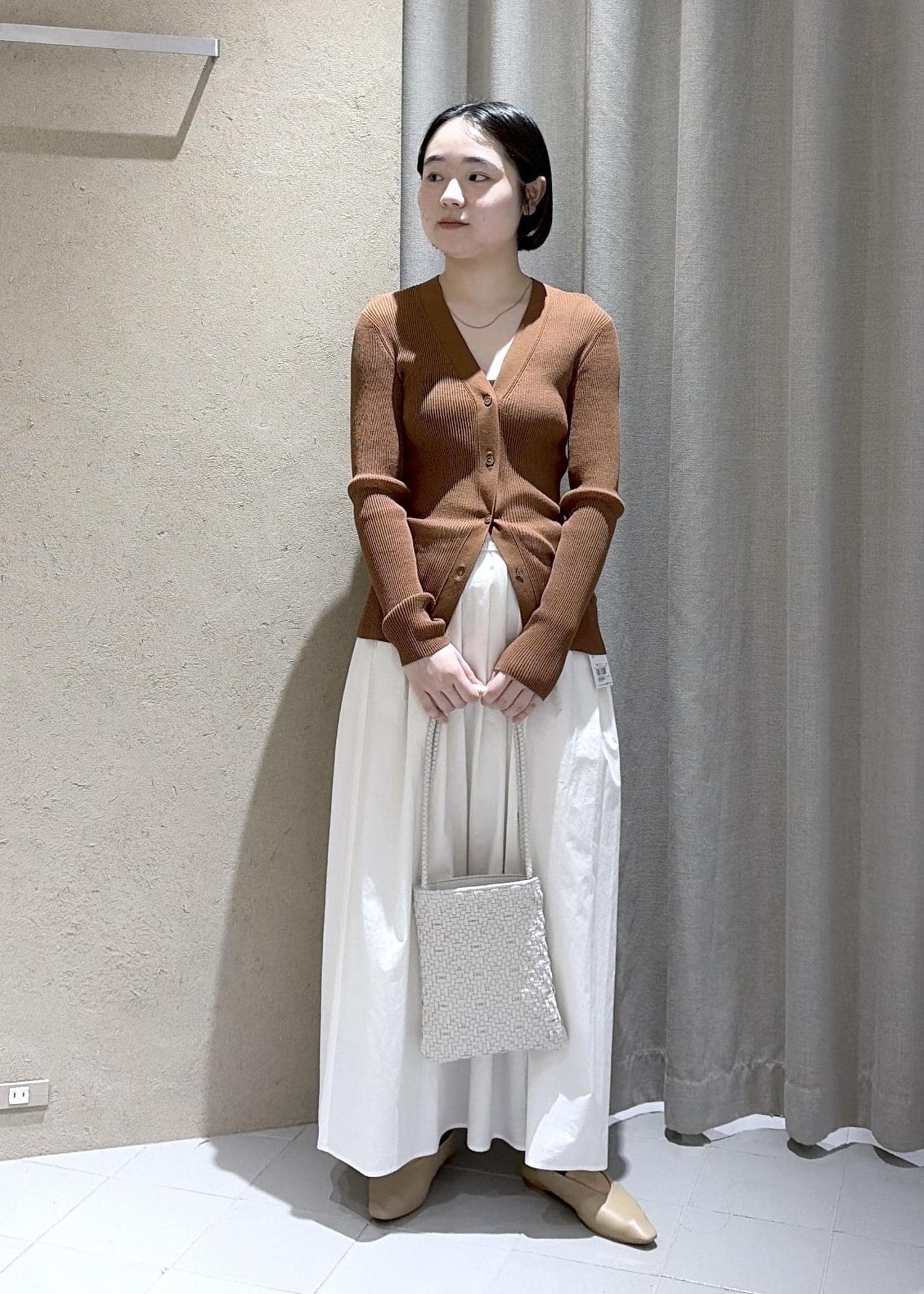 今回はオンライン限定アイテムのカーディガンを使って、初夏までおすすめしたいフェミニンコーディネートをご紹介。