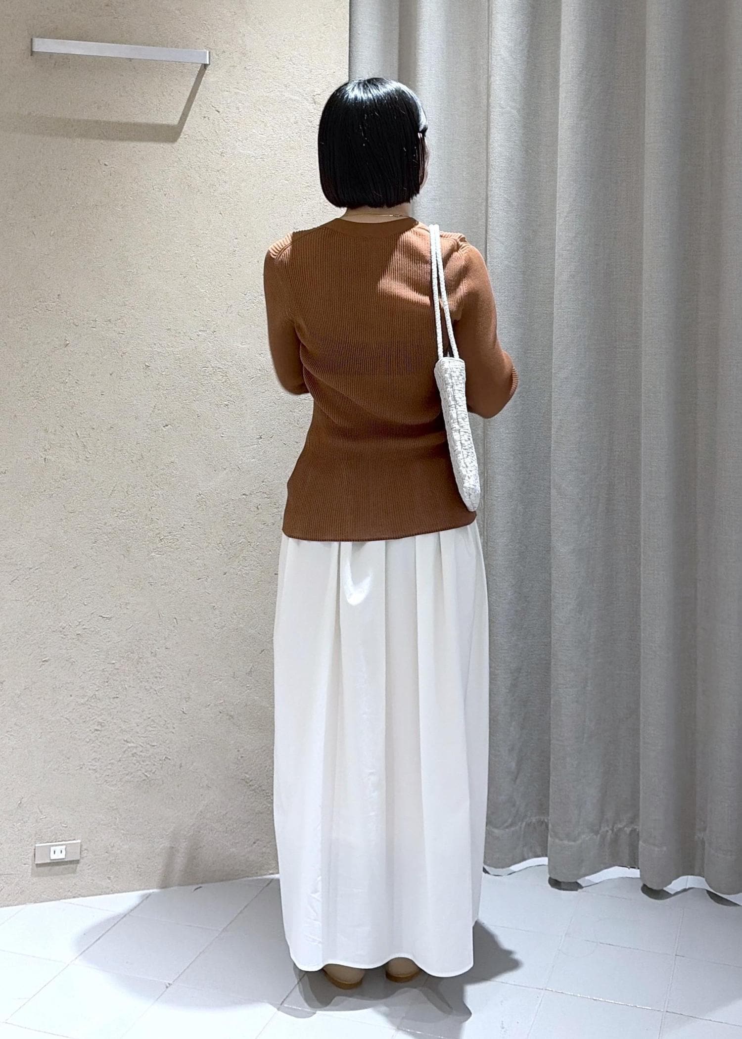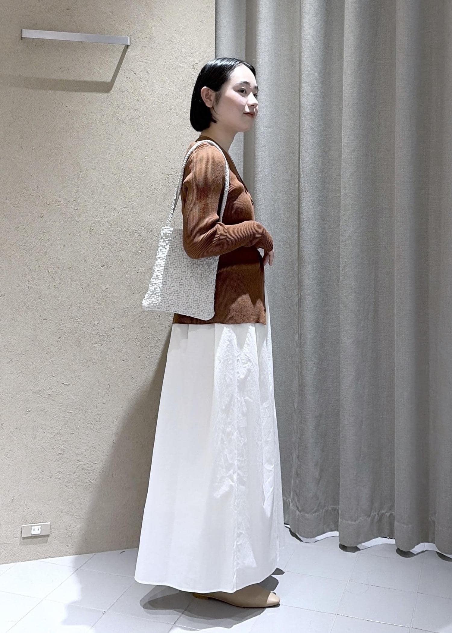 今回はフェミニンに、ホワイトのコットンスカートで合わせみました。たっぷりとギャザーが入ったスカートで動きも綺麗にでるのでシューズはシンプルなフラットパンプスで合わせてみました。