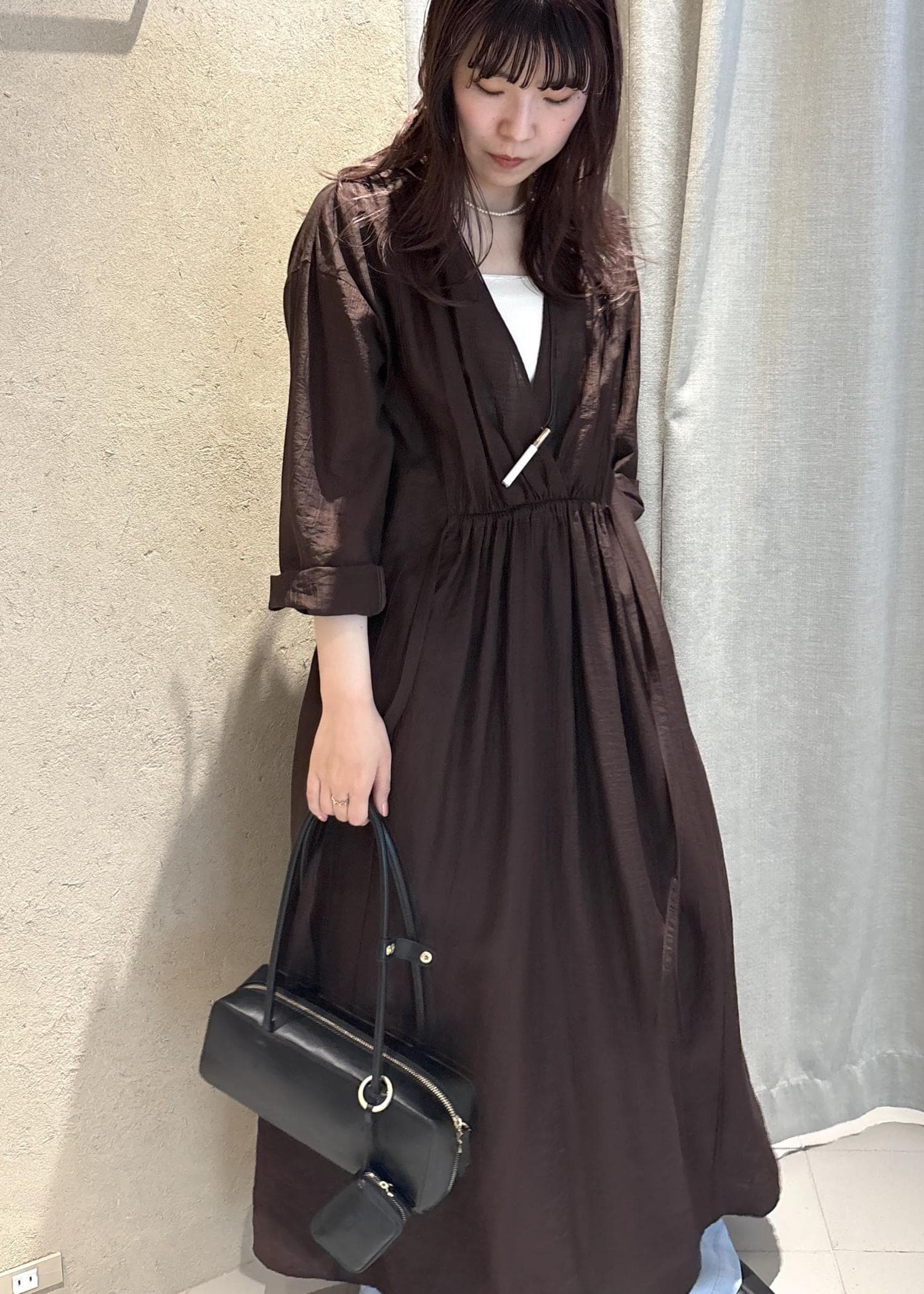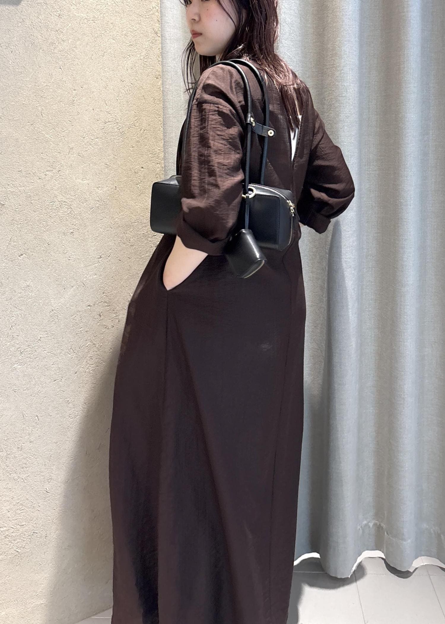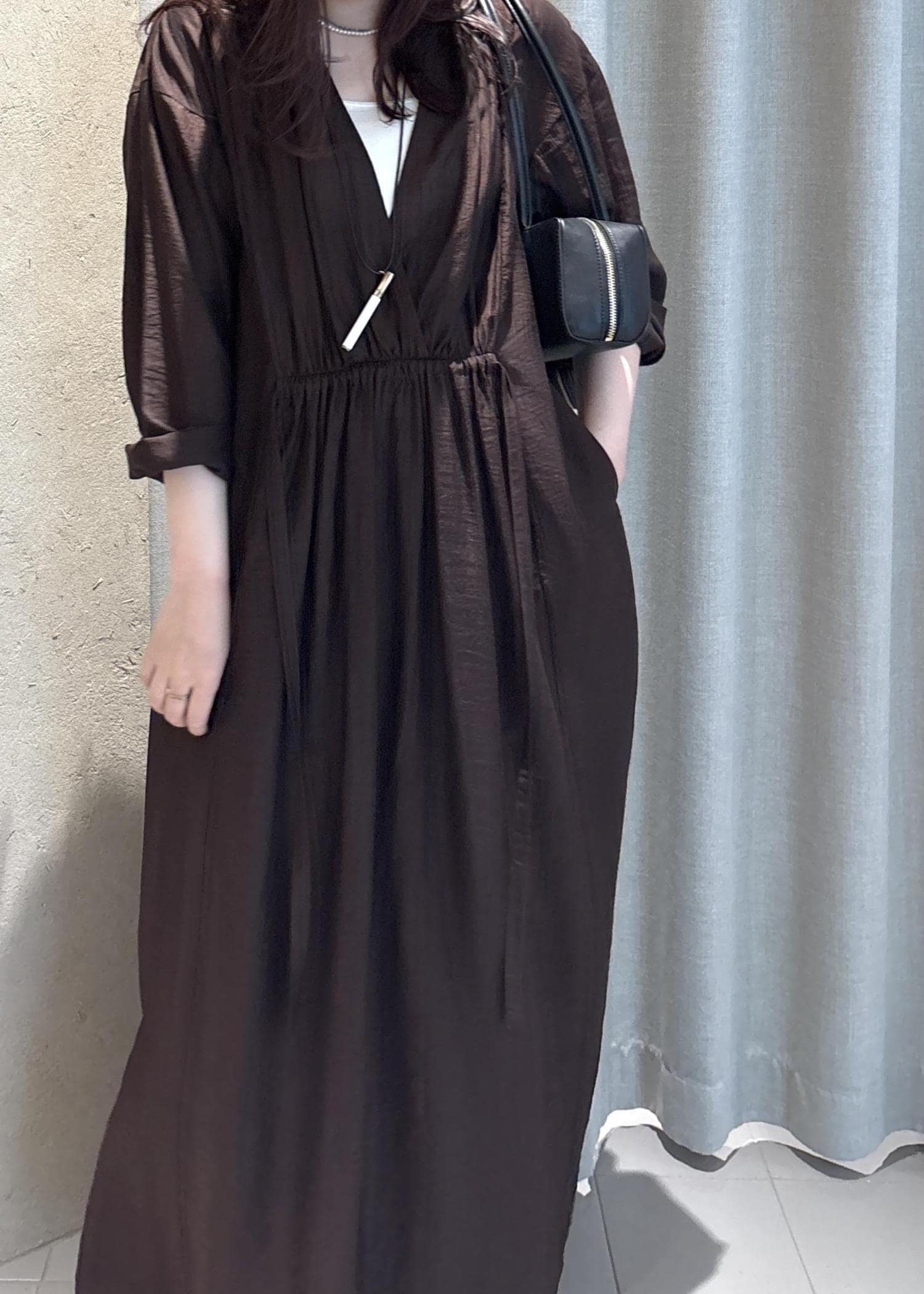 SALON adam et ropé【WEB限定】サブリエギャザーワンピースブラウン / F¥25,300レビューとにかく軽くて着心地が良いワンピース。柔らかい素材なので少し透けますが、パンツとレイヤードが楽しめる1枚となっています。梅雨の時期や初夏まで快適に着られます。