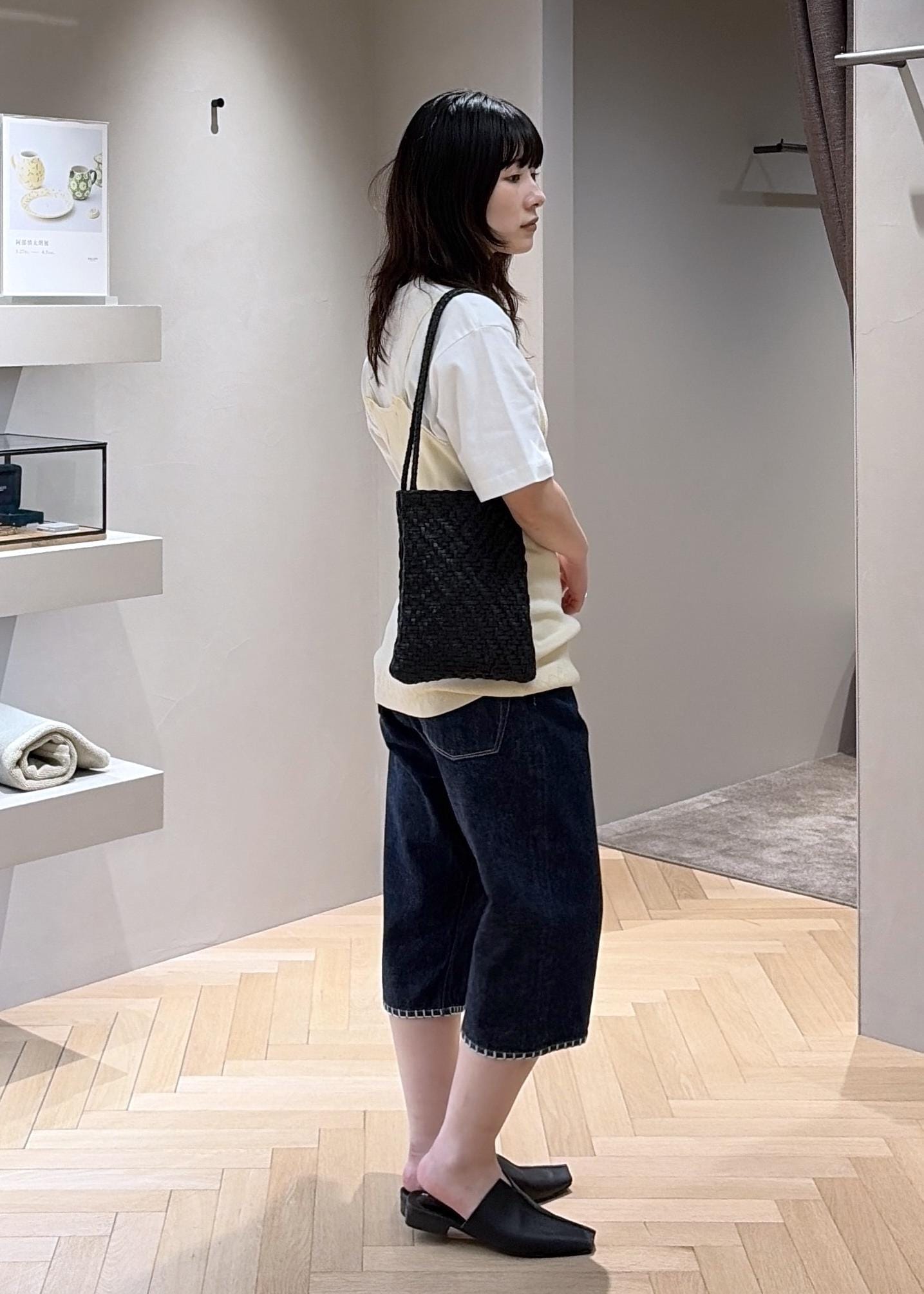 柔らかな羊革を使用。ひとつひとつ手編みで使っていくうちにしなやかになります。肩がけもできるので小さめのサブバッグとしても使えます。