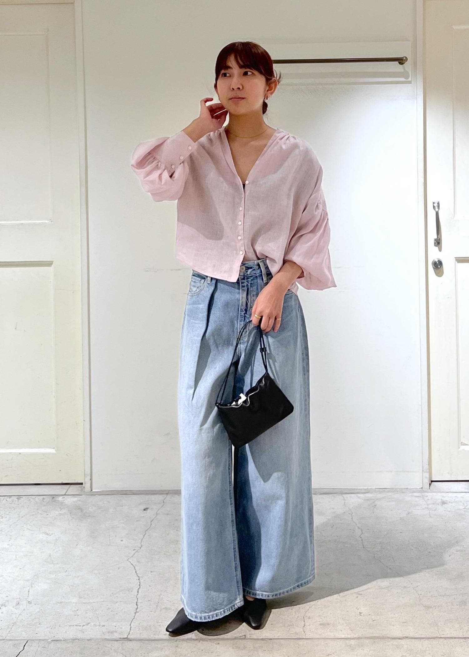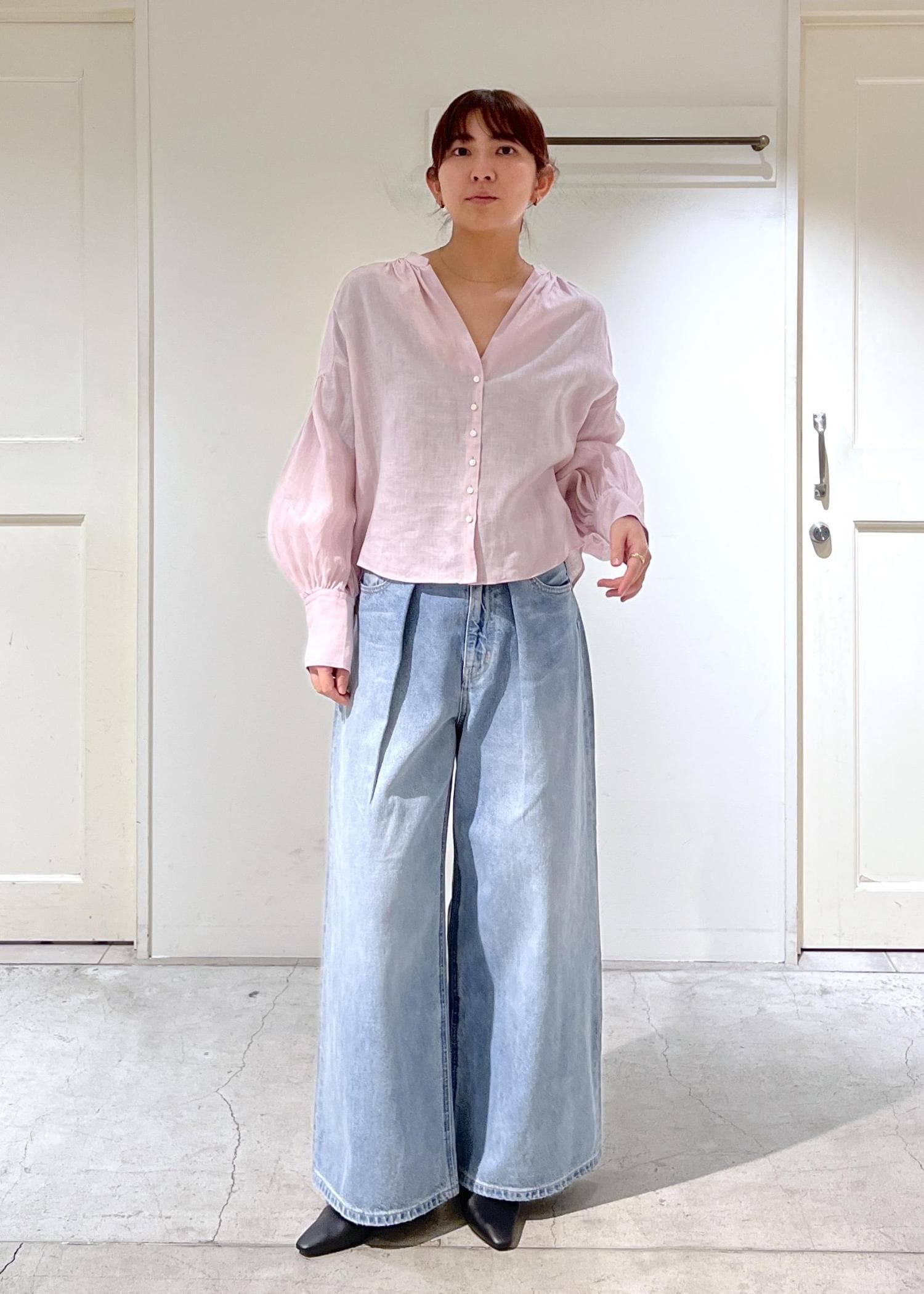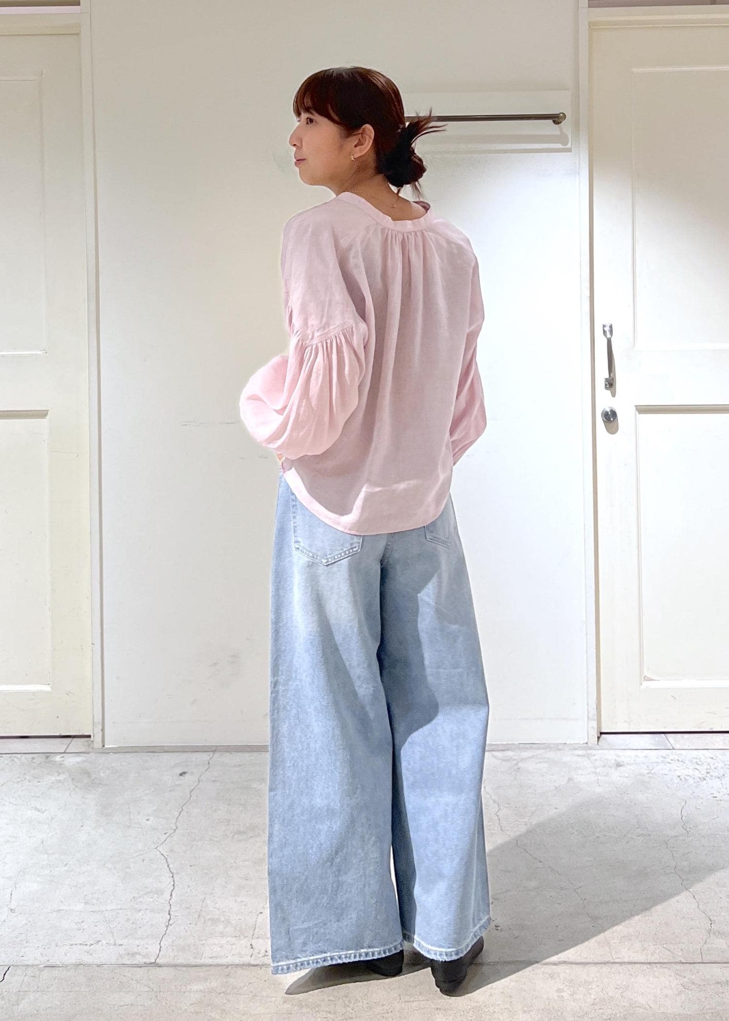 SALON adam et ropéリネンスキッパーギャザーブラウス / GENTLE LINEN 新色追加ピンク / F¥22,000レビュー丈はやや短めでパンツのウエストにかかるほど。