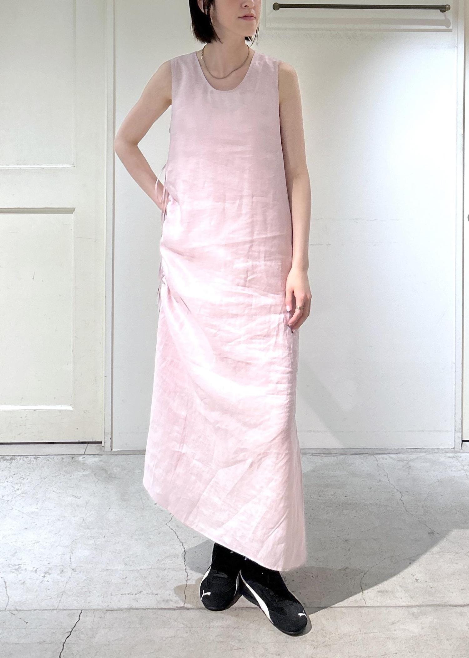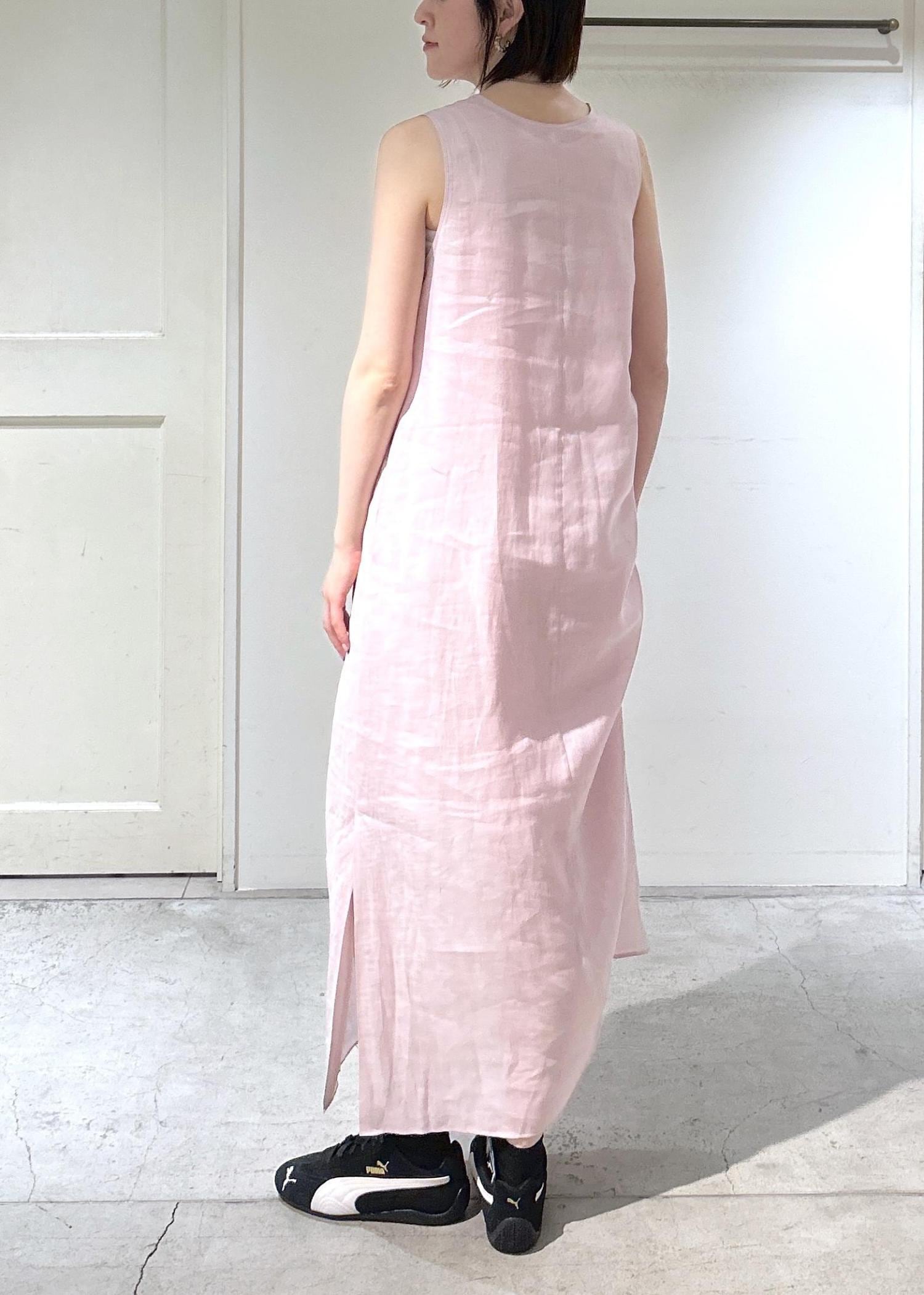 SALON adam et ropéリネンドロストノースリーブワンピース / GENTLE LINENピンク / F¥29,700レビュー身長171cmでふくらはぎ下くらいの丈の長さです。リネン素材なので、サラサラしていてとても着やすいです。アームホールは広めなので、インナーがあると安心です。膝上丈のペチコートもついているので、下着は透けにくいです。