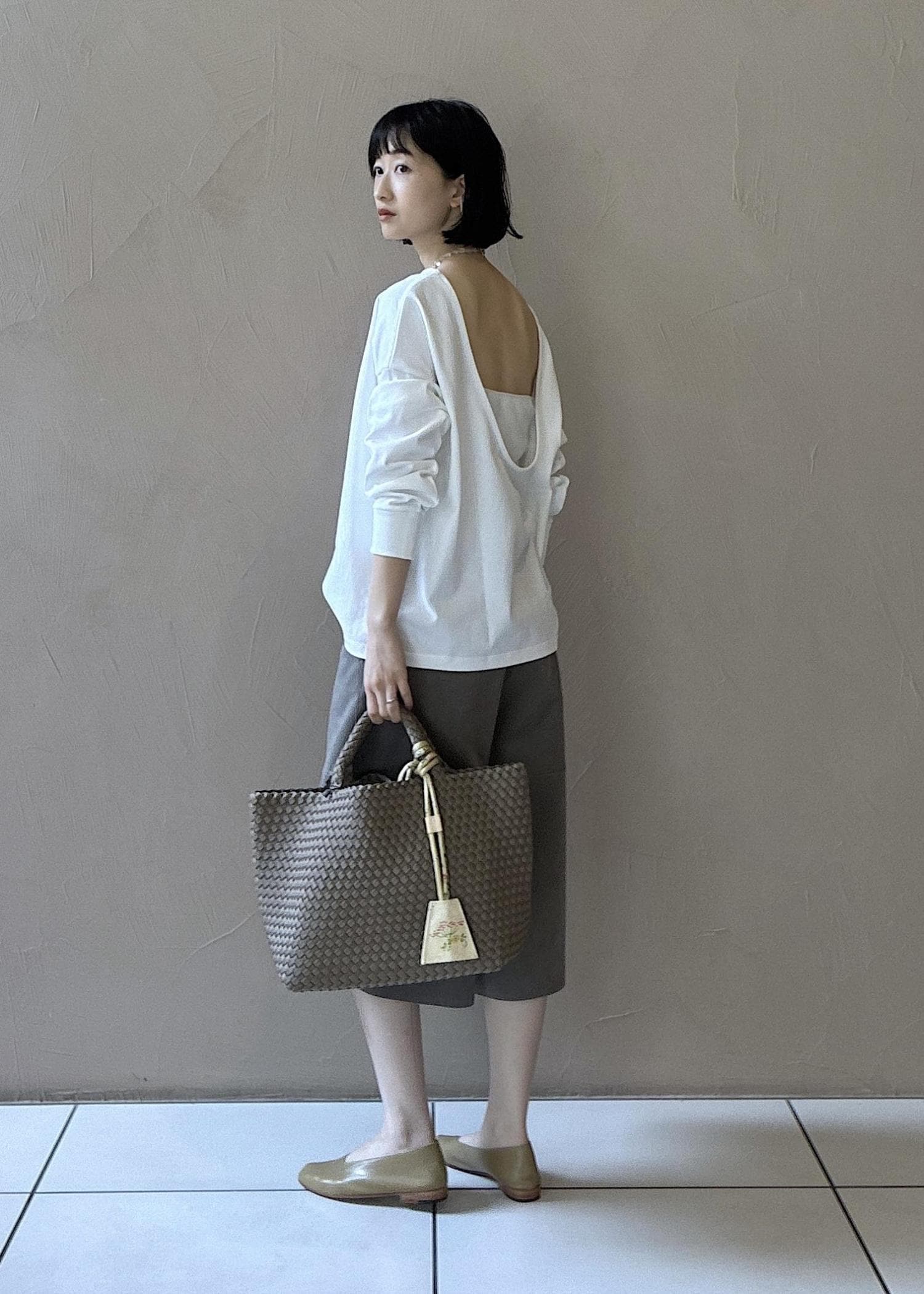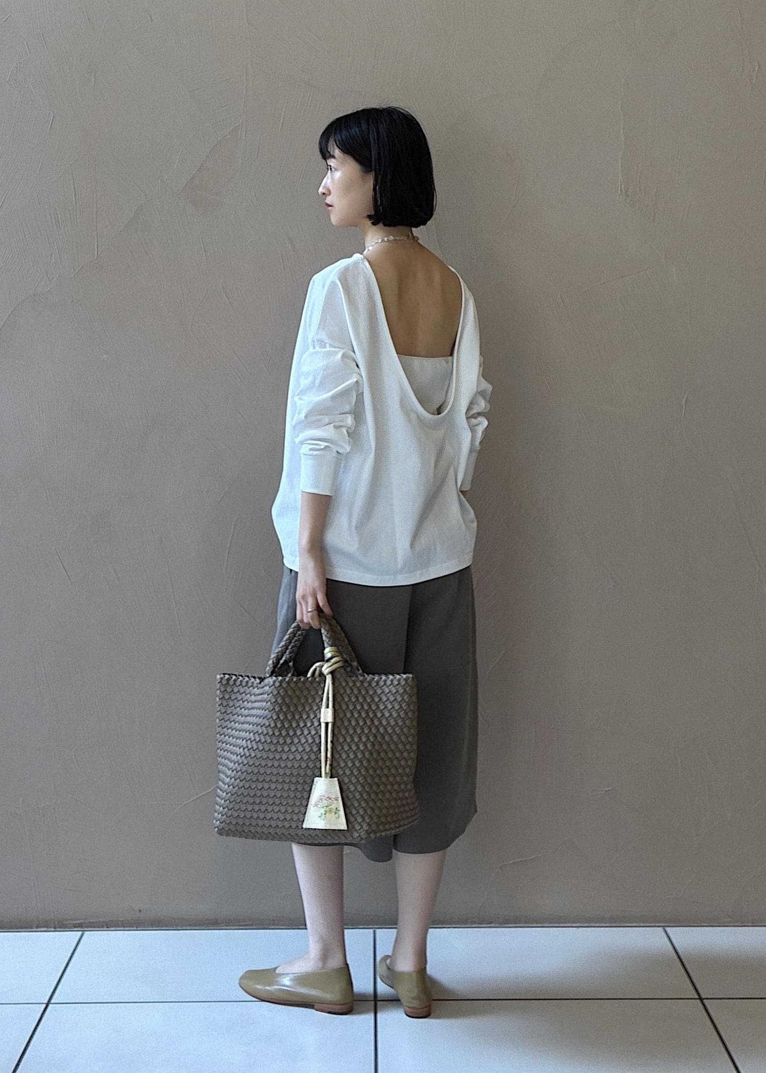 トップスもシンプルに見えて背中ががっつり開いているのが素敵です。