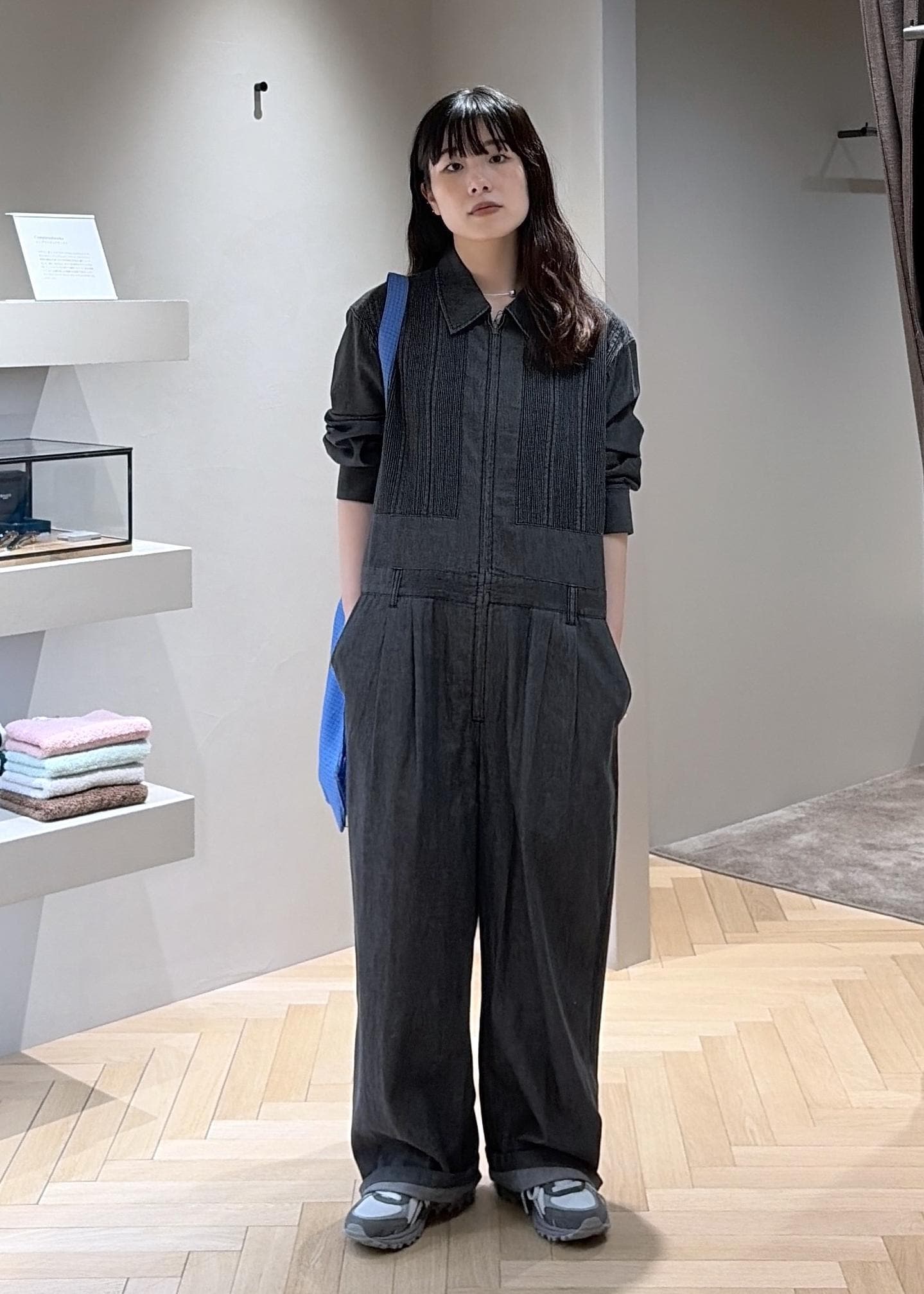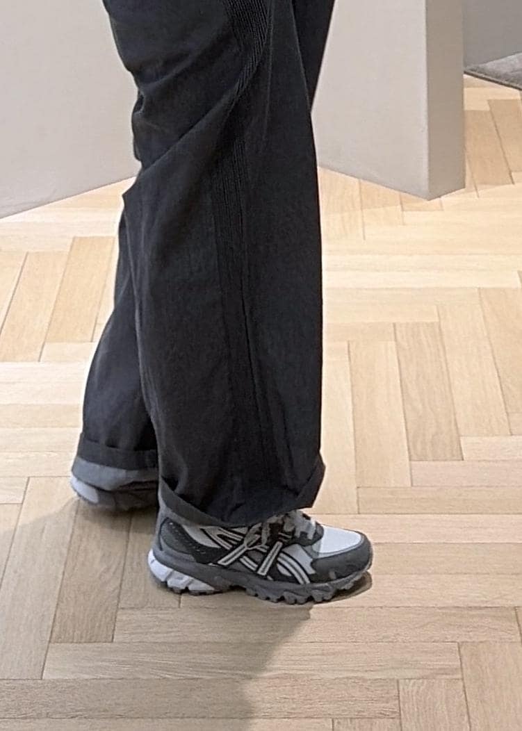 全体的なオーバーサイズ。自身の身長だとスニーカーで程よい裾の余り具合です。ぺたんこ靴だと裾がつきます。