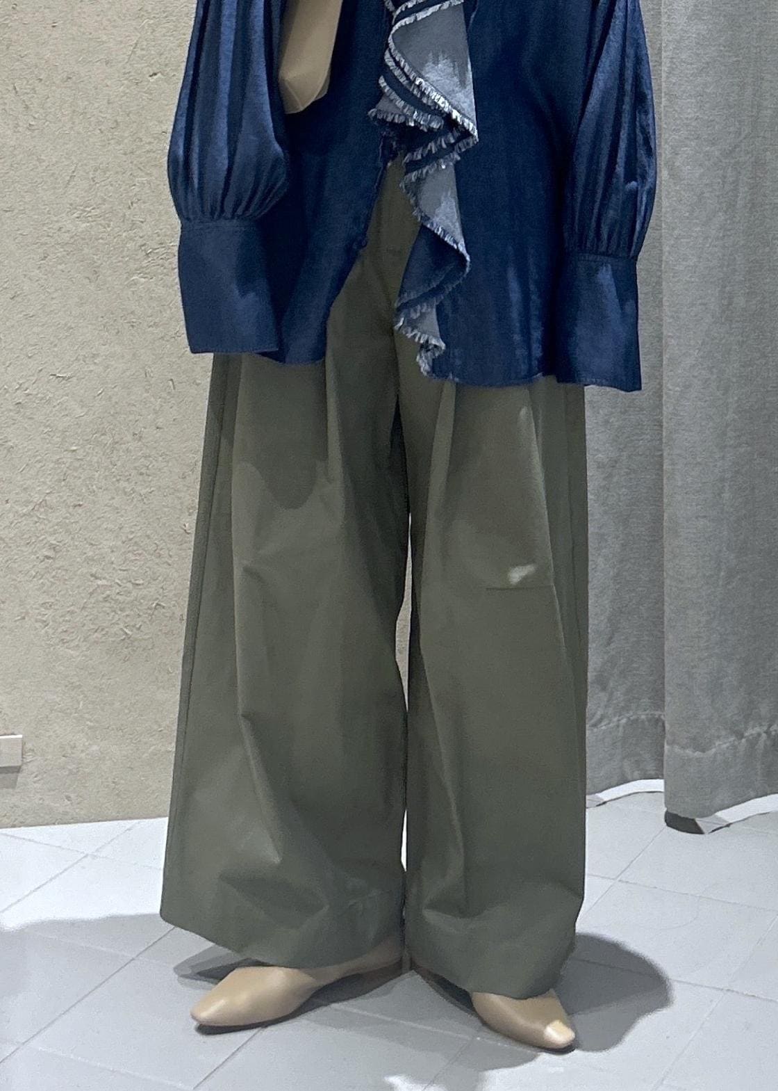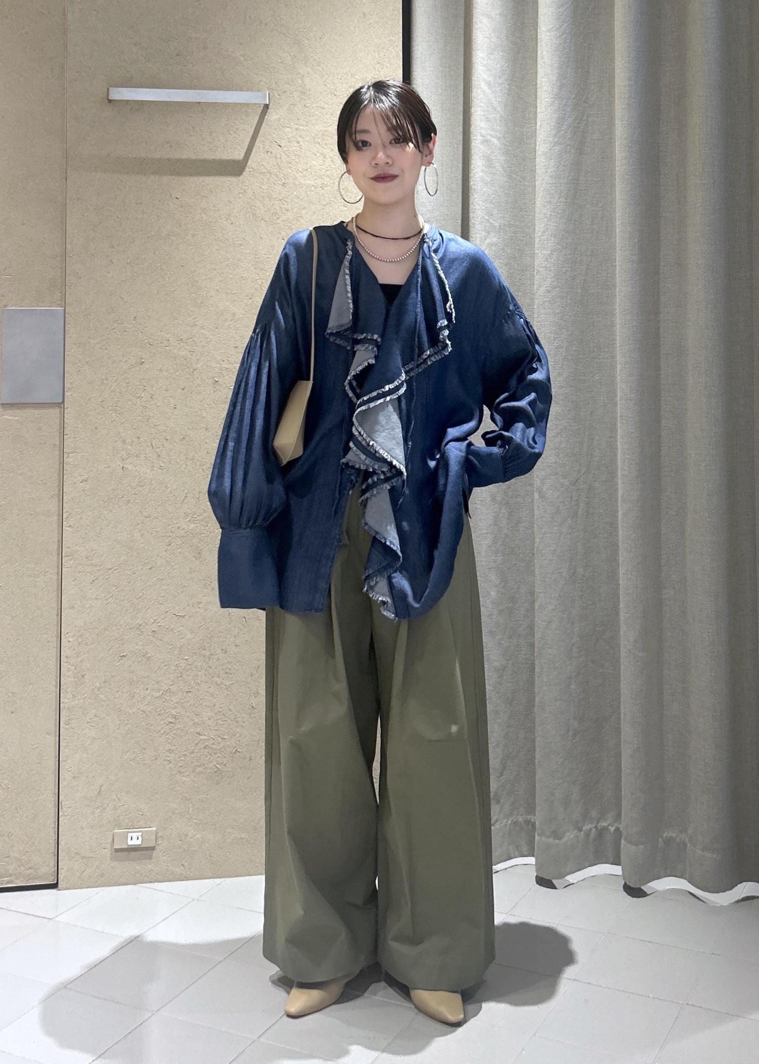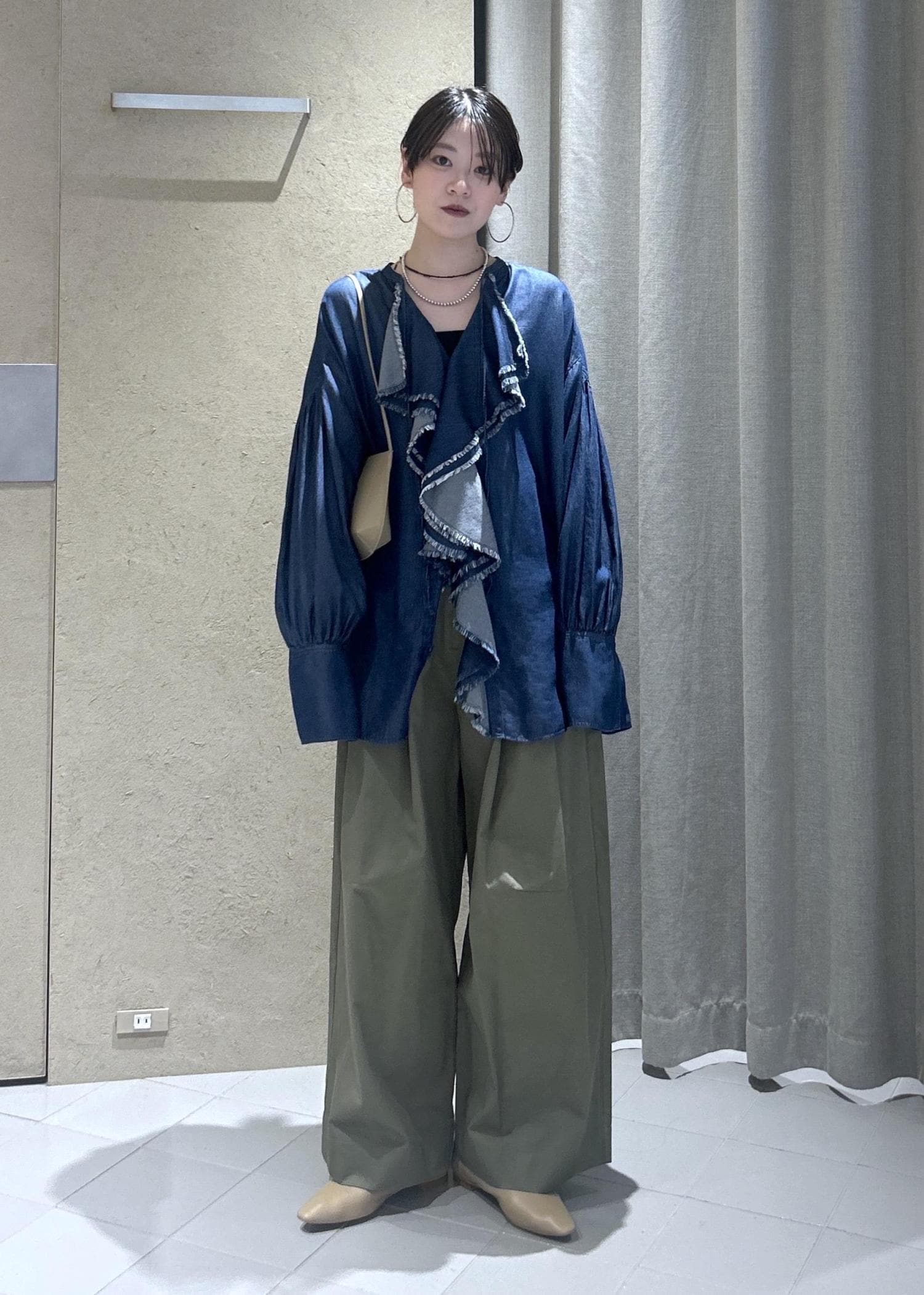甘さのあるブラウスですが、デニムライクな生地感なのでカジュアルボトムと相性◎