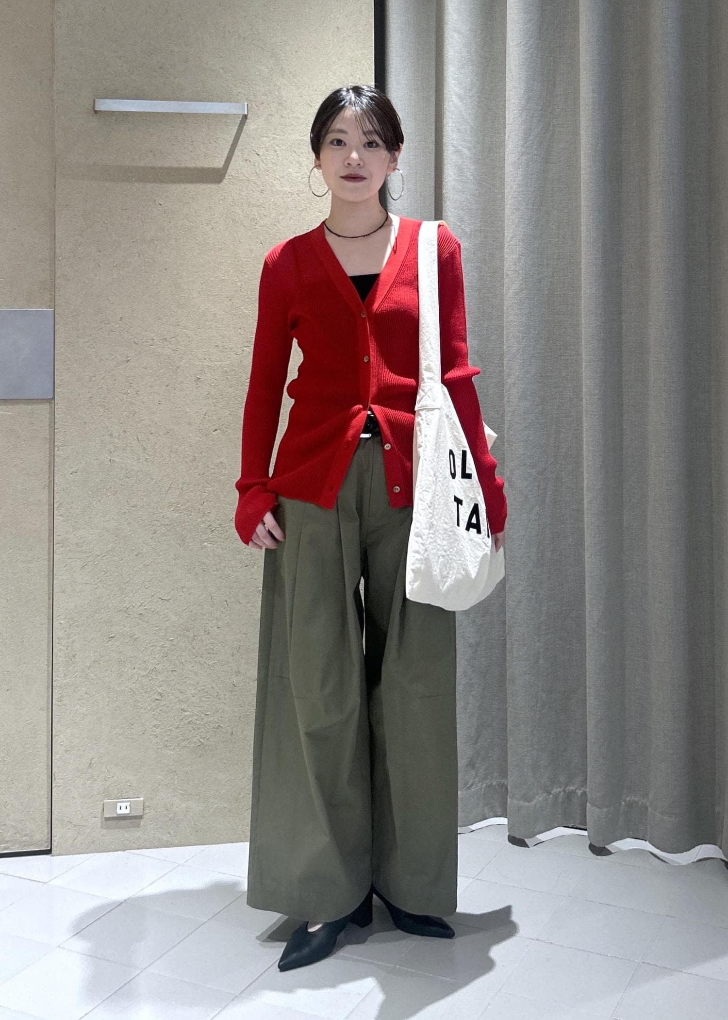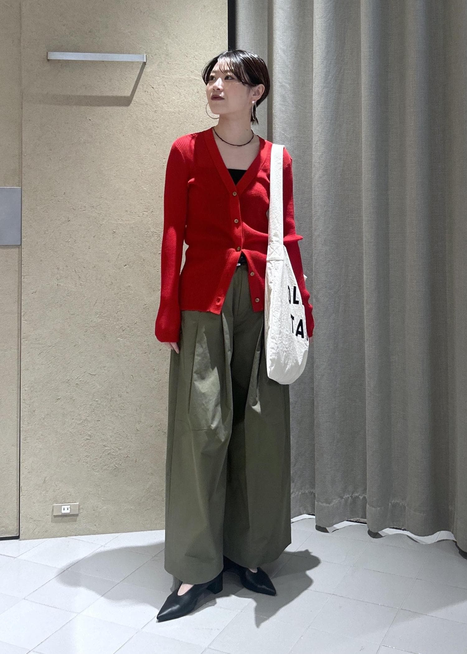 鮮やかなレッドをアクセントカラーにして、シックカジュアルなスタイルにまとめました。