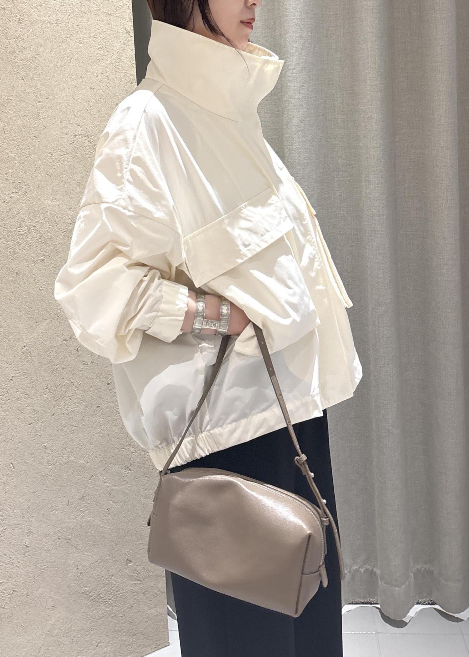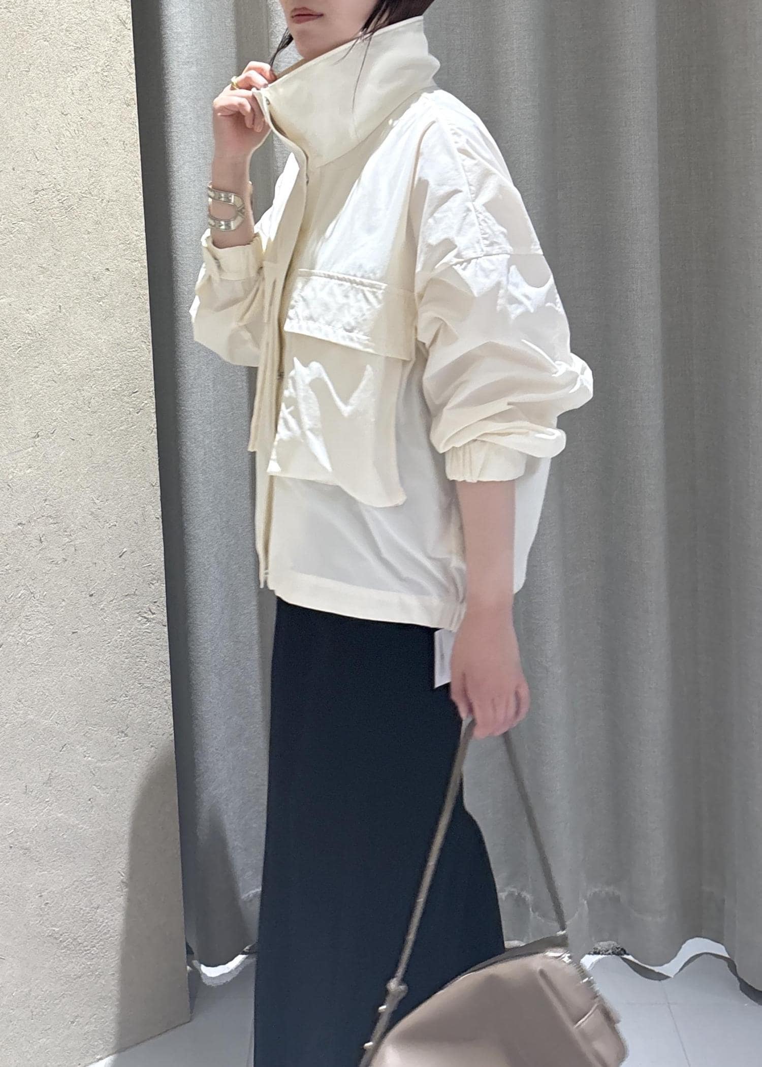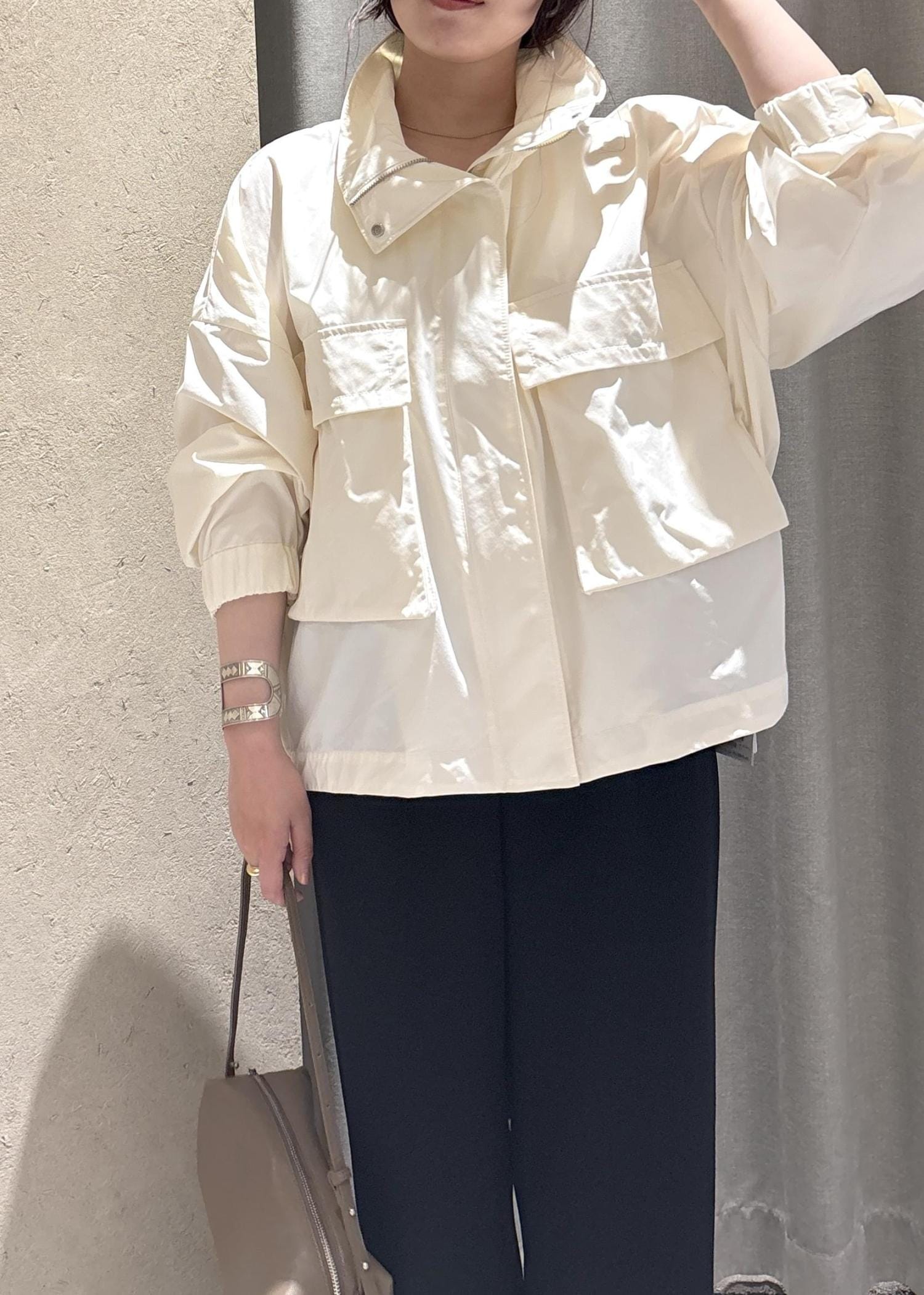SALON adam et ropéリモンタナイロン / スタンドカラーブルゾンオフホワイト / F¥39,600レビューとっても軽いです!生地もしっかり丈夫なのでスポーティすぎず、大人カジュアルなスタイリングにぴったりです。梅雨のシーズンでも使いやすいです◎