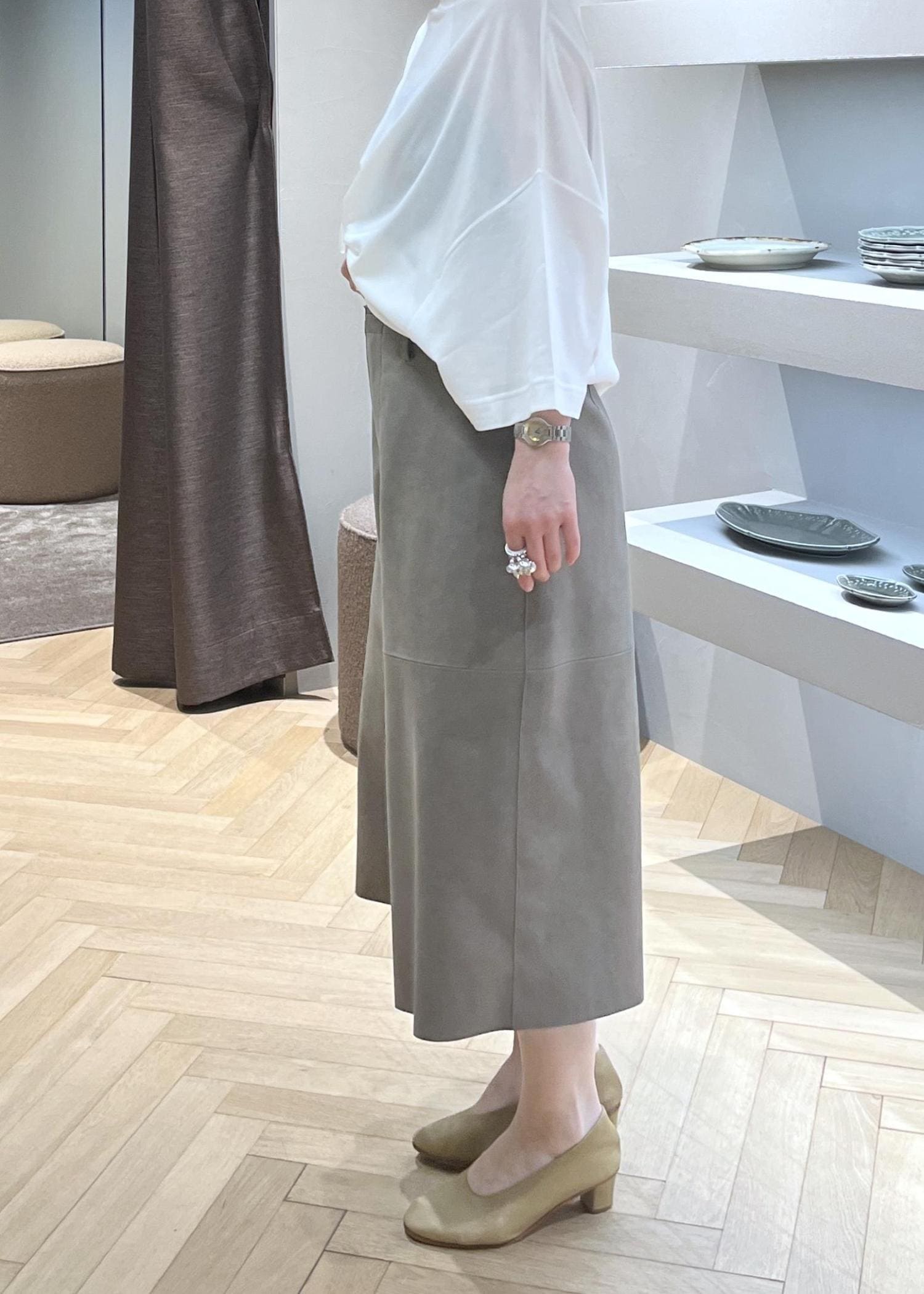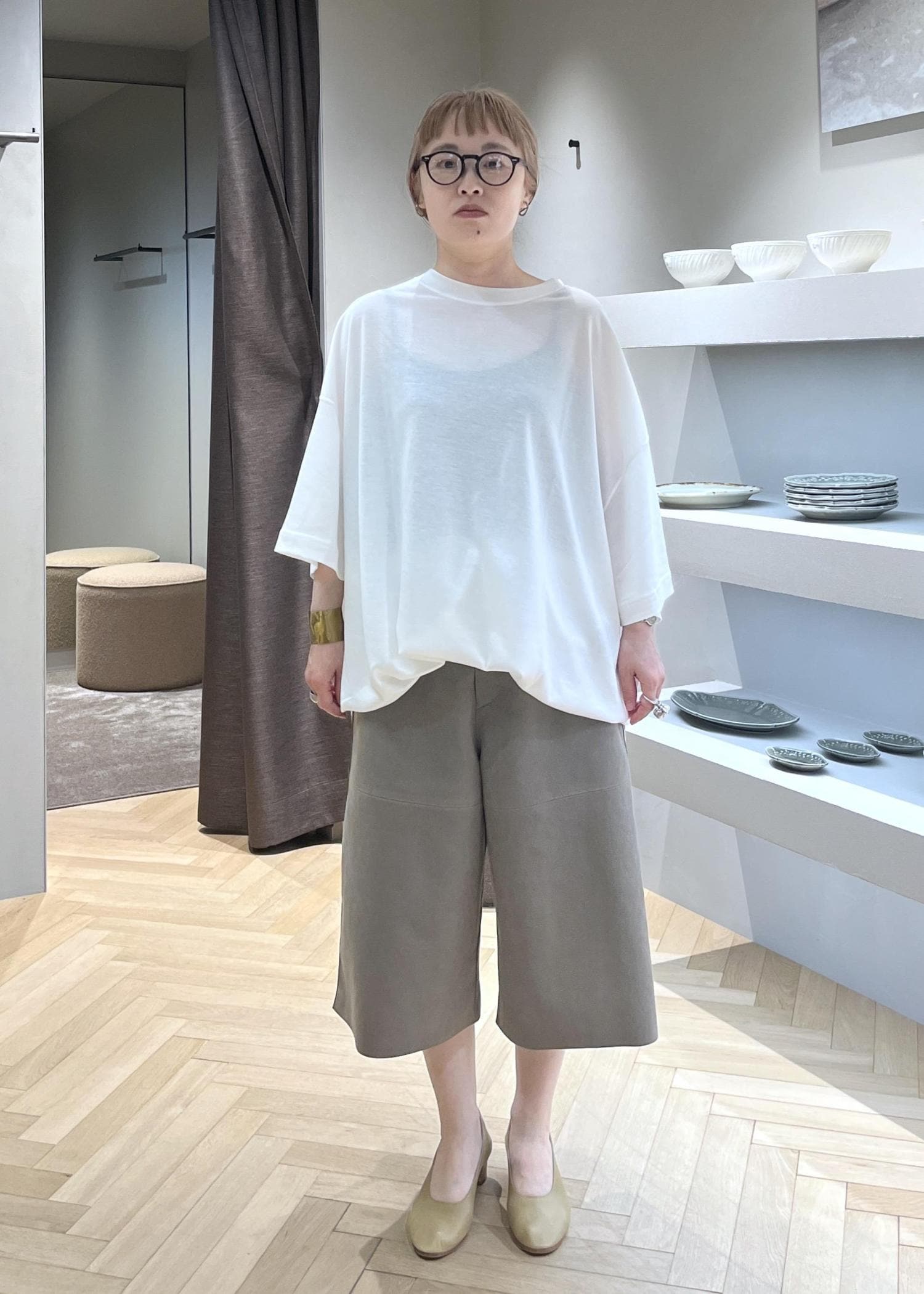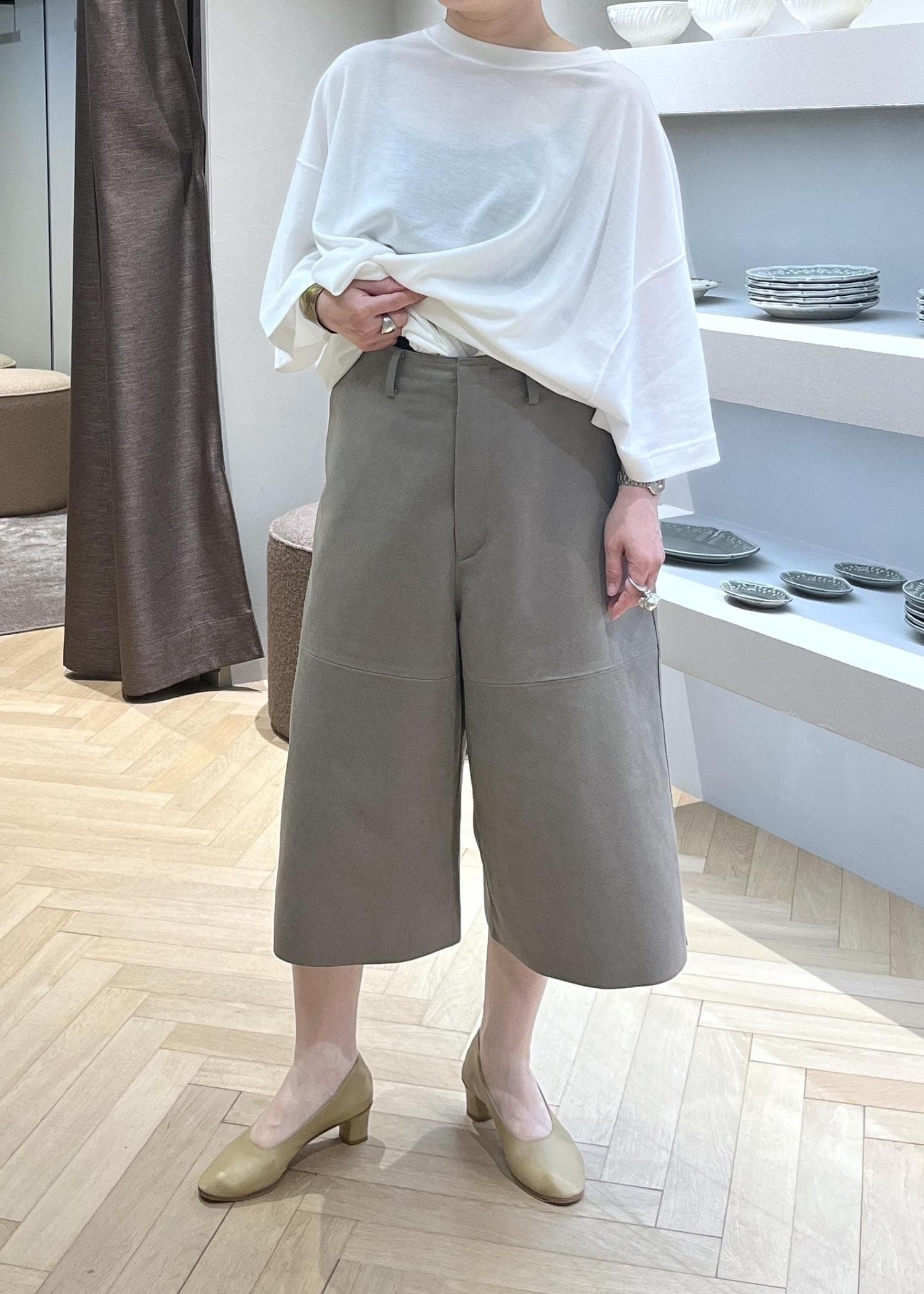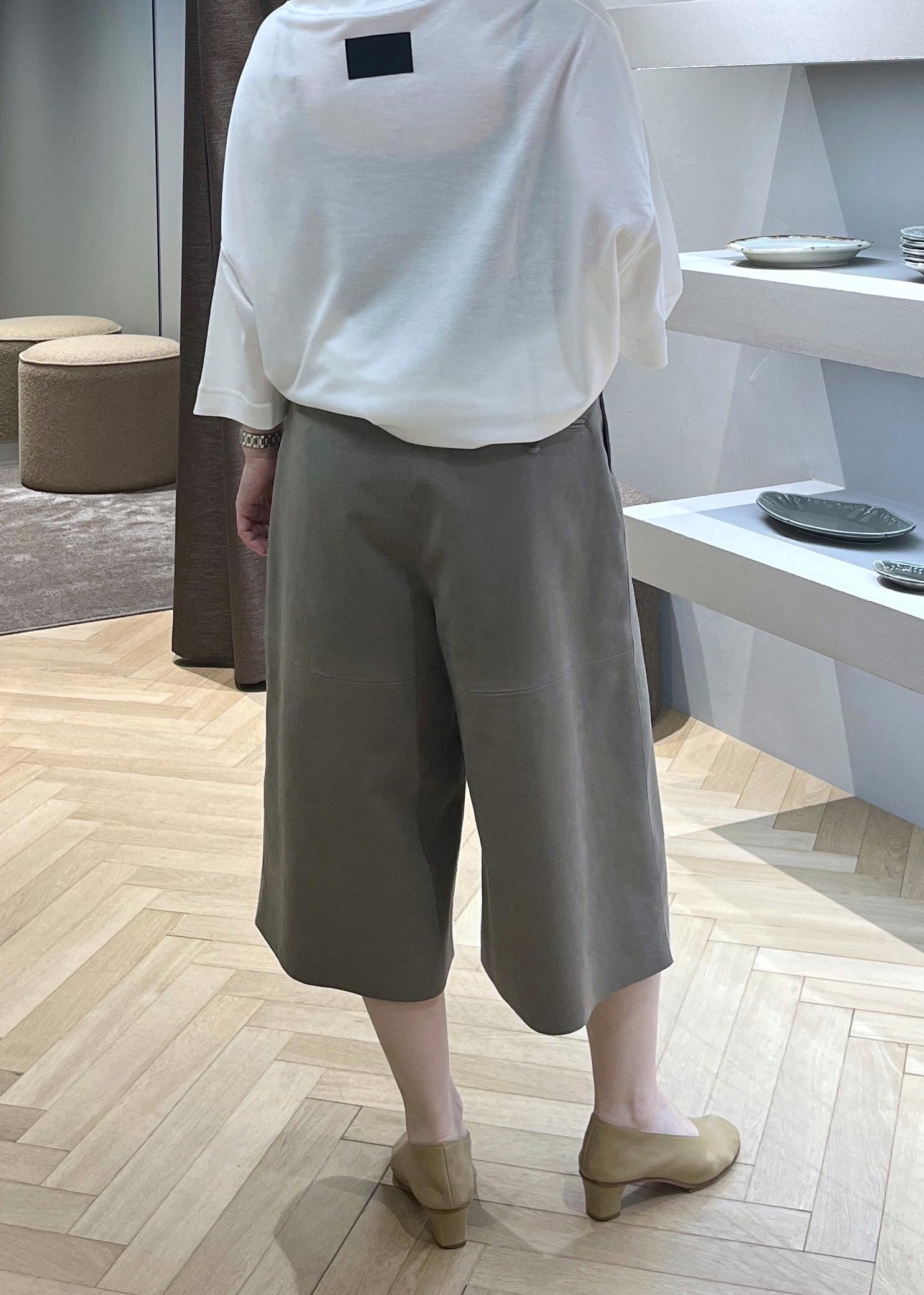 裾に向かってやや広がるキュロットやスカートに近い形。