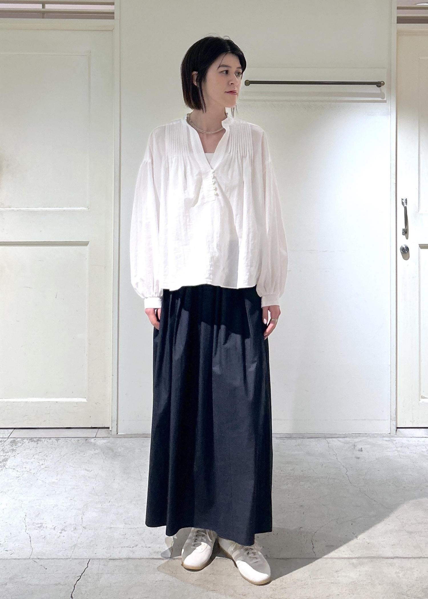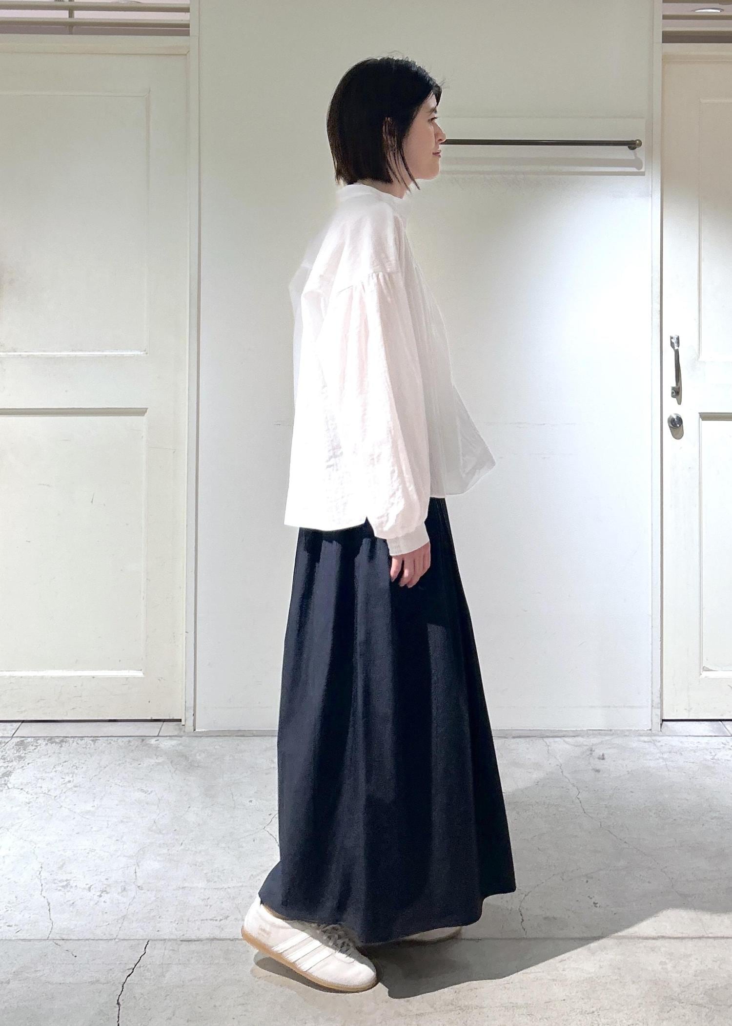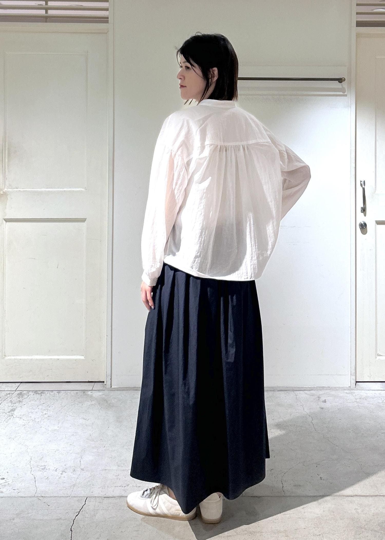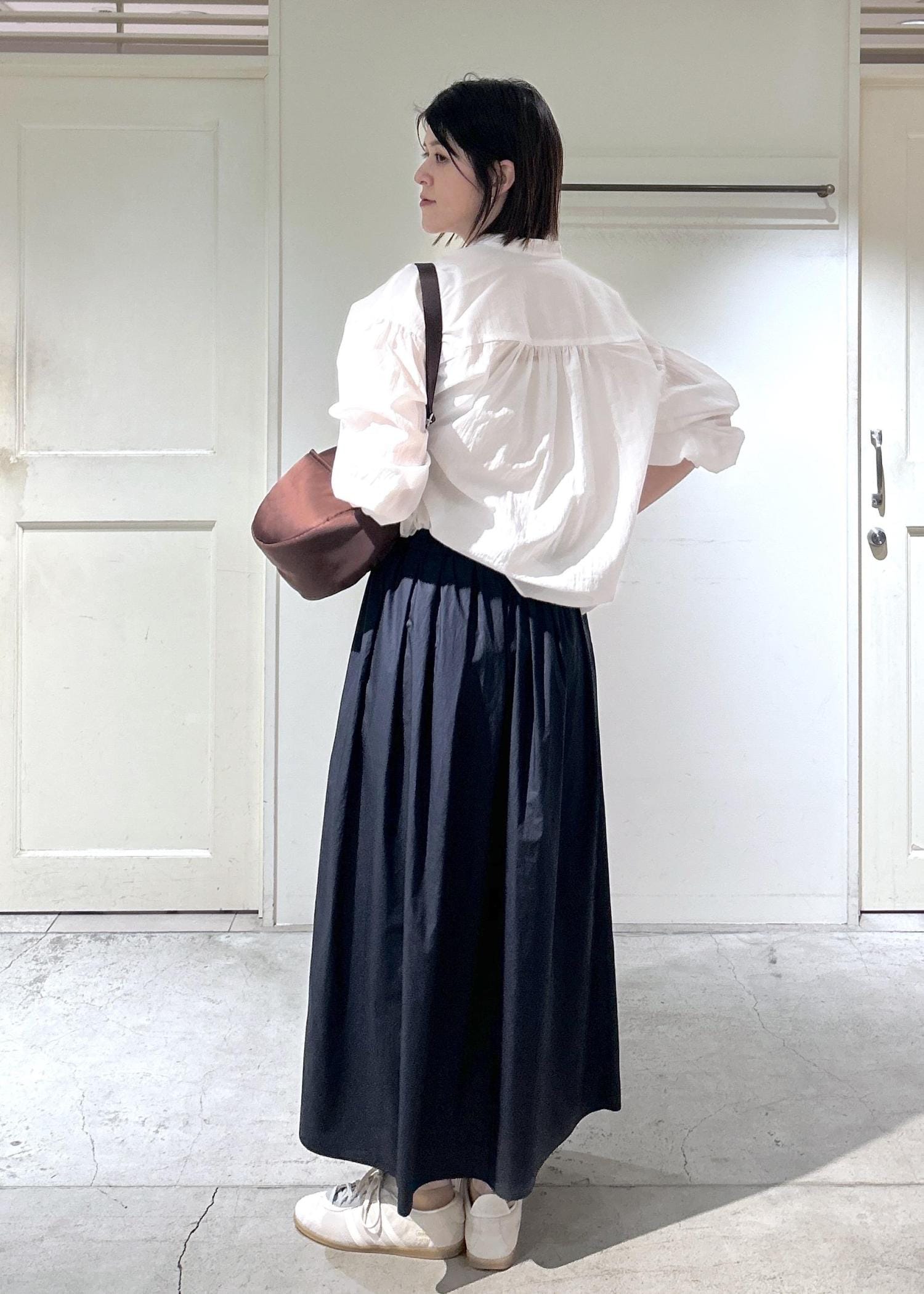 リネン素材のスキッパーブラウスとネイビーのスカートを合わせてみました。スカートは甘くなりすぎないハリのある素材なのでカジュアルにも着こなせます。