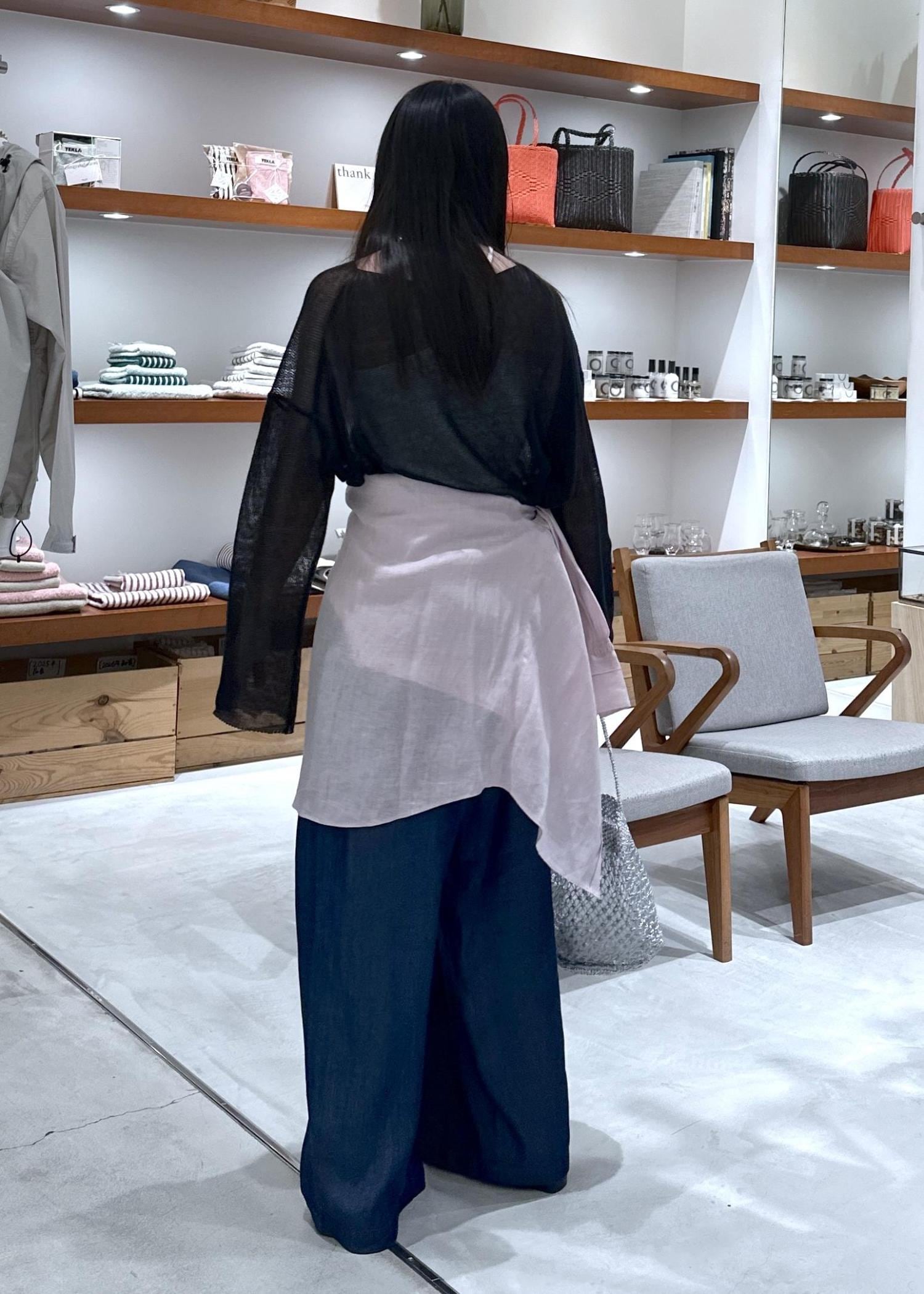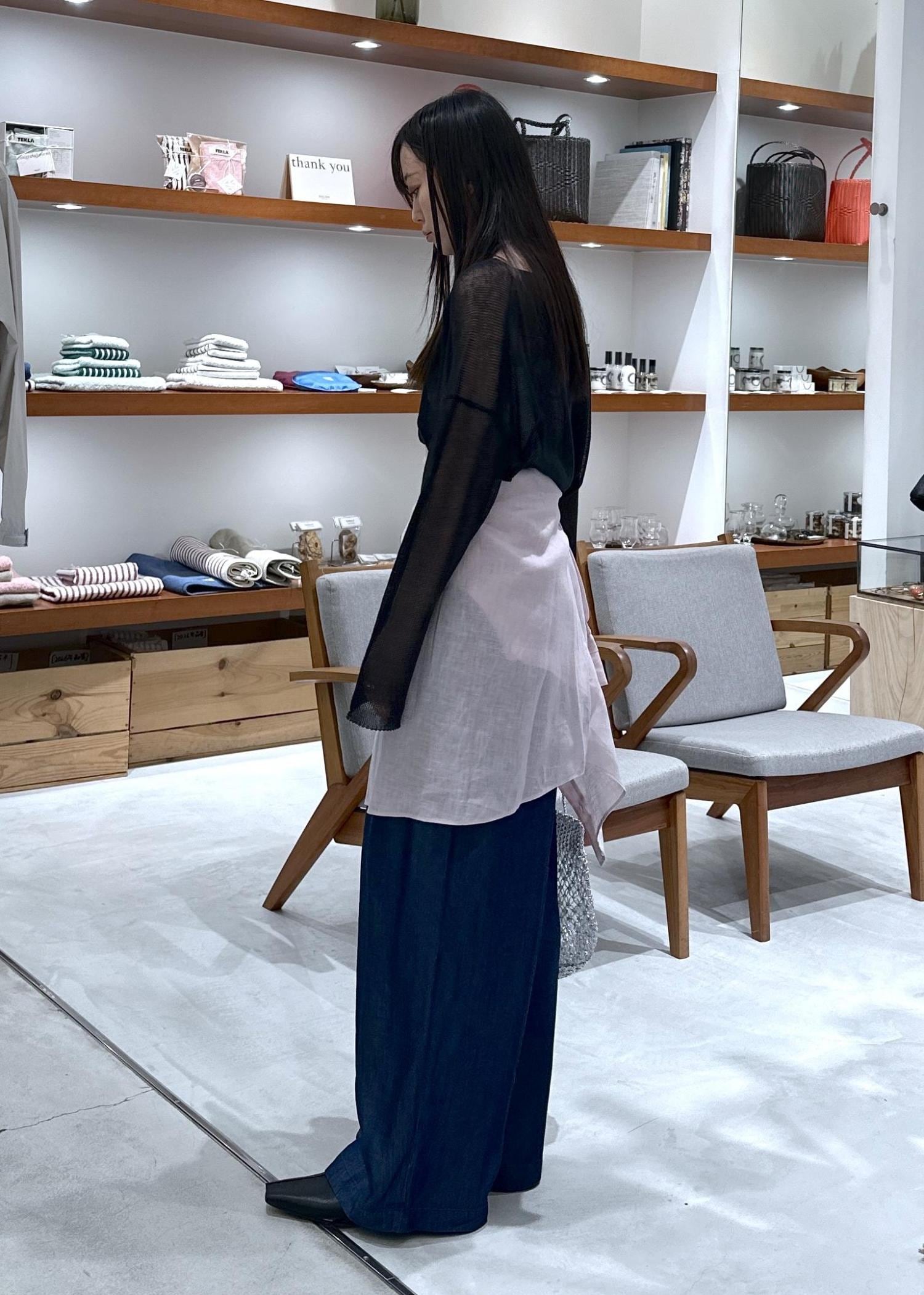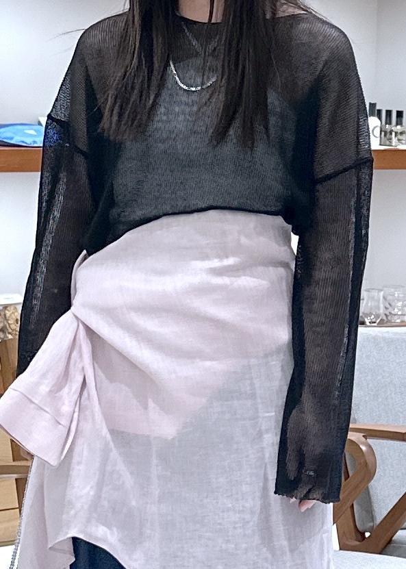 ほんのり透け感のある素材とボートネックのラインが抜け感を出してくれます。