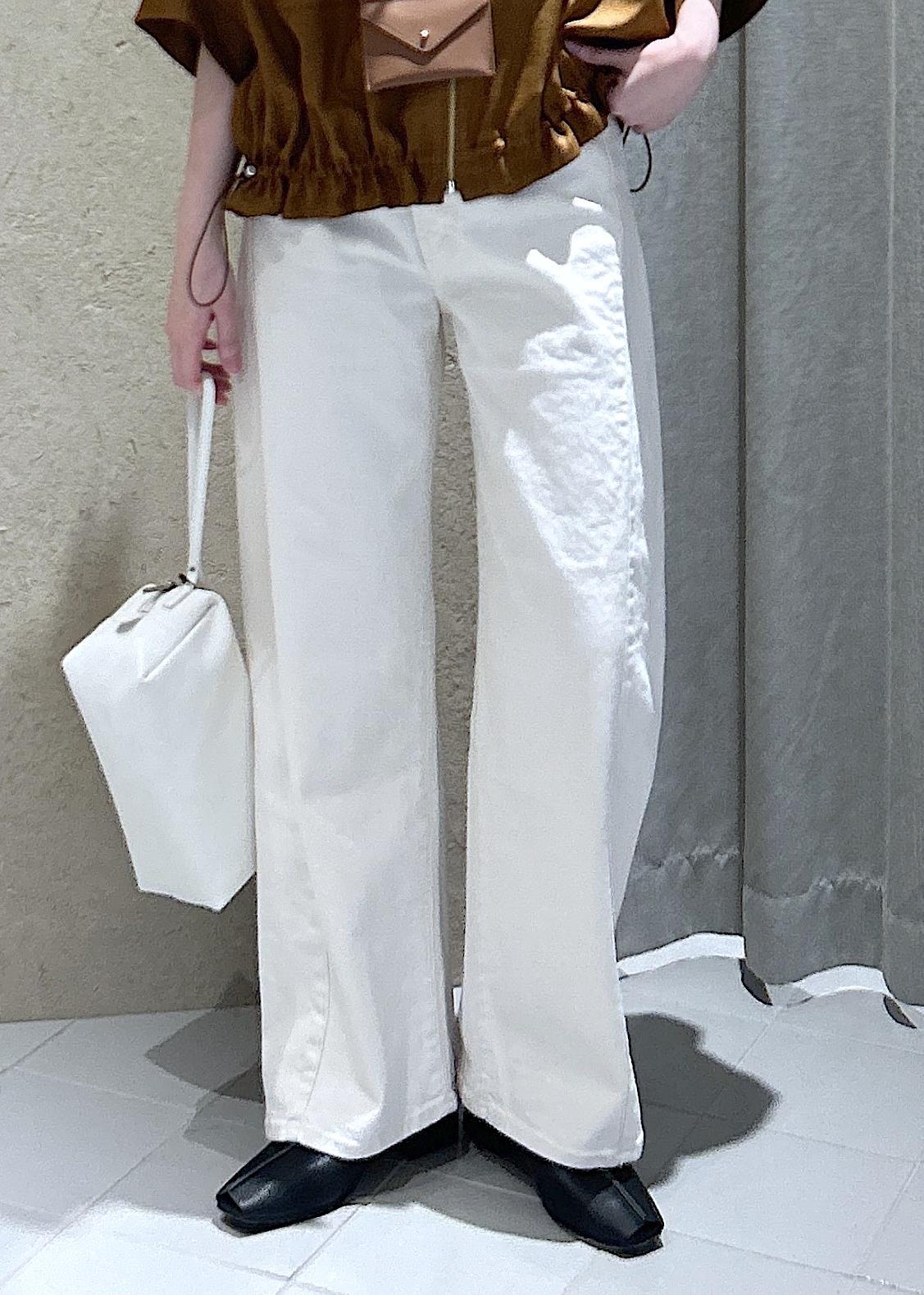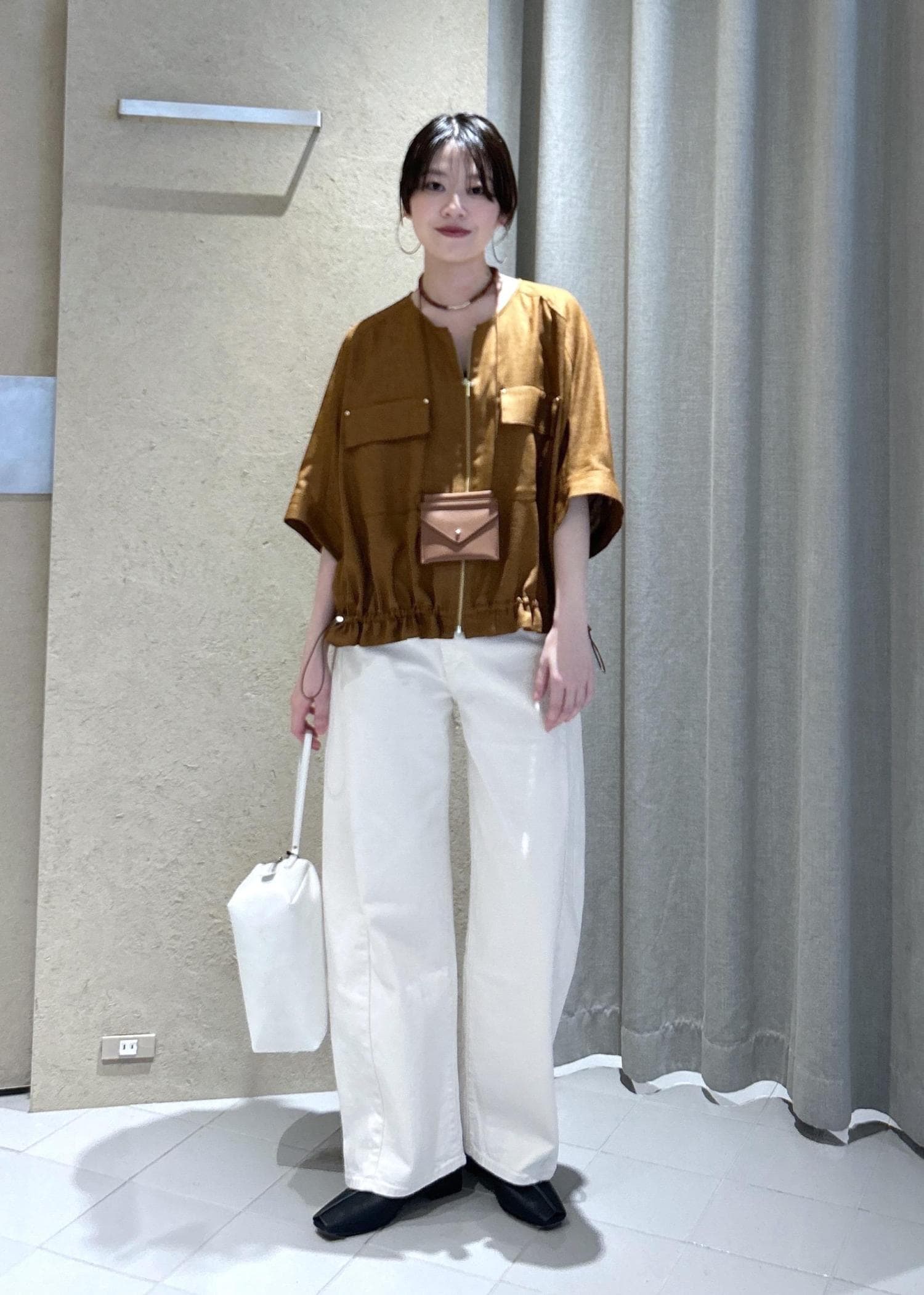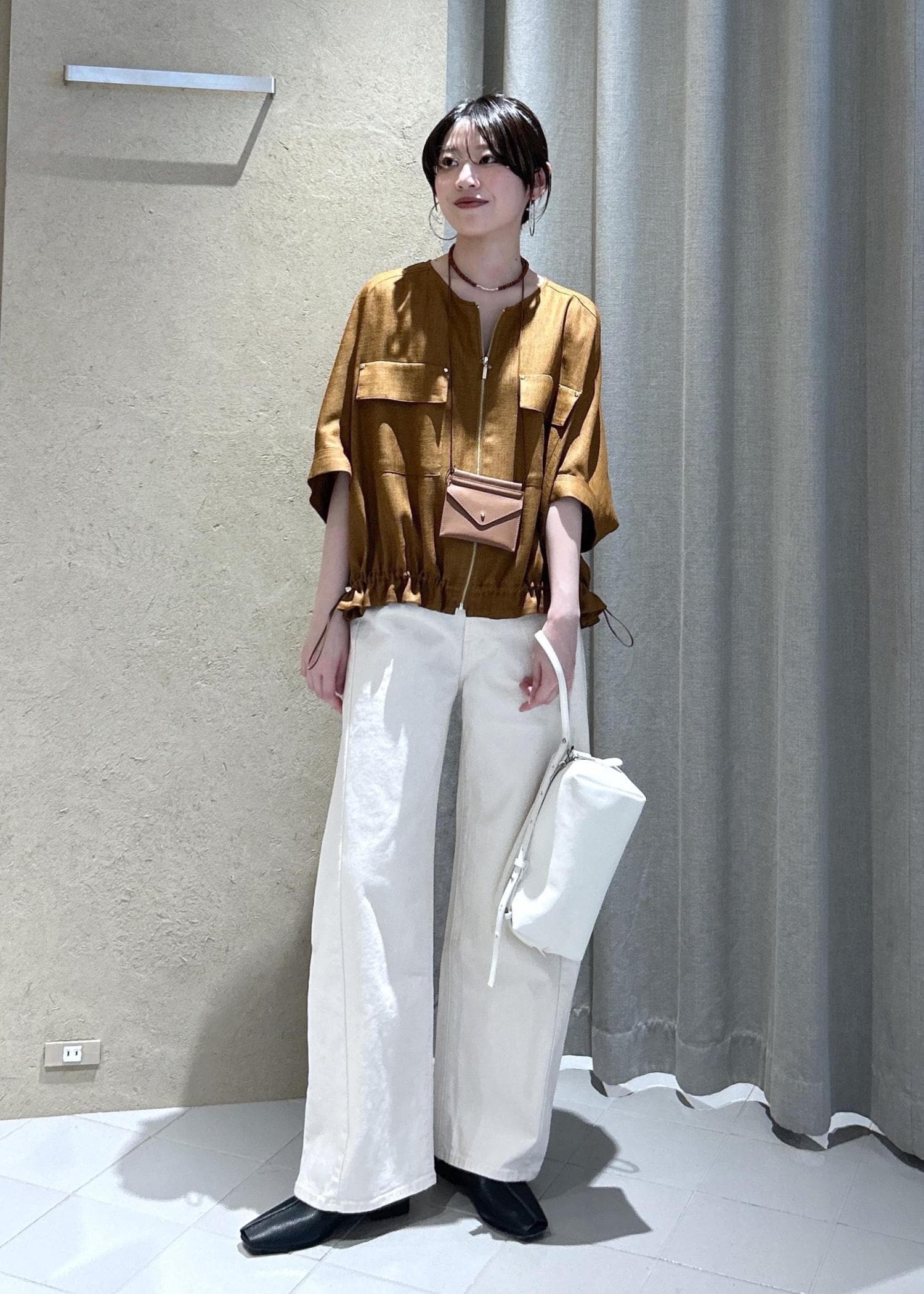 オレンジみのある明るいブラウンカラーをポイントに、ホワイトデニム合わせで爽やかなスタイリングにまとめました。