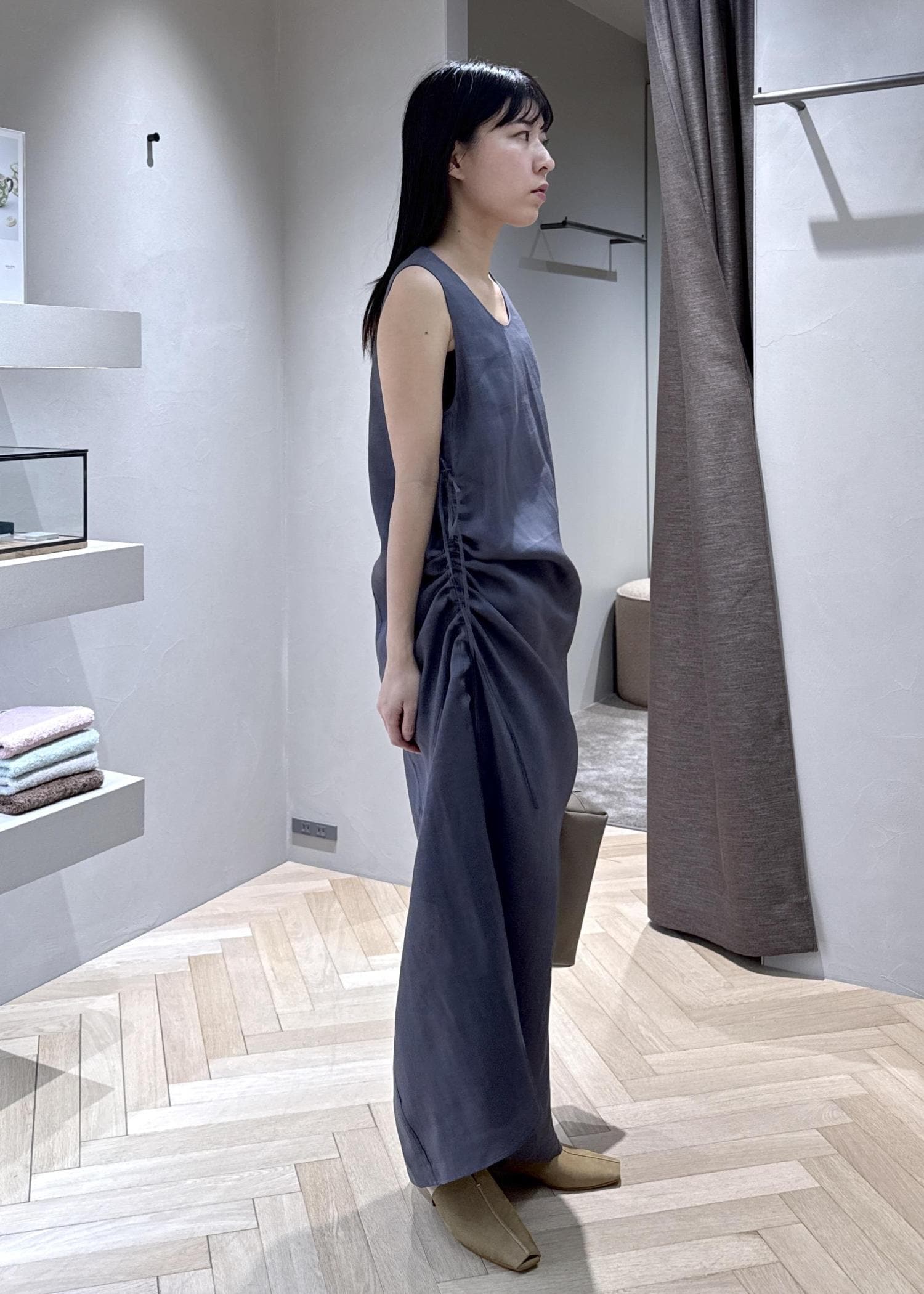 サイドに紐がついていて、お好みの長さで絞れるようになっています。低身長の方でも着ていただけそうです。