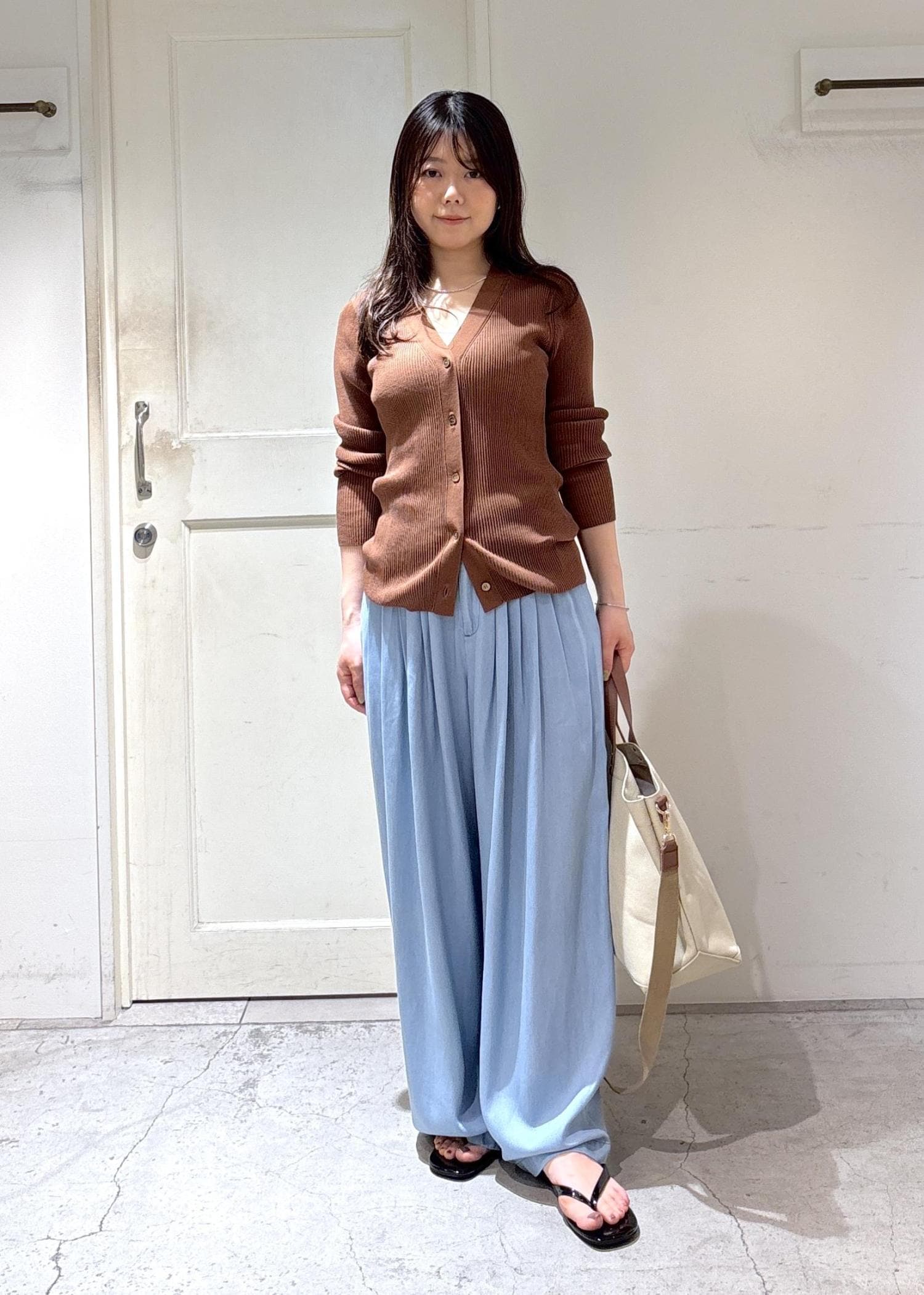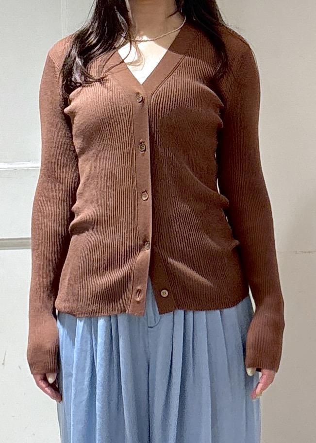 SALON adam et ropé【WEB限定】シアーリブニットVネックカーディガンブラウン / F¥15,840レビュー丈は腰の下あたり、薄手で柔らかなコットンナイロン素材で程よくフィット感があります。
